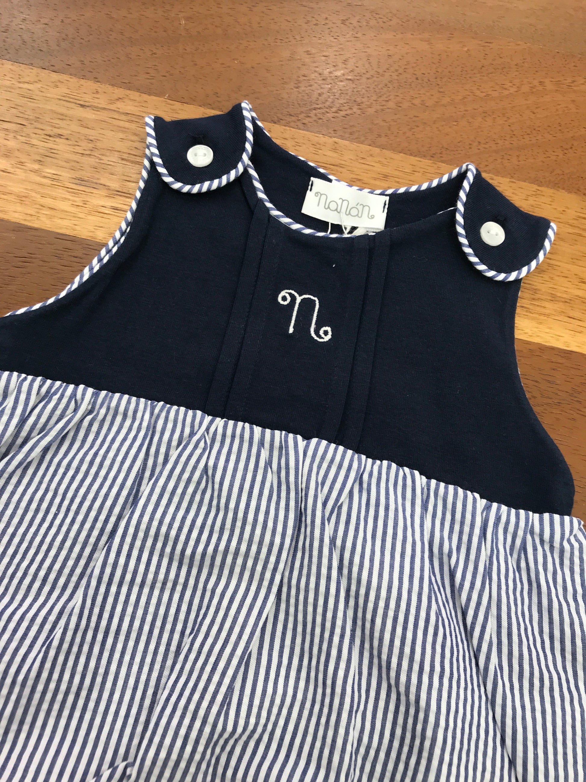 Pagliaccetto Nanan in cotone corpetto blu scuro il sotto a righe bianche e blu