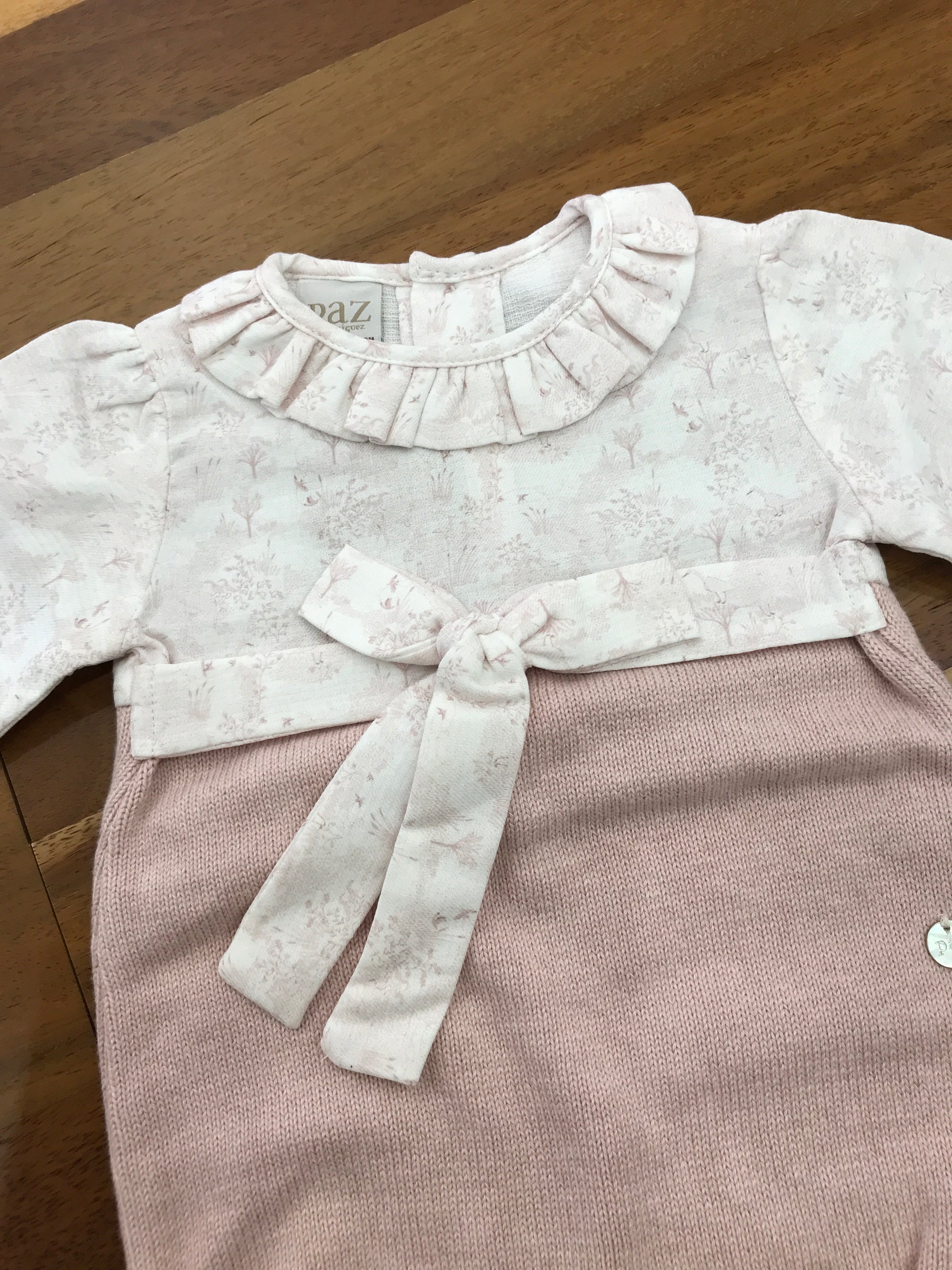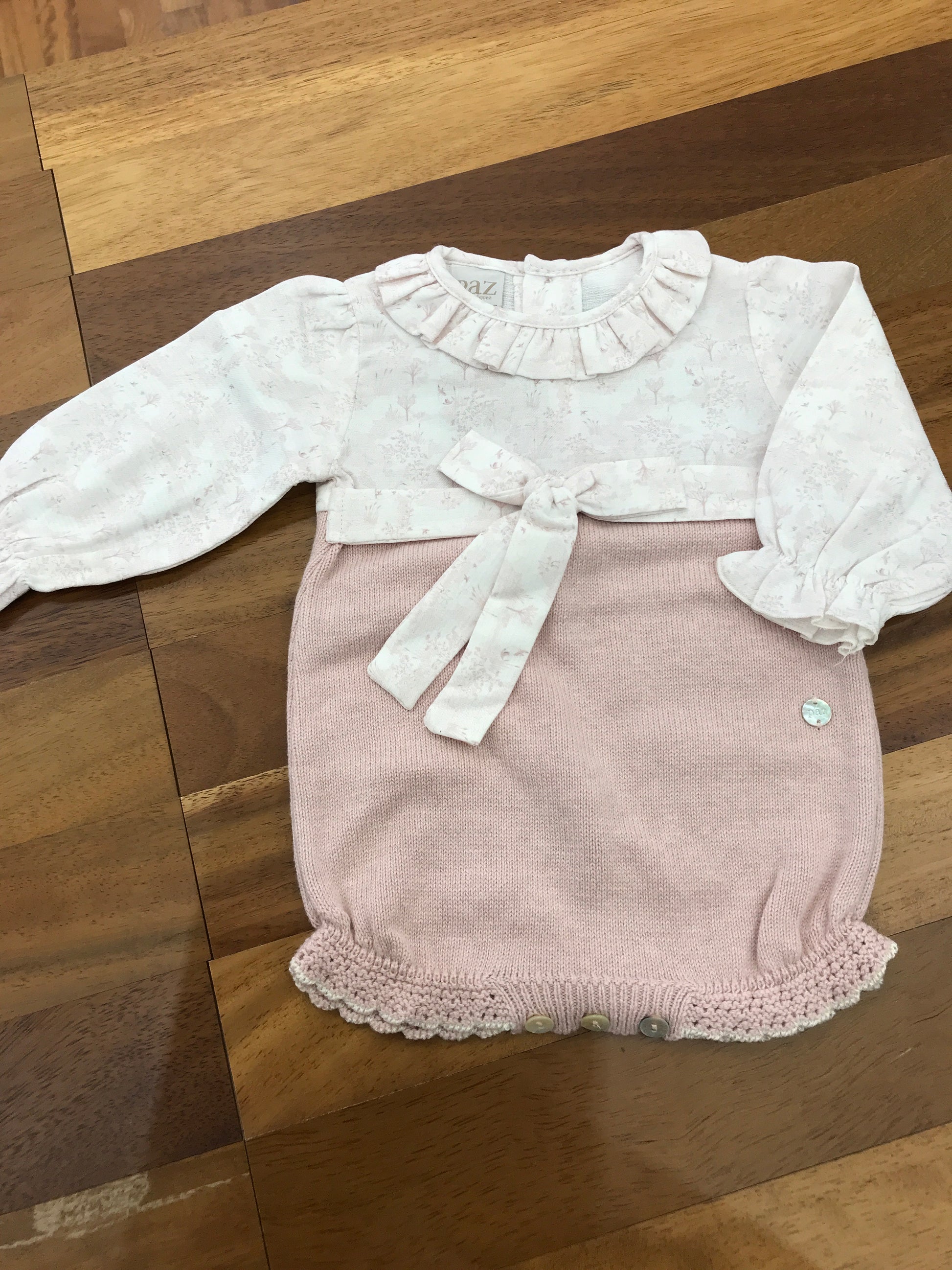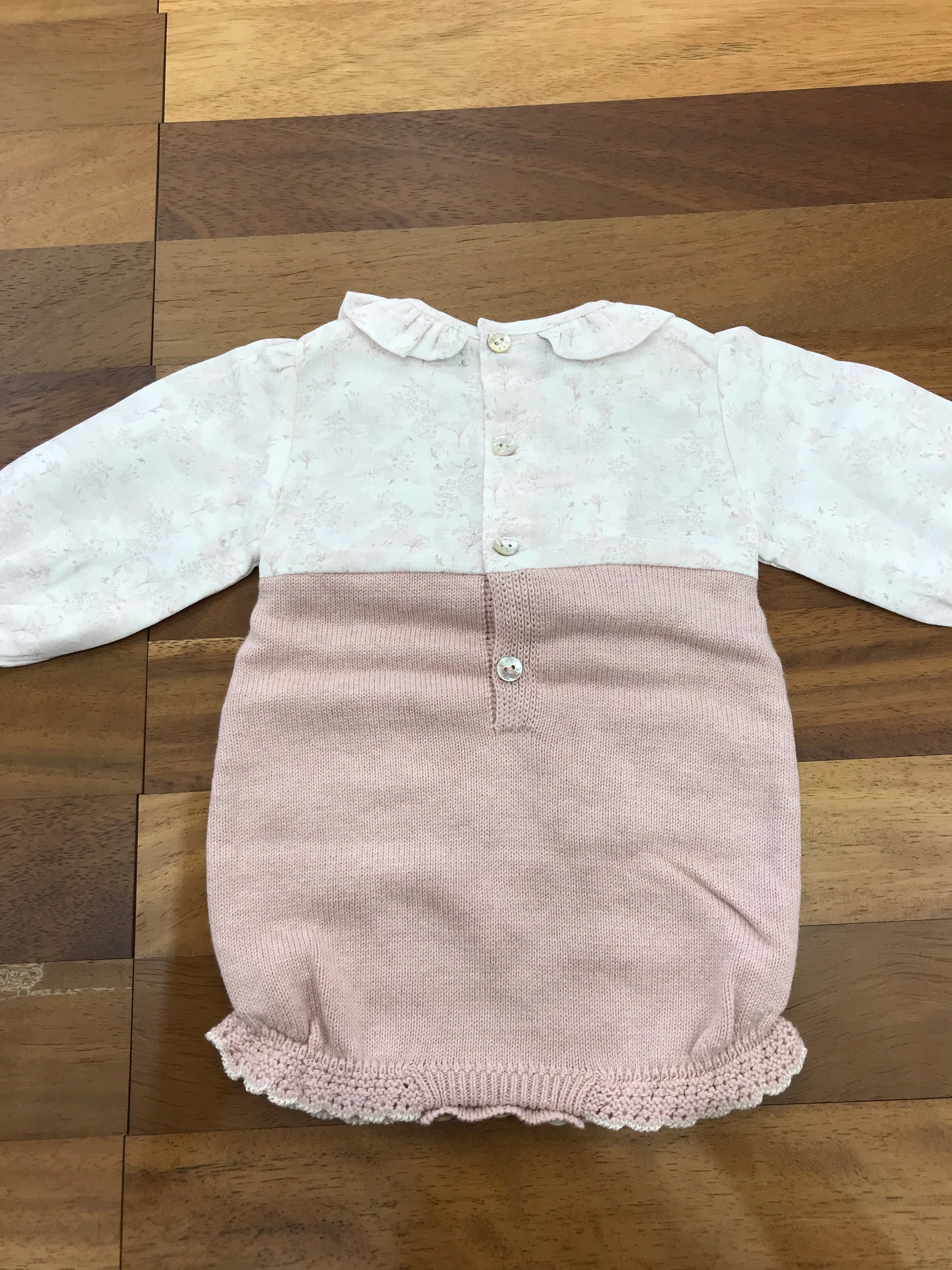 Questo pagliaccetto in lana color rosa antico presenta una parte superiore arricchita da piccoli fiori decorativi, con ruches eleganti sul colletto e sulle maniche. Le maniche si chiudono con un elastico e un delicato fiocchetto completa il design superiore.