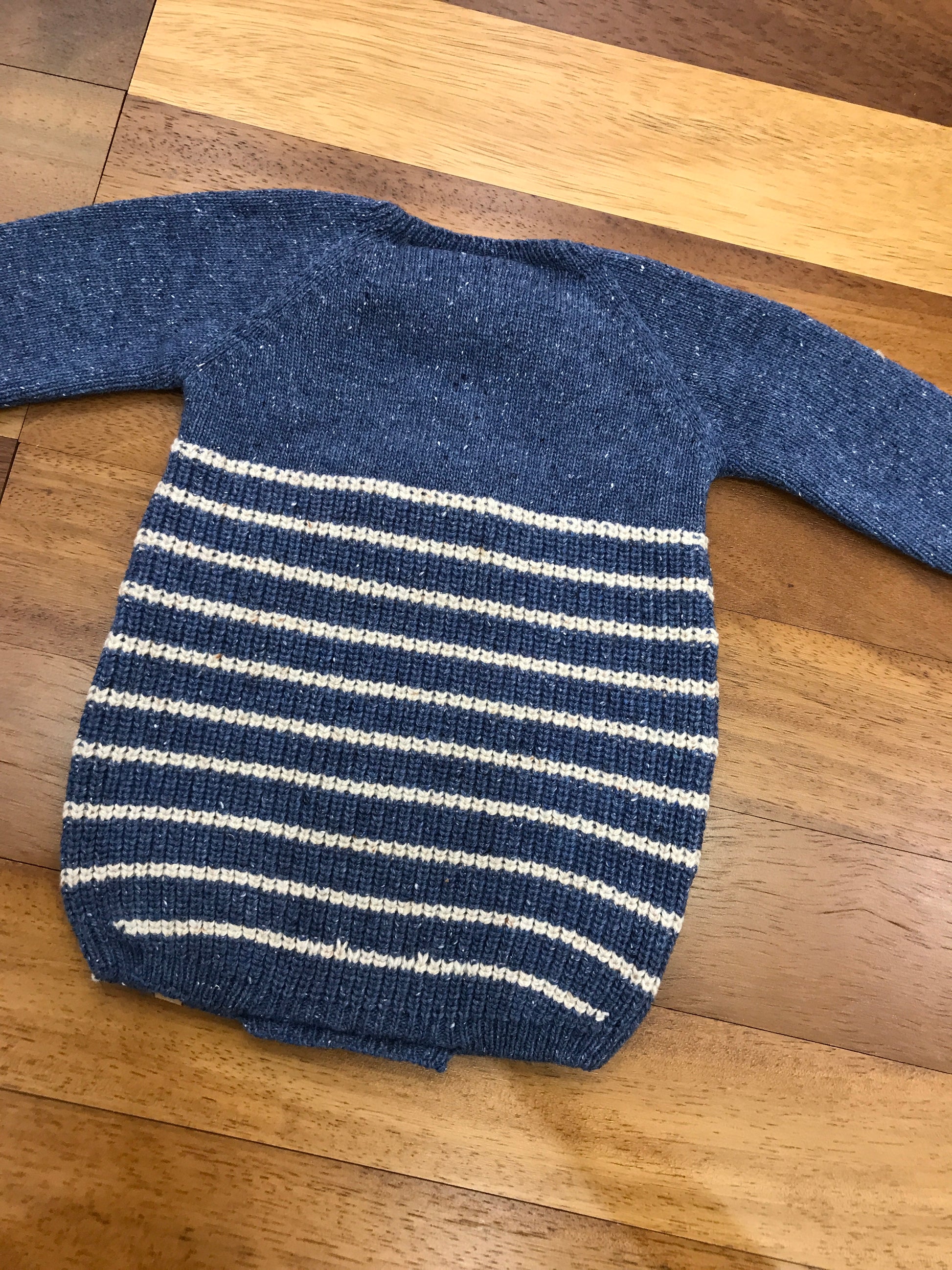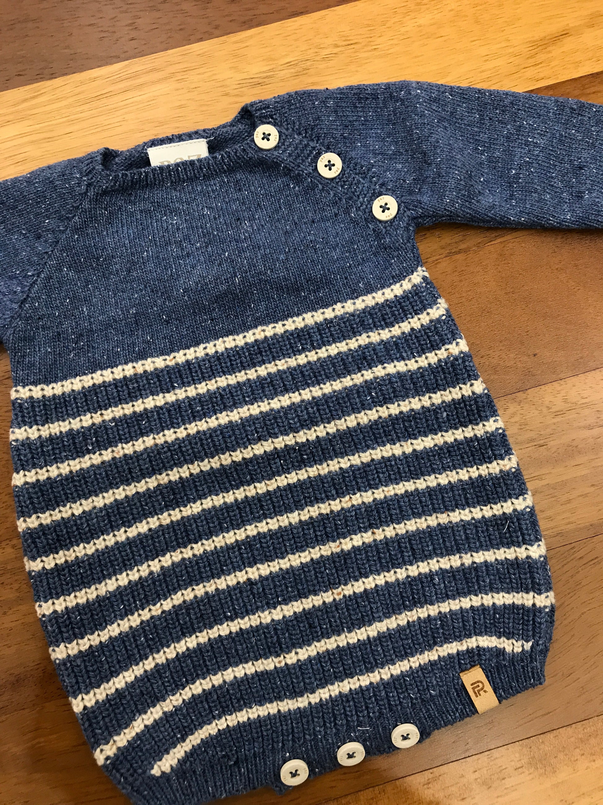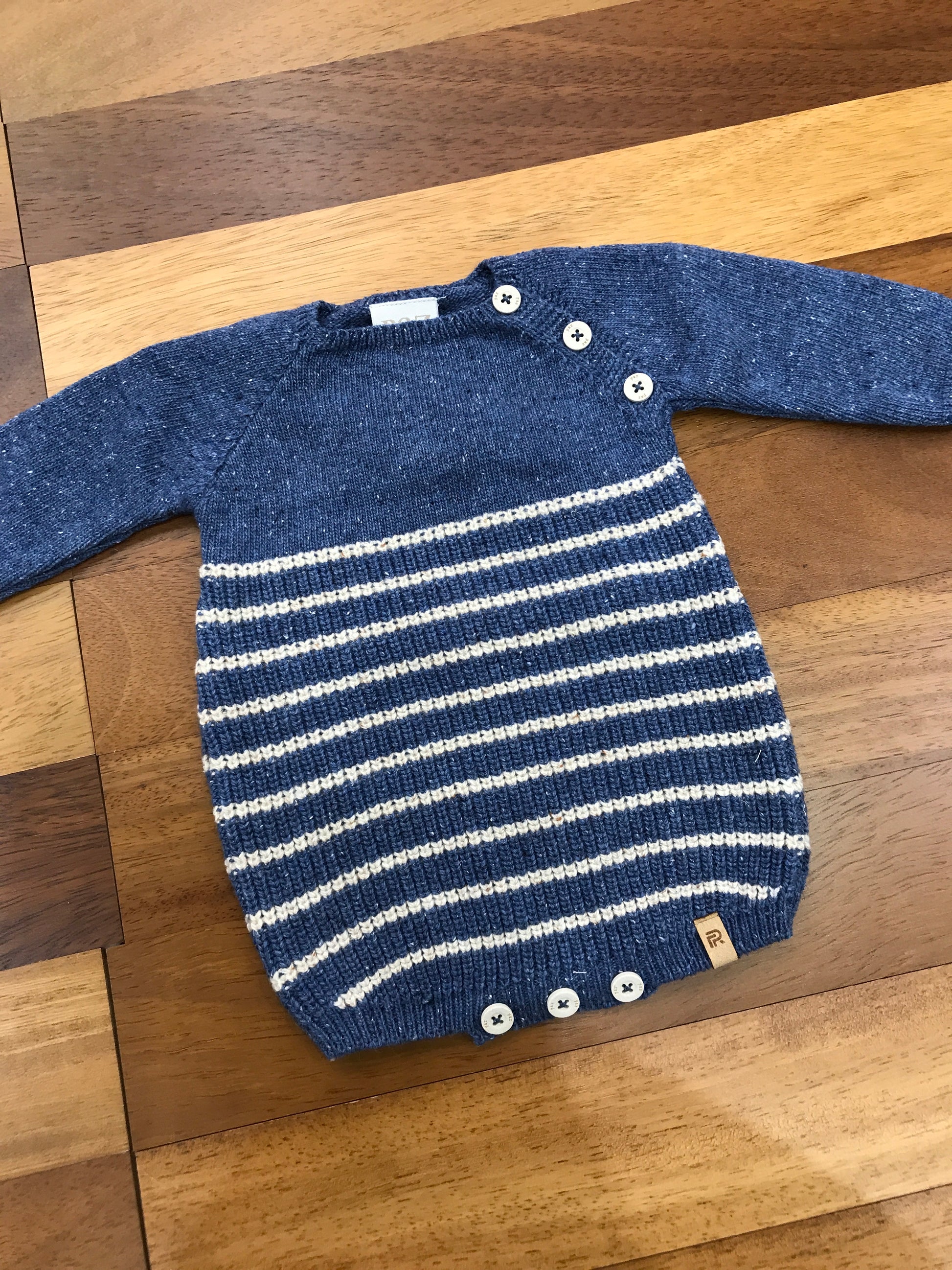 Pagliaccetto in lana privo di colletto, caratterizzato da righe tortora e dotato di bottoncini laterali sulle spalle e sotto per una chiusura pratica e sicura.