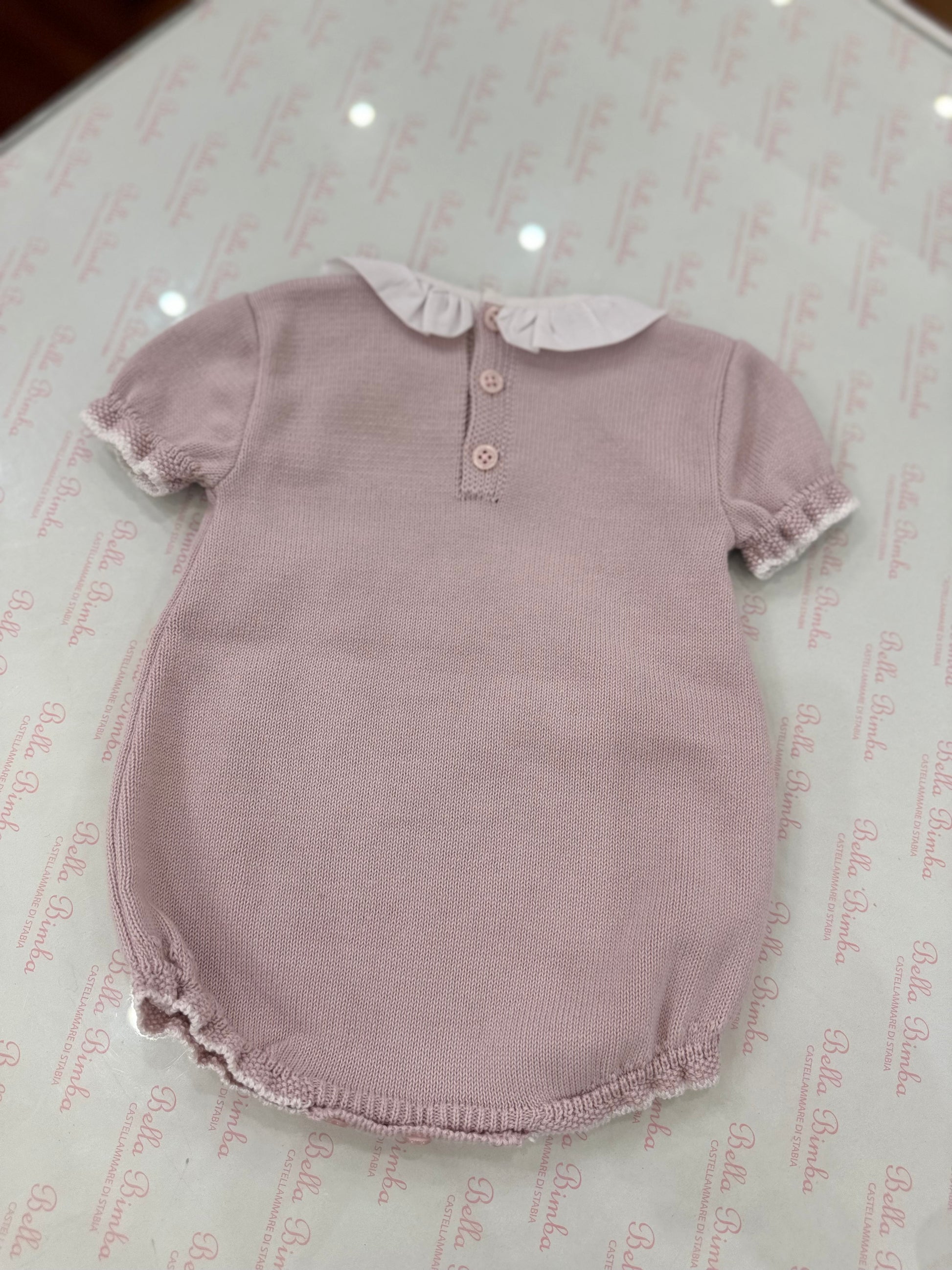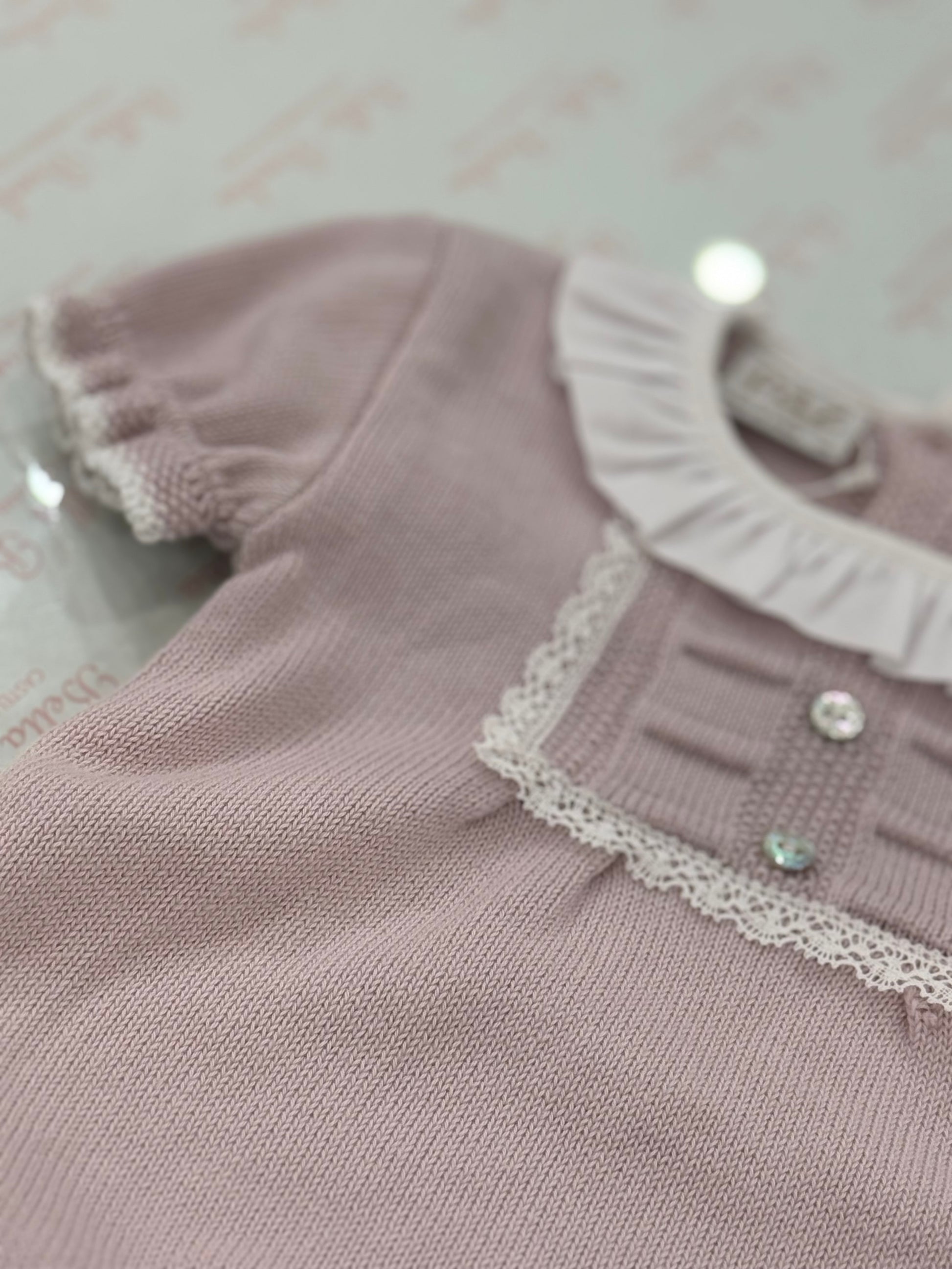 Questo pagliaccetto in filo di cotone glicine è perfetto per le mamme che vogliono un colore delicato ma non il rosa. Il suo collo con rouche e il pizzo sul davanti donano un tocco di bellezza senza sacrificare la praticità.