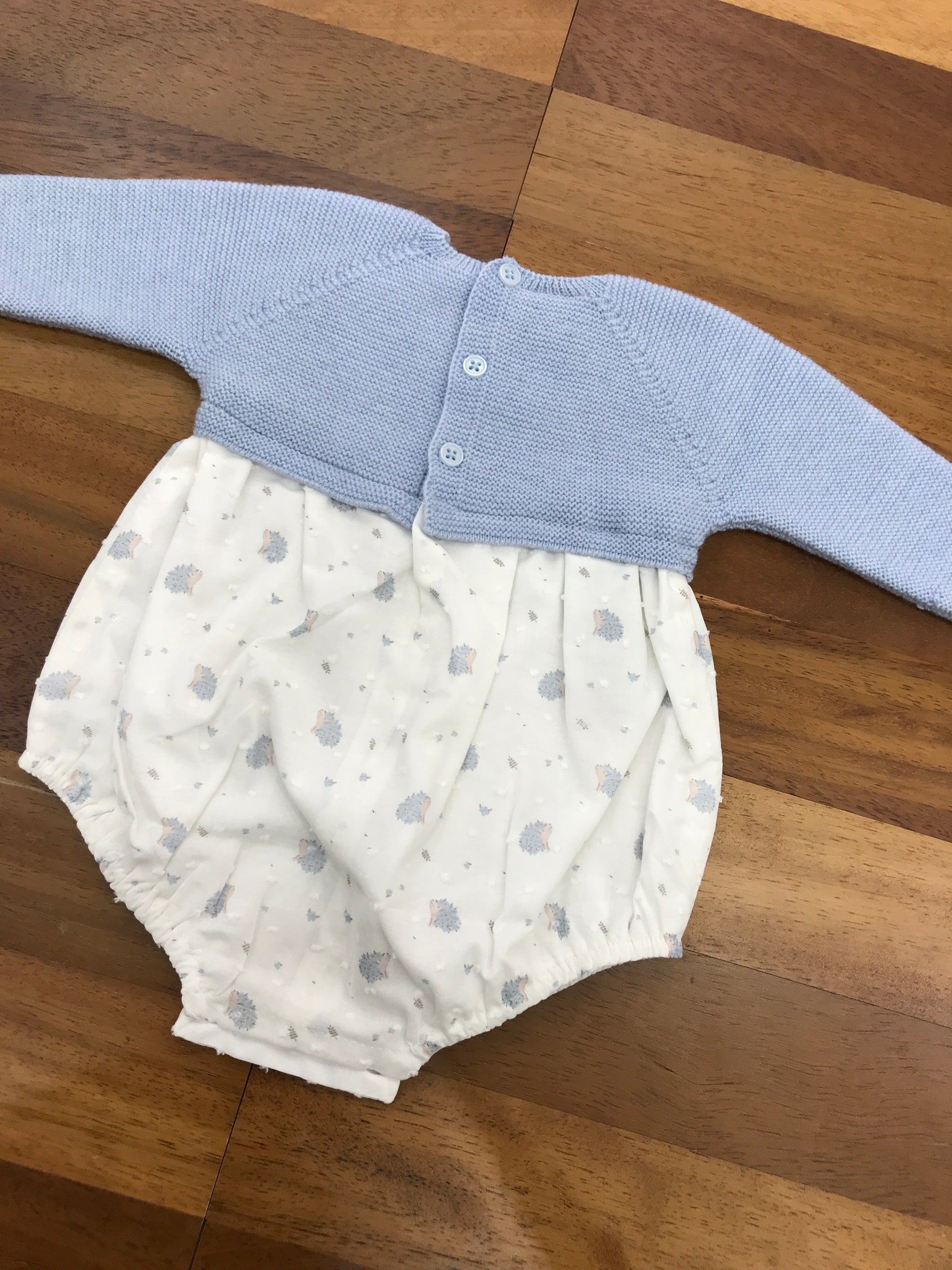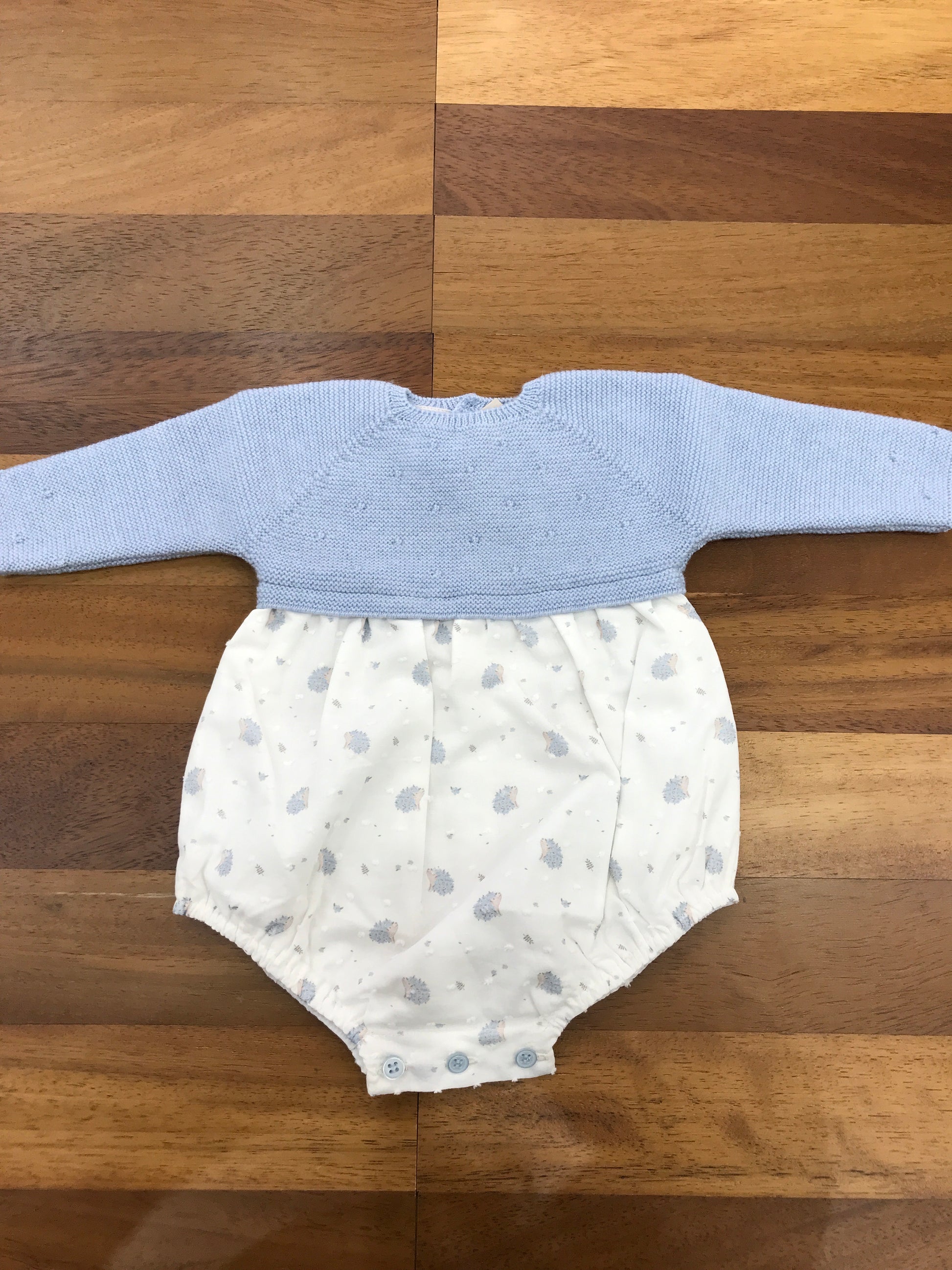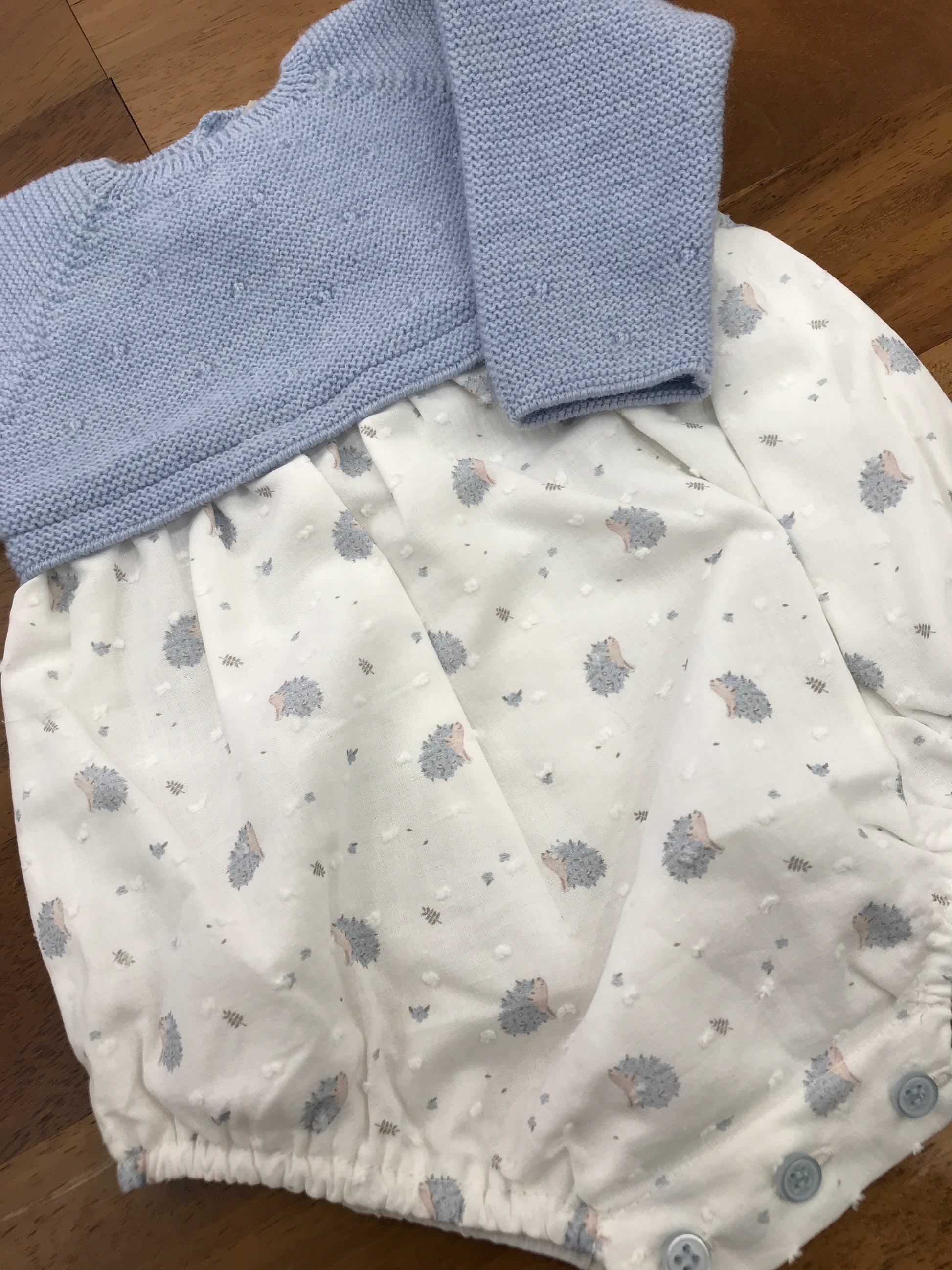 Pagliaccetto in lana con chiusura a bottoncini, decorato sul davanti da un ricamo tono su tono a pois e impreziosito da un dettaglio a forma di porcospino.