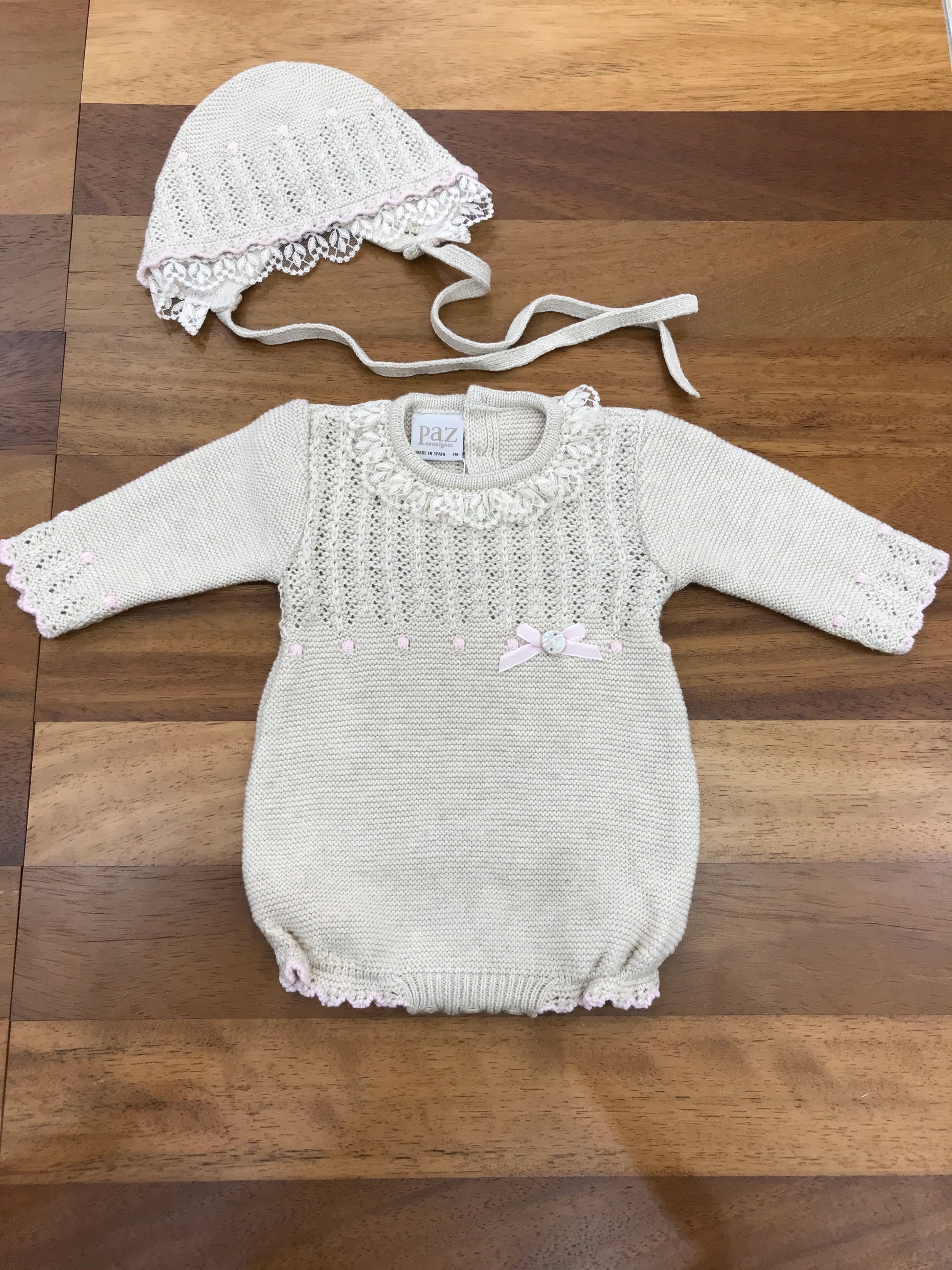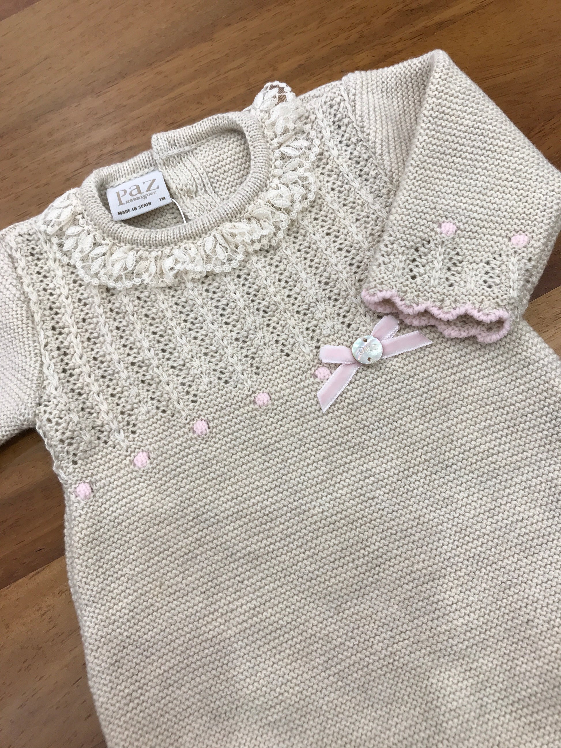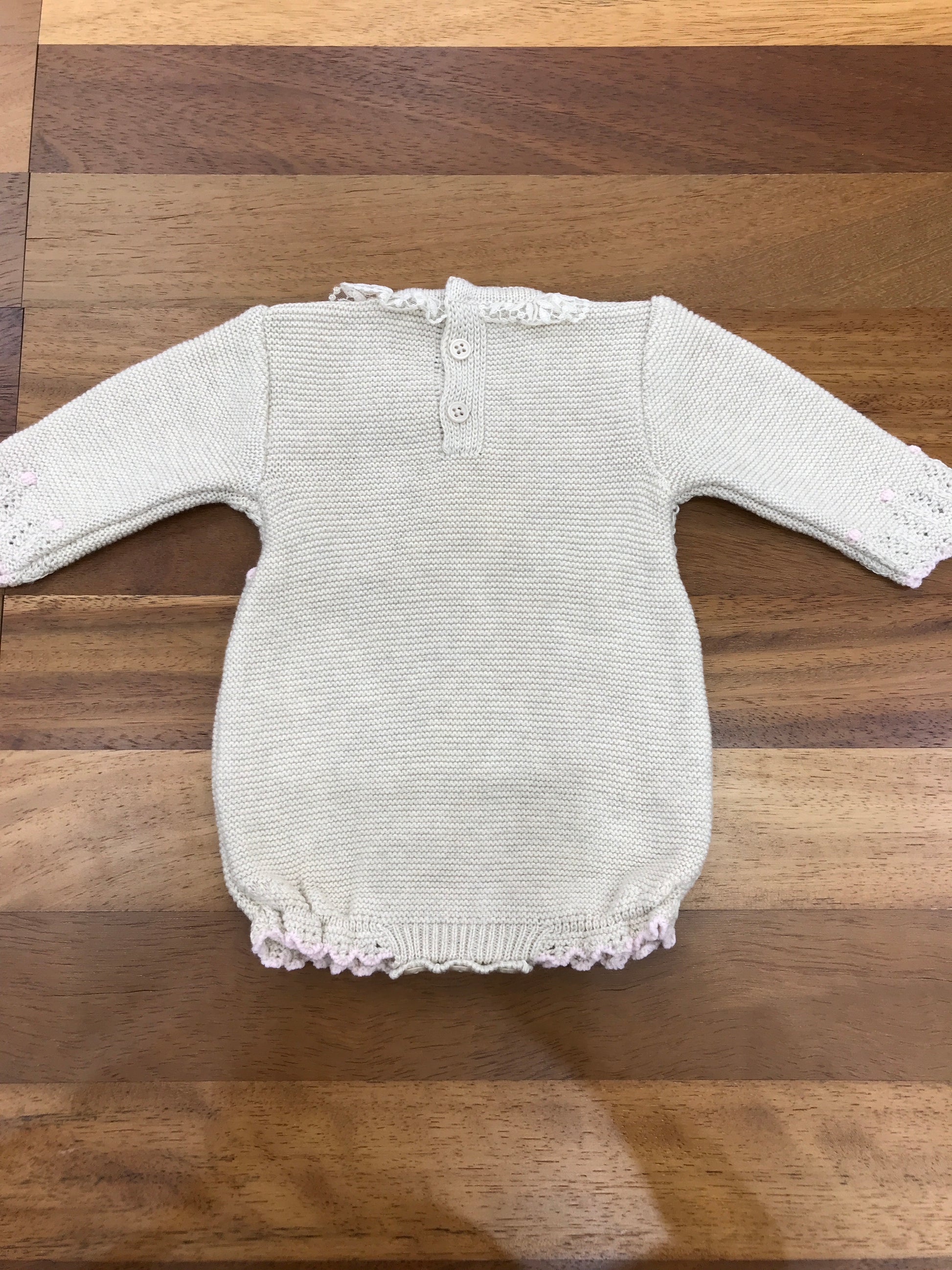Questo pagliaccetto in lana presenta una chiusura con bottoncini sul davanti, un delicato lavoro a maglia traforato e un colletto ricamato. Il capo è arricchito da dettagli rosa che ne esaltano l’eleganza e la raffinatezza.