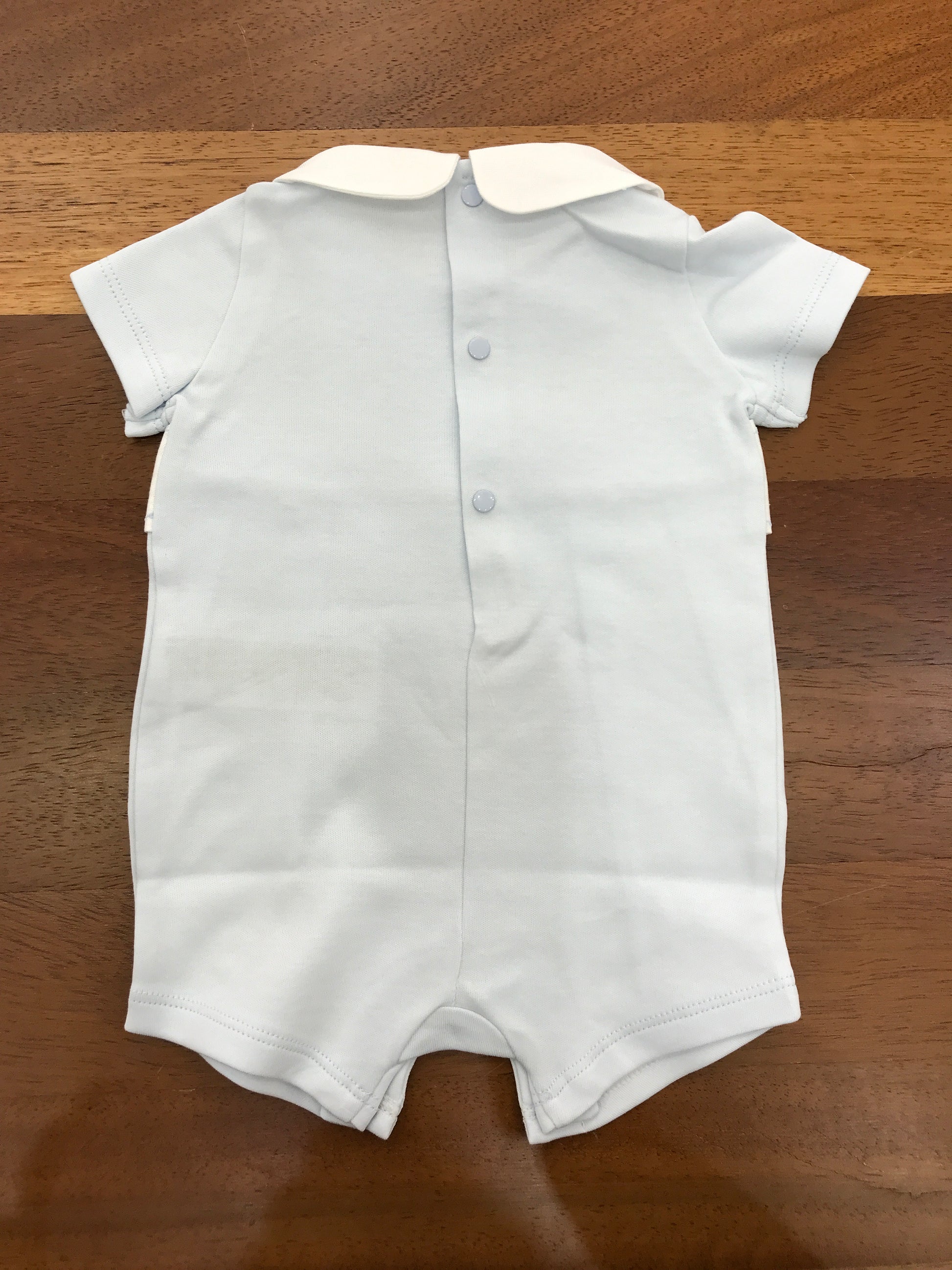 Delicato pagliaccetto in puro cotone celeste con maniche a mezza lunghezza, caratterizzato da un elegante colletto tondo bianco e una raffinata fascia in vita che ne definisce la silhouette. Un capo versatile e confortevole, perfetto per le giornate di transizione, che combina praticità e stile con dettagli ricercati.