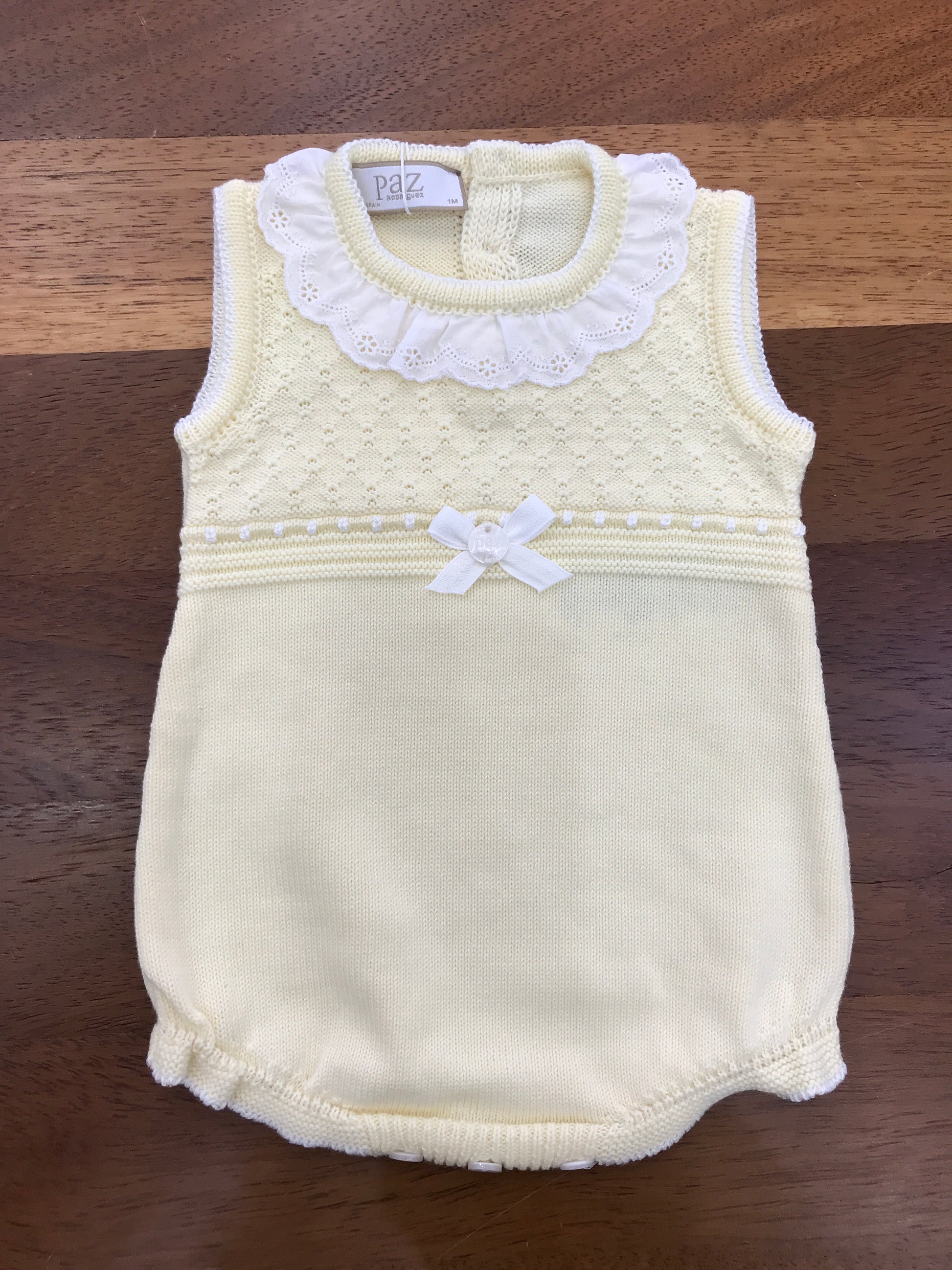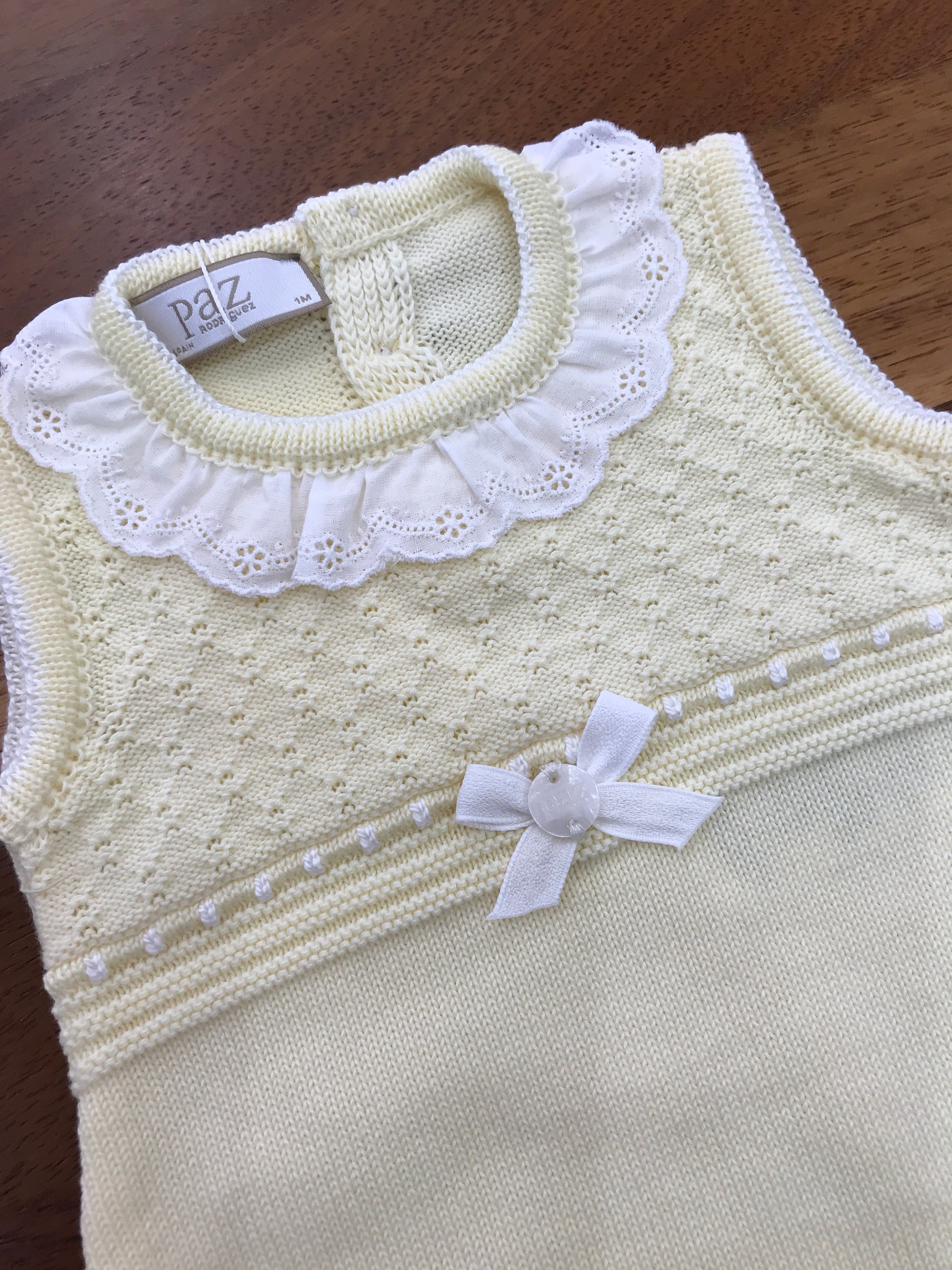 Pagliaccetto Paz Rodriguez in filo giallo con lavorazione a maglia sul petto con collo con rusche smerlata bianca