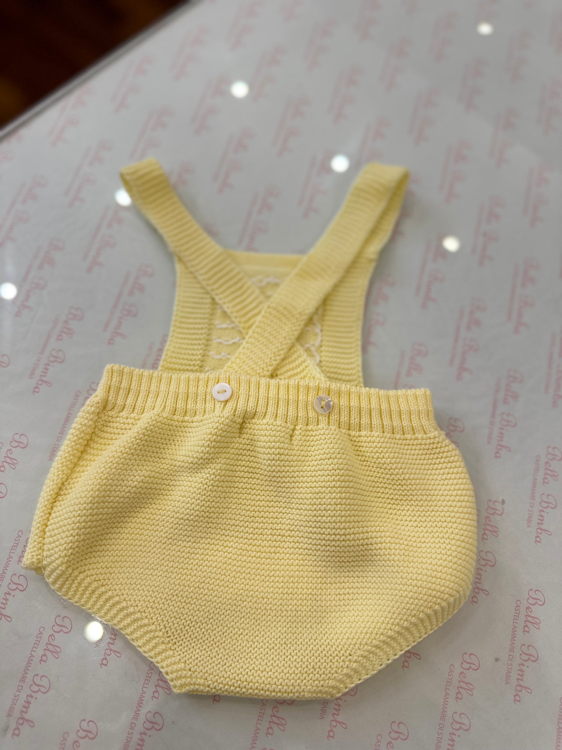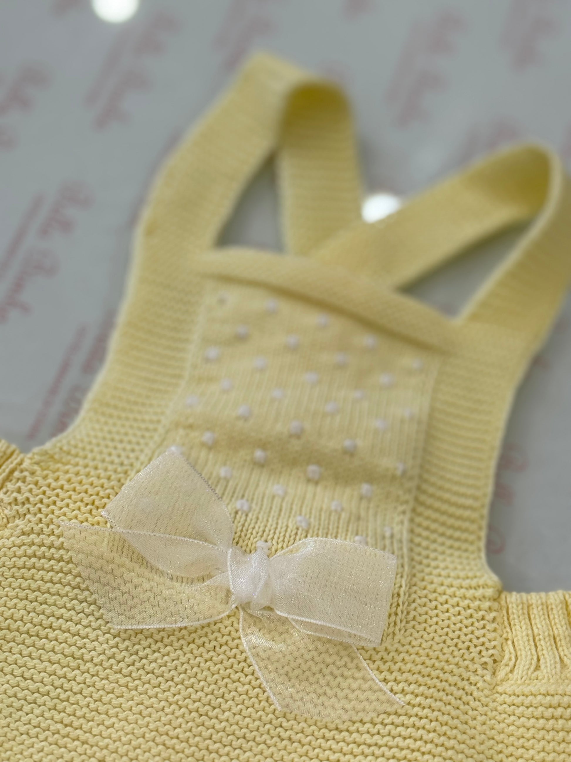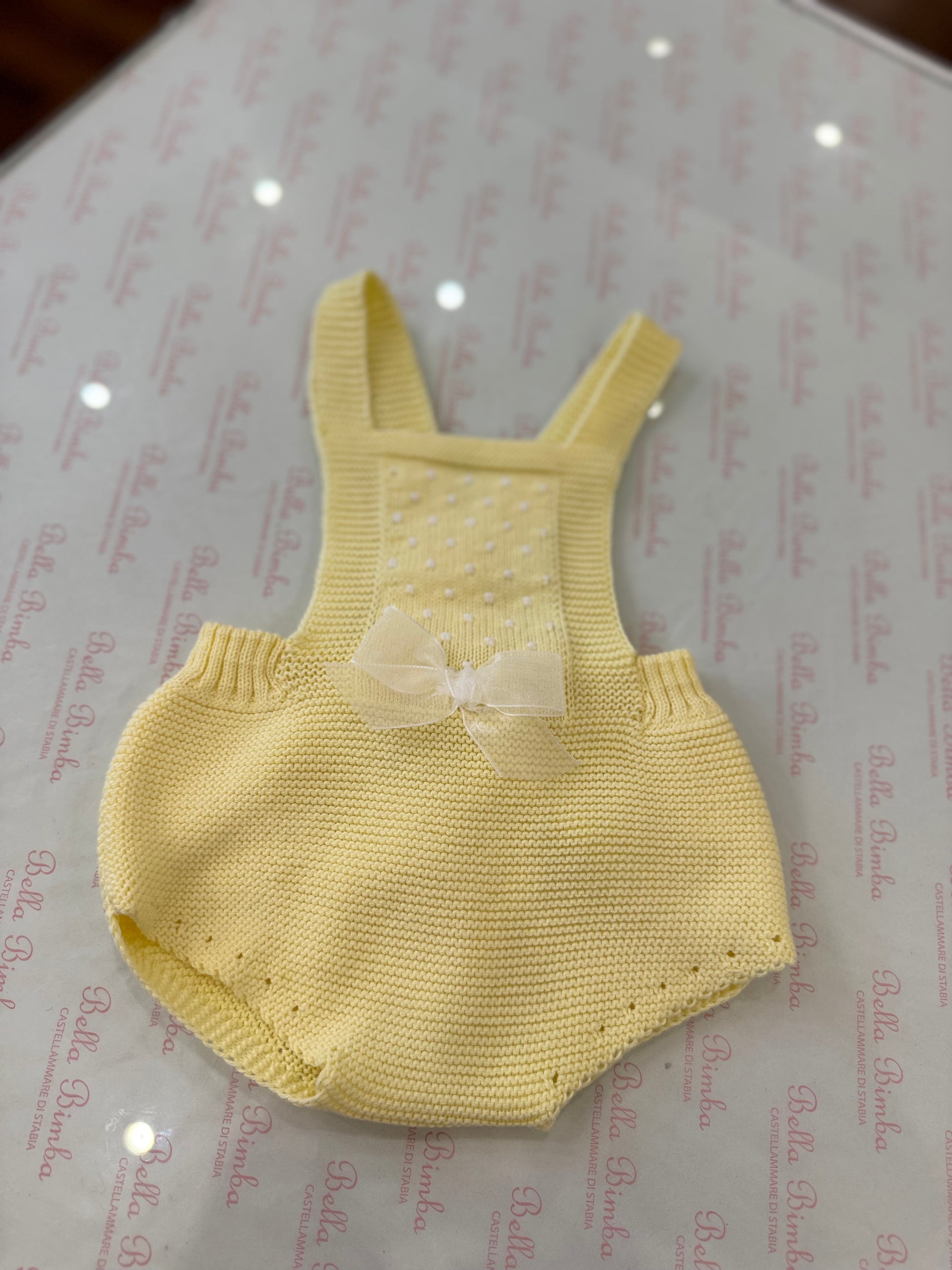 Il Pagliaccetto PCS è la soluzione perfetta per un outfit elegante e alla moda. La salopette gialla con fiocco in organza, può essere facilmente abbinata ad un body con colletto, creando un look curato e raffinato per la tua piccola