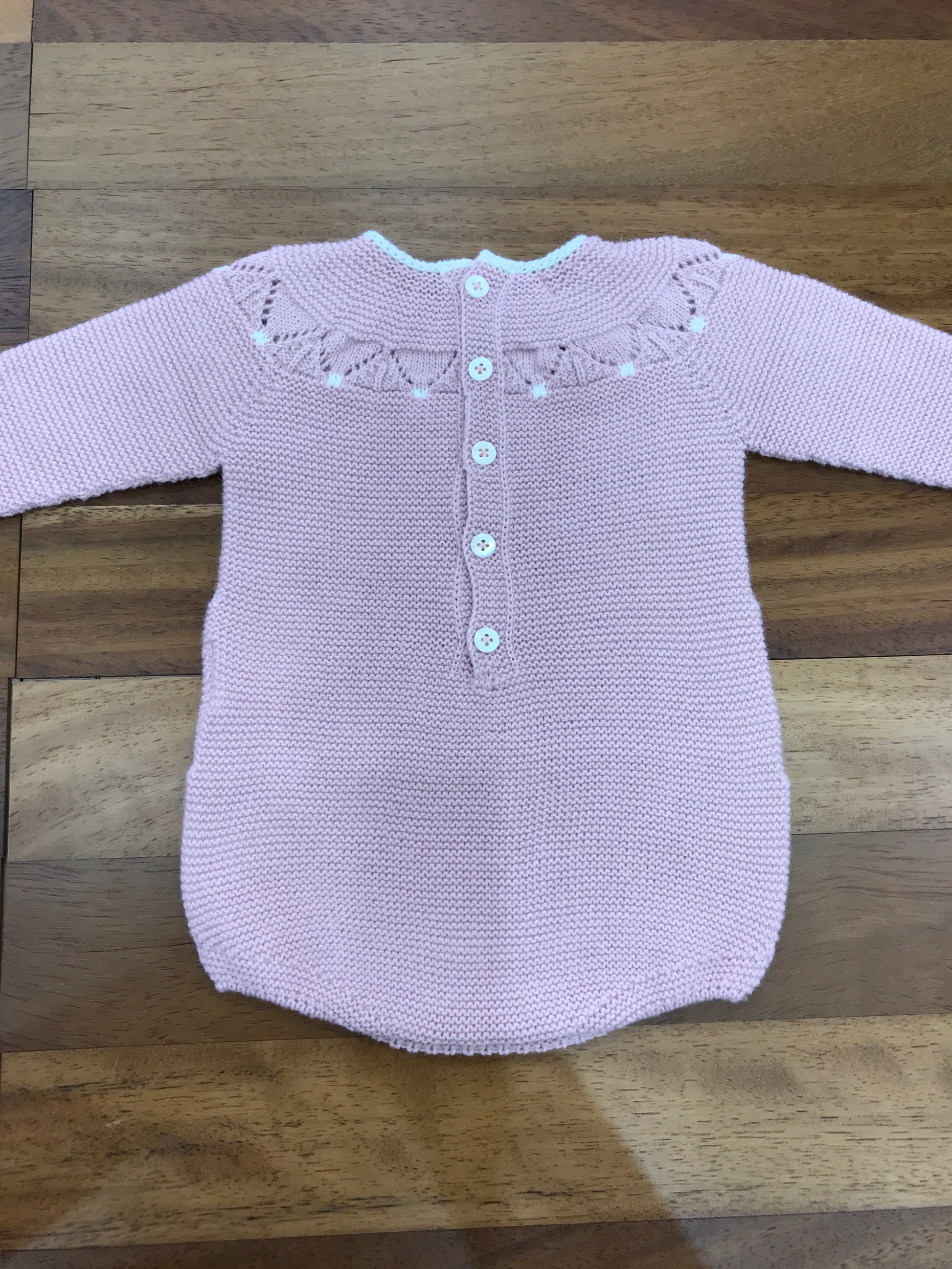 Il pagliaccetto senza gambe è dotato di una chiusura pratica con tre bottoni posizionati nella parte inferiore, che facilita il cambio del bambino. Presenta delicate ruches sulle spalle che aggiungono un tocco di eleganza, accompagnate da due piccoli fiocchetti decorativi. Il capo è impreziosito da un ricamo tono su tono, che conferisce raffinatezza senza appesantire il design, rendendolo ideale per un look sofisticato e confortevole.