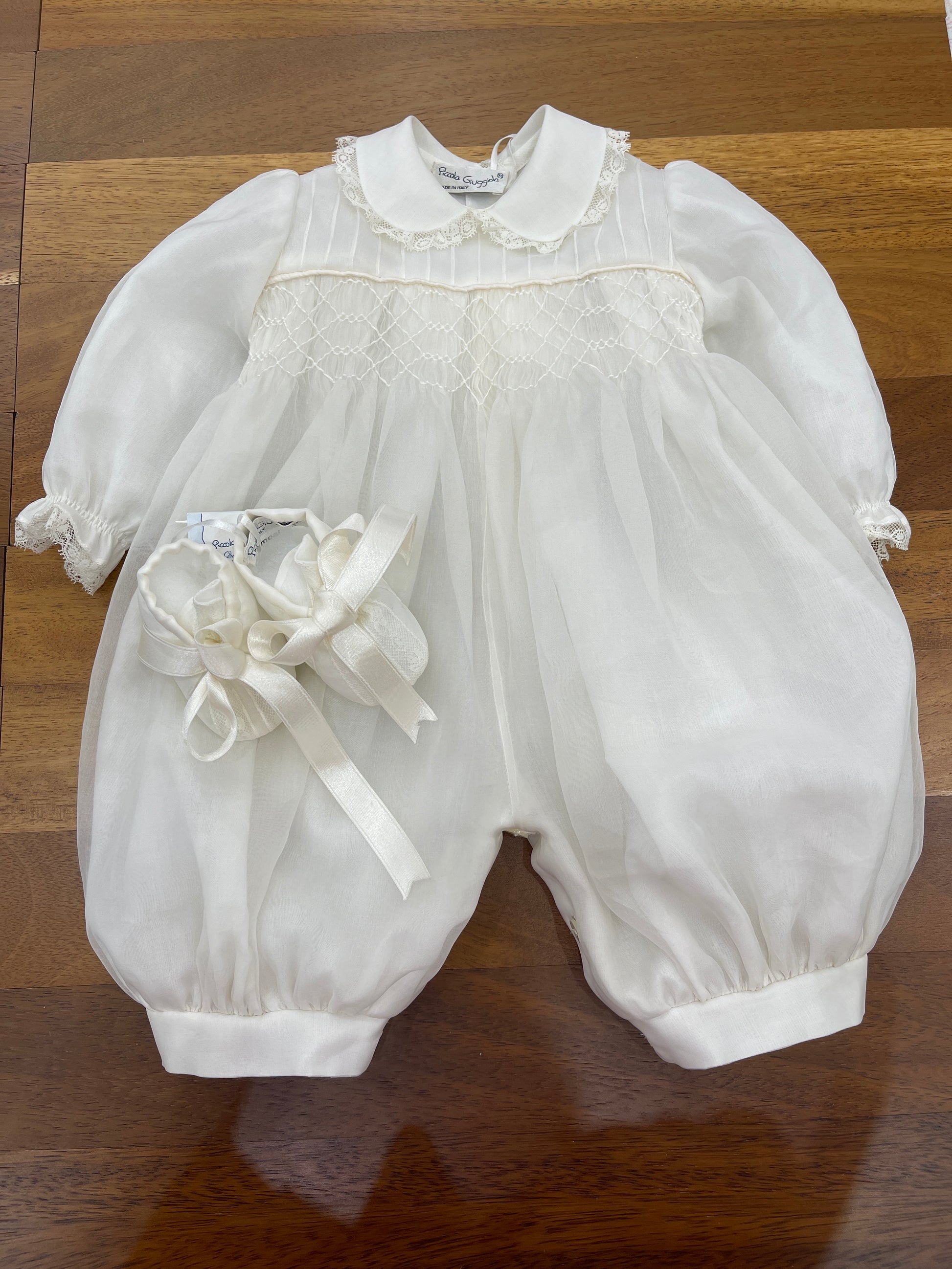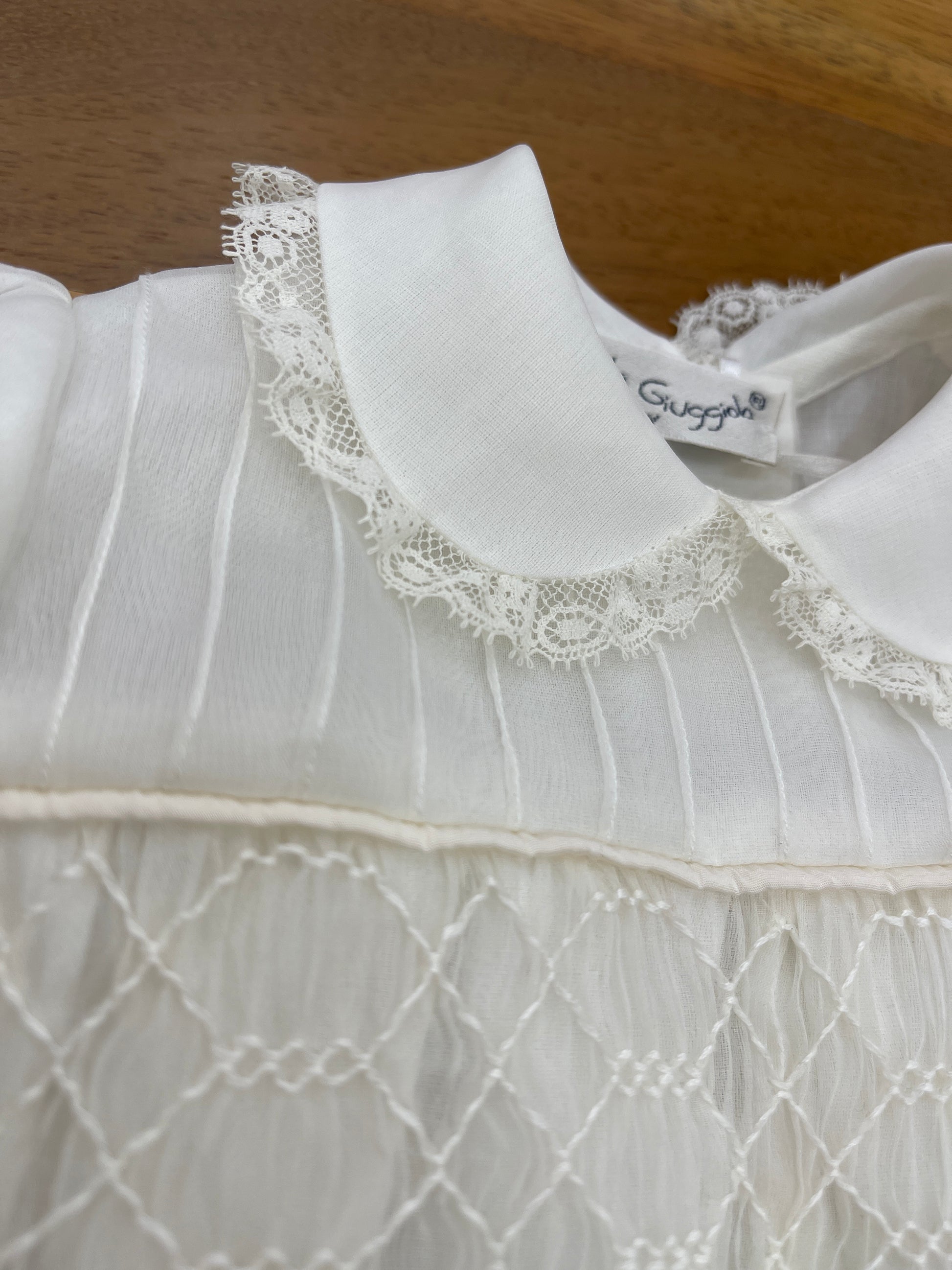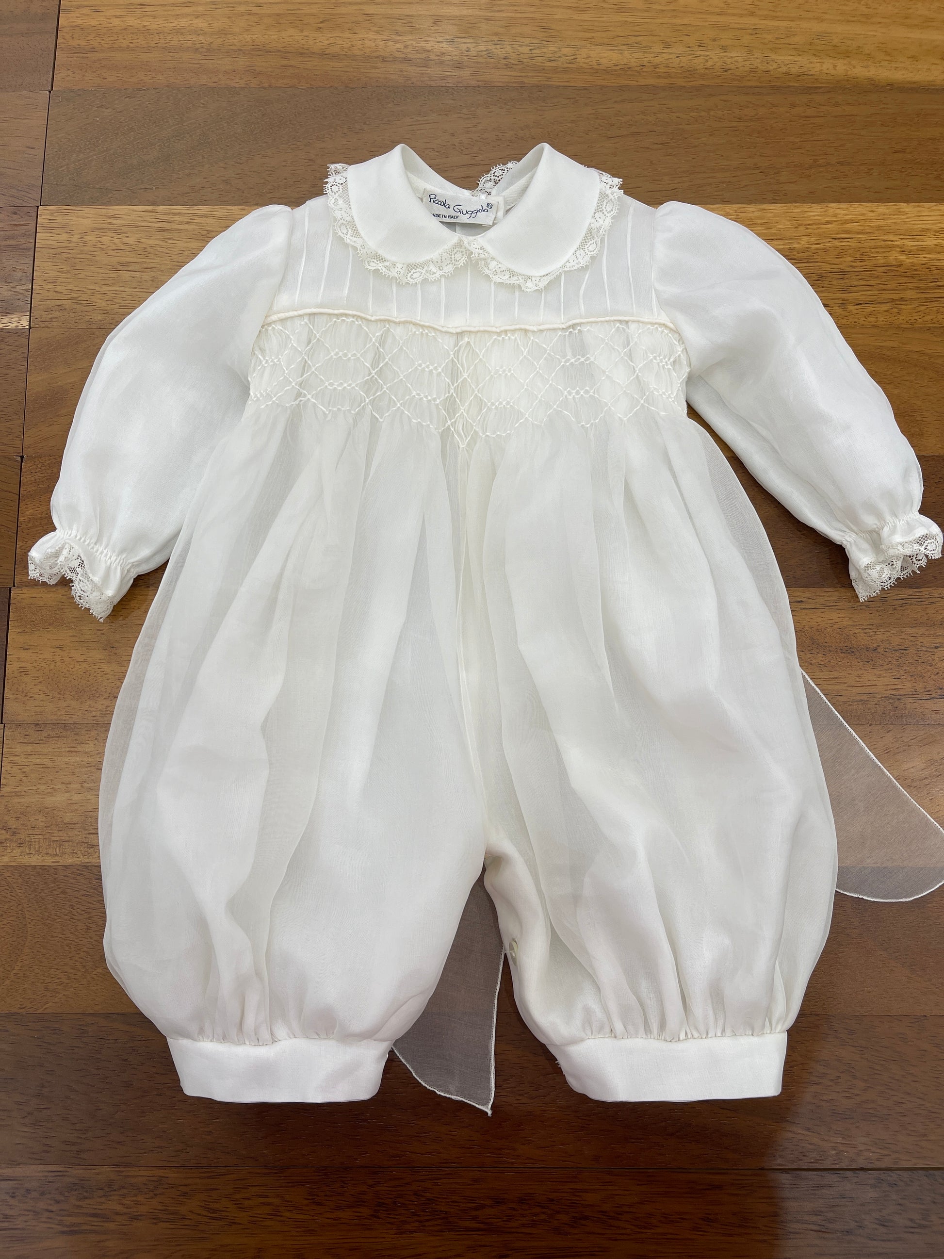 Pagliaccetto in pregiata organza di seta color avorio, caratterizzato da maniche lunghe e un corpetto decorato con punto smock. Presenta un colletto rifinito con valancienne e polsini curati sulle gambine, mentre le maniche sono impreziosite da riccetto e dettagli in valancienne.