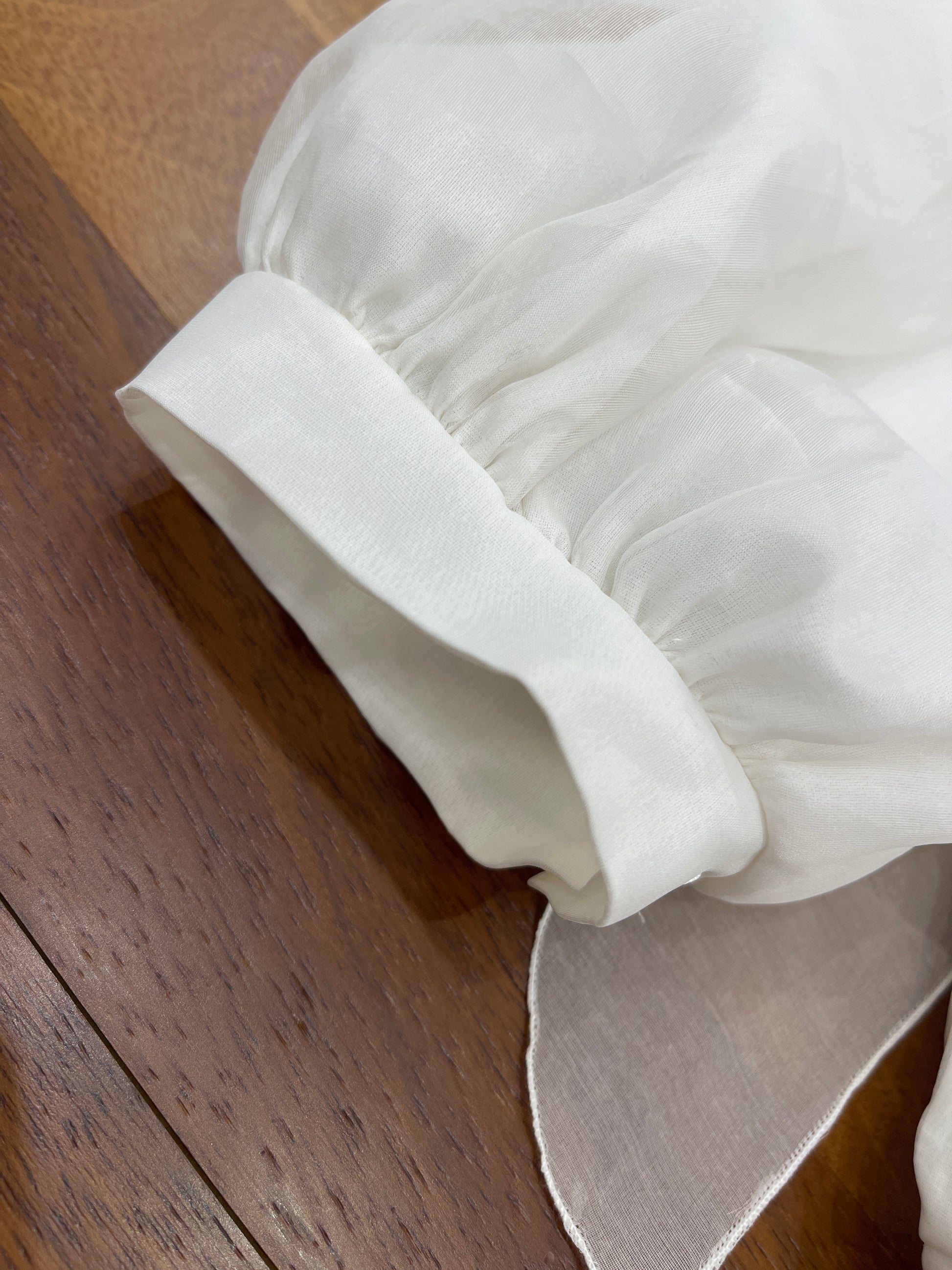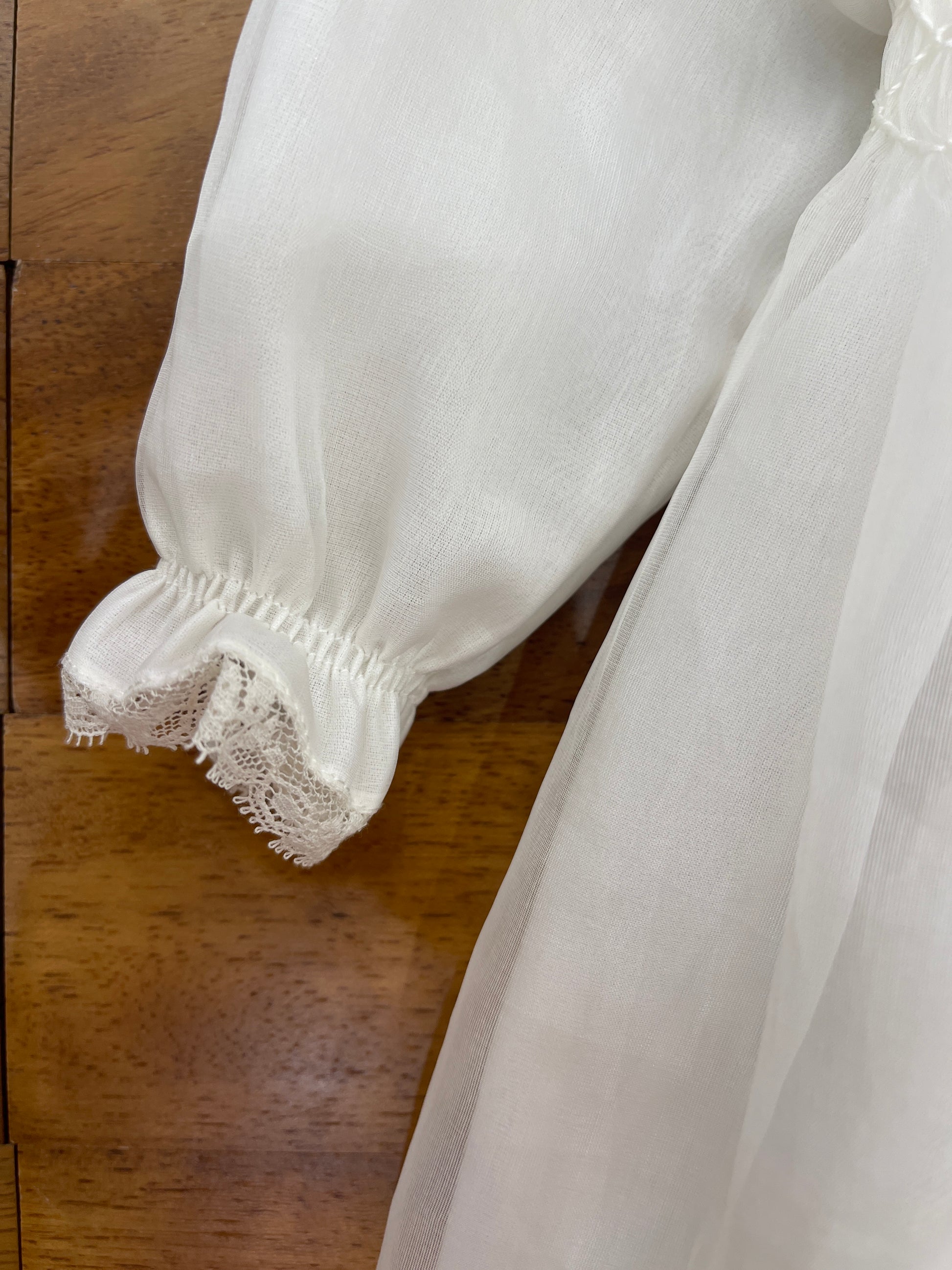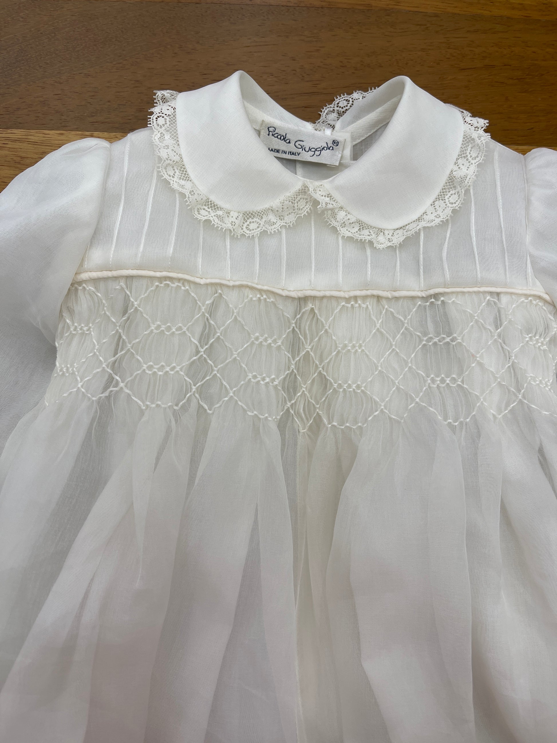 Pagliaccetto in pregiata organza di seta color avorio, caratterizzato da maniche lunghe e un corpetto decorato con punto smock. Presenta un colletto rifinito con valancienne e polsini curati sulle gambine, mentre le maniche sono impreziosite da riccetto e dettagli in valancienne.