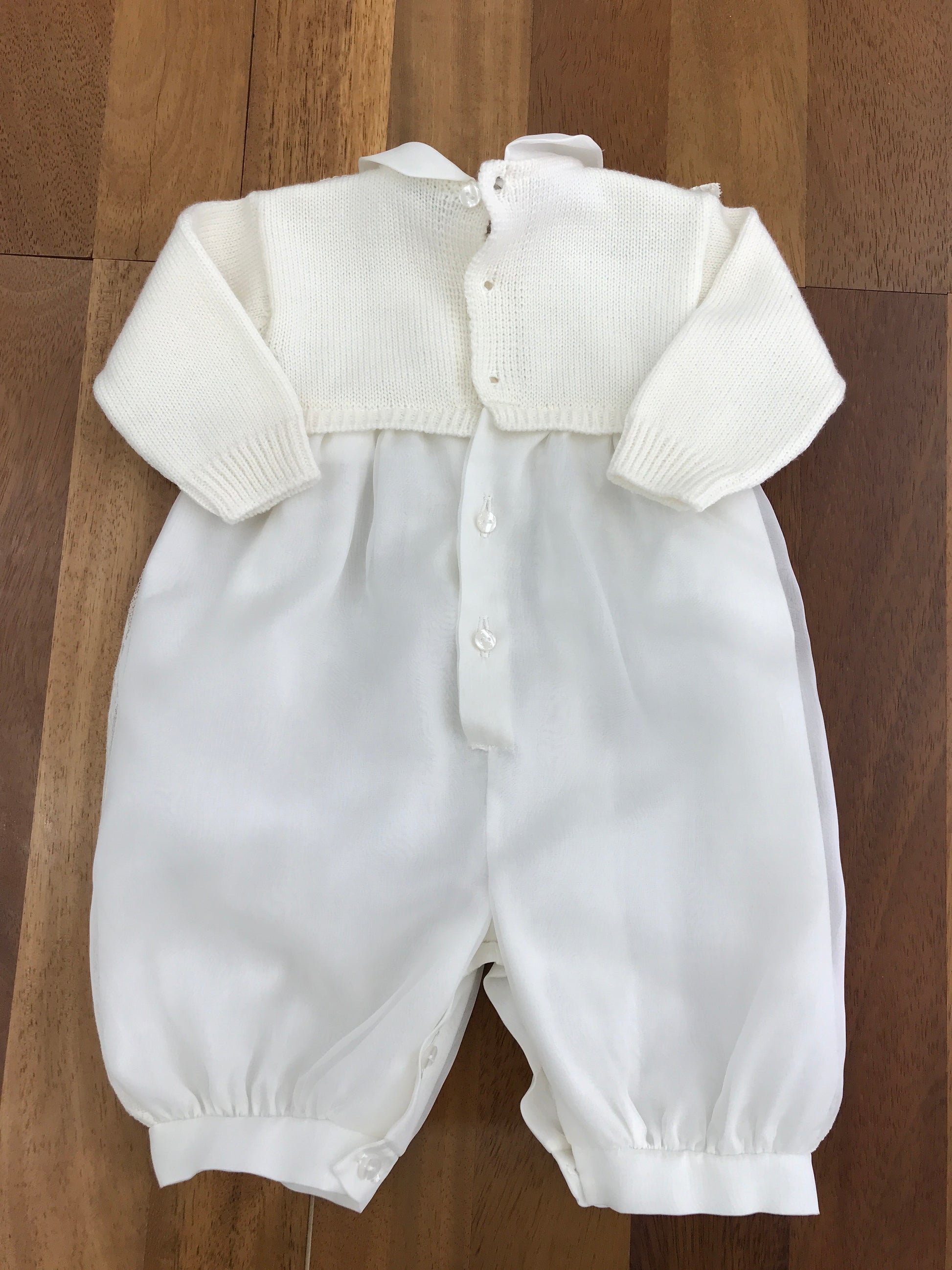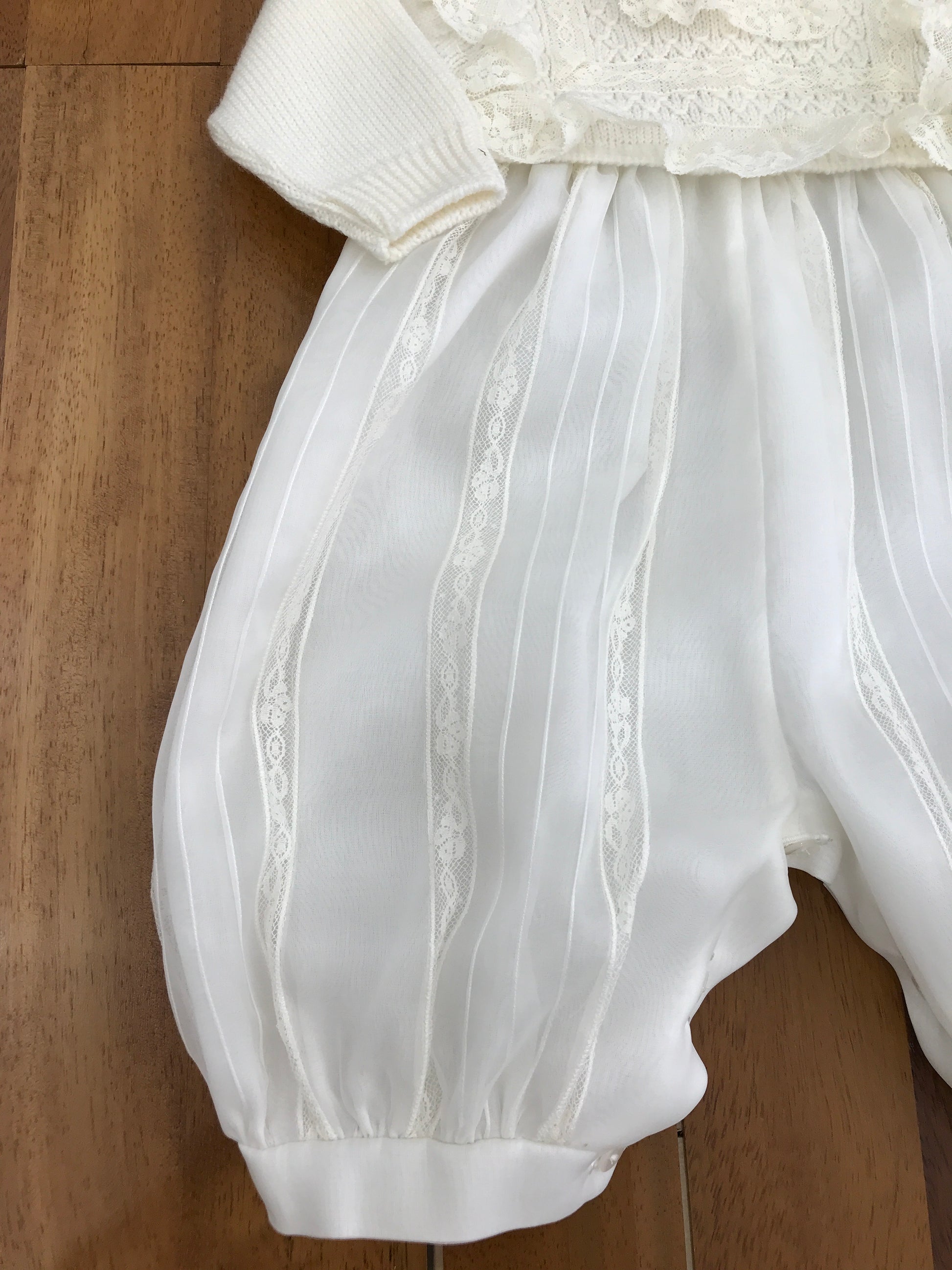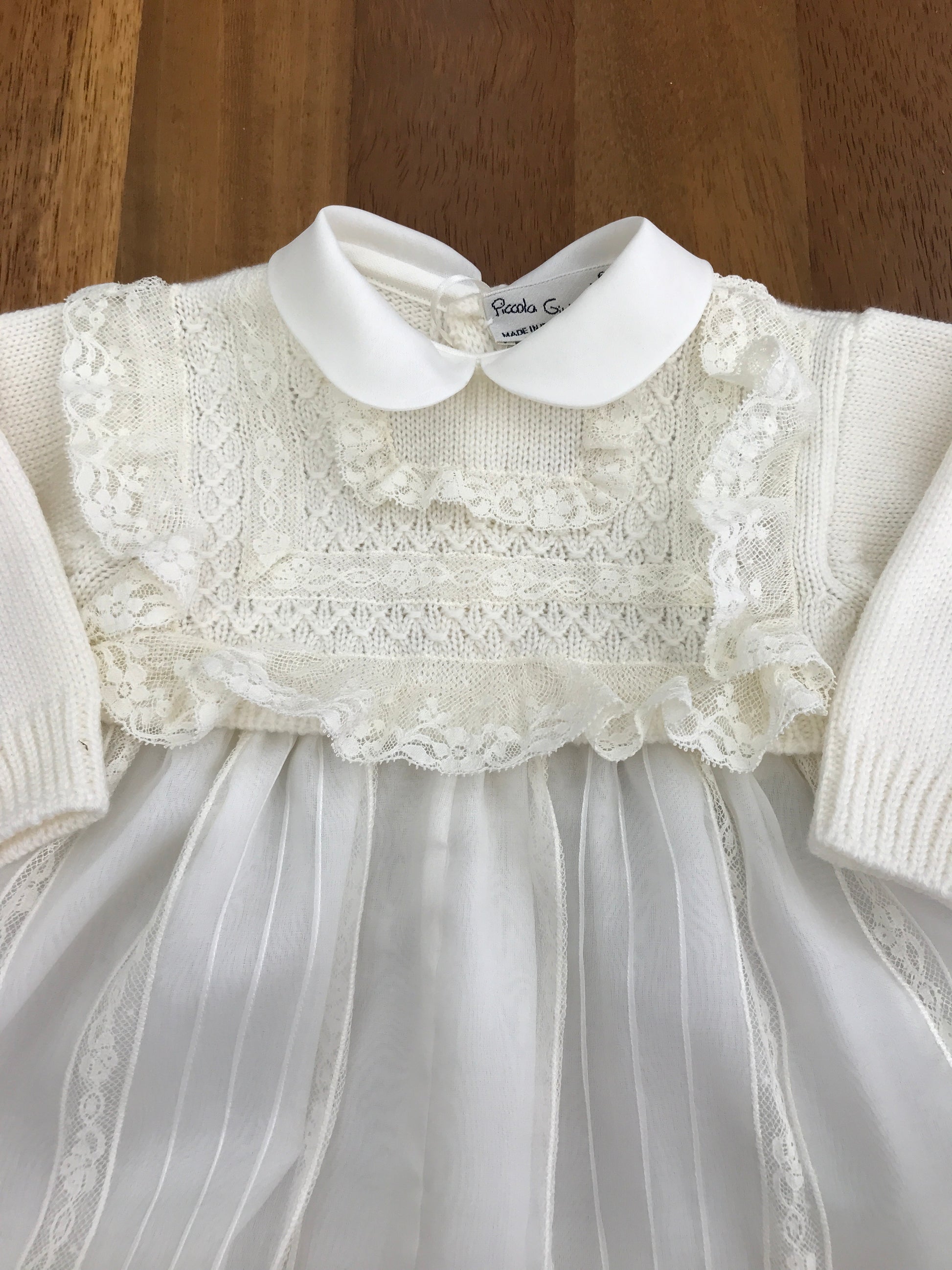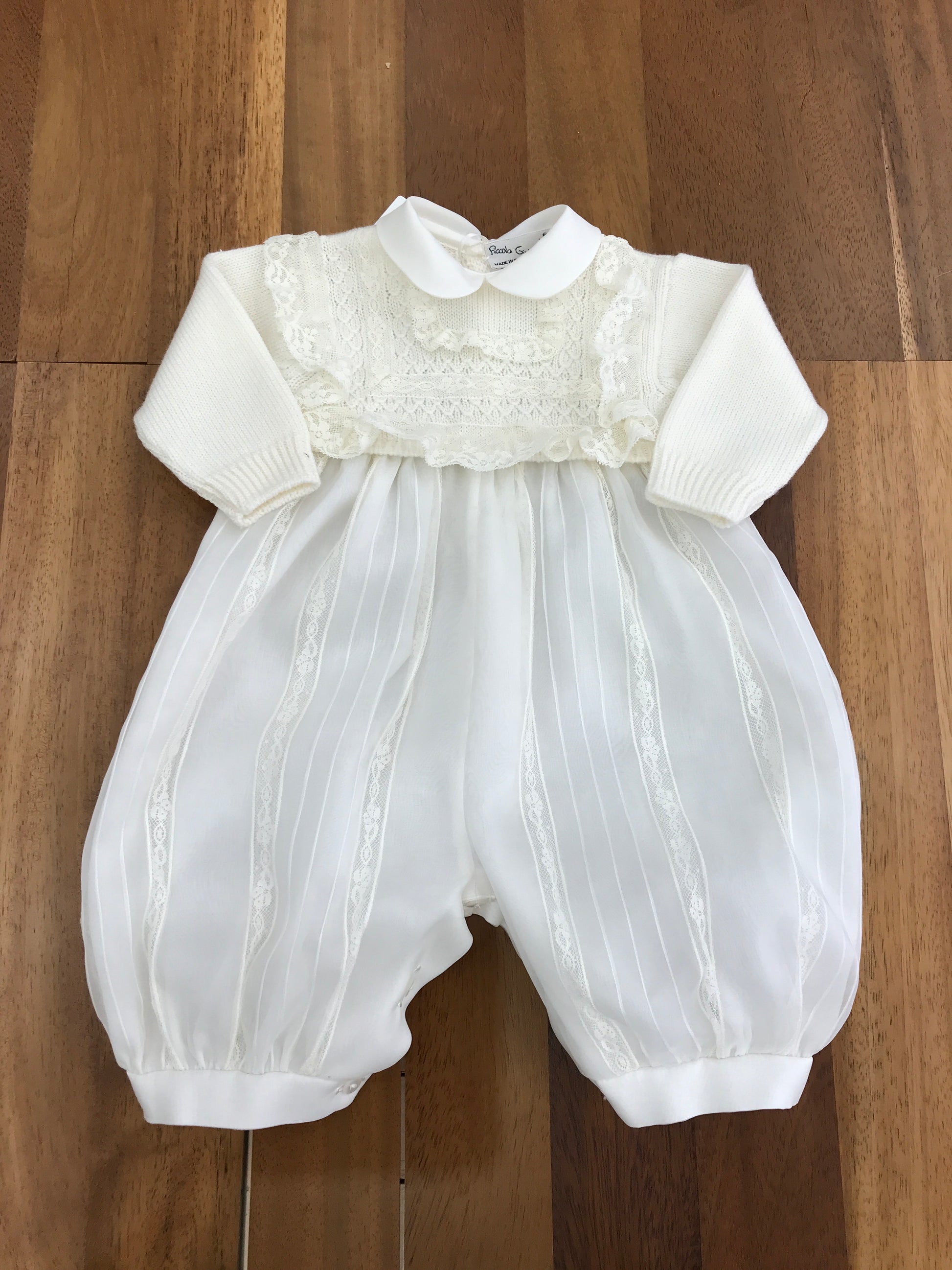 Il pagliaccetto presenta un corpetto realizzato in pregiata lana, arricchito da eleganti rifiniture in Valencienne che ne esaltano la cura artigianale. La parte inferiore è composta da un morbido strato di organza di seta, impreziosito da inserti in Valencienne posti sulle gambe, conferendo un tocco raffinato e sofisticato. La lunghezza maggiore del sotto aggiunge movimento e leggerezza all’insieme, rendendo questo capo ideale per occasioni speciali e per chi apprezza una lavorazione di alta qualità.