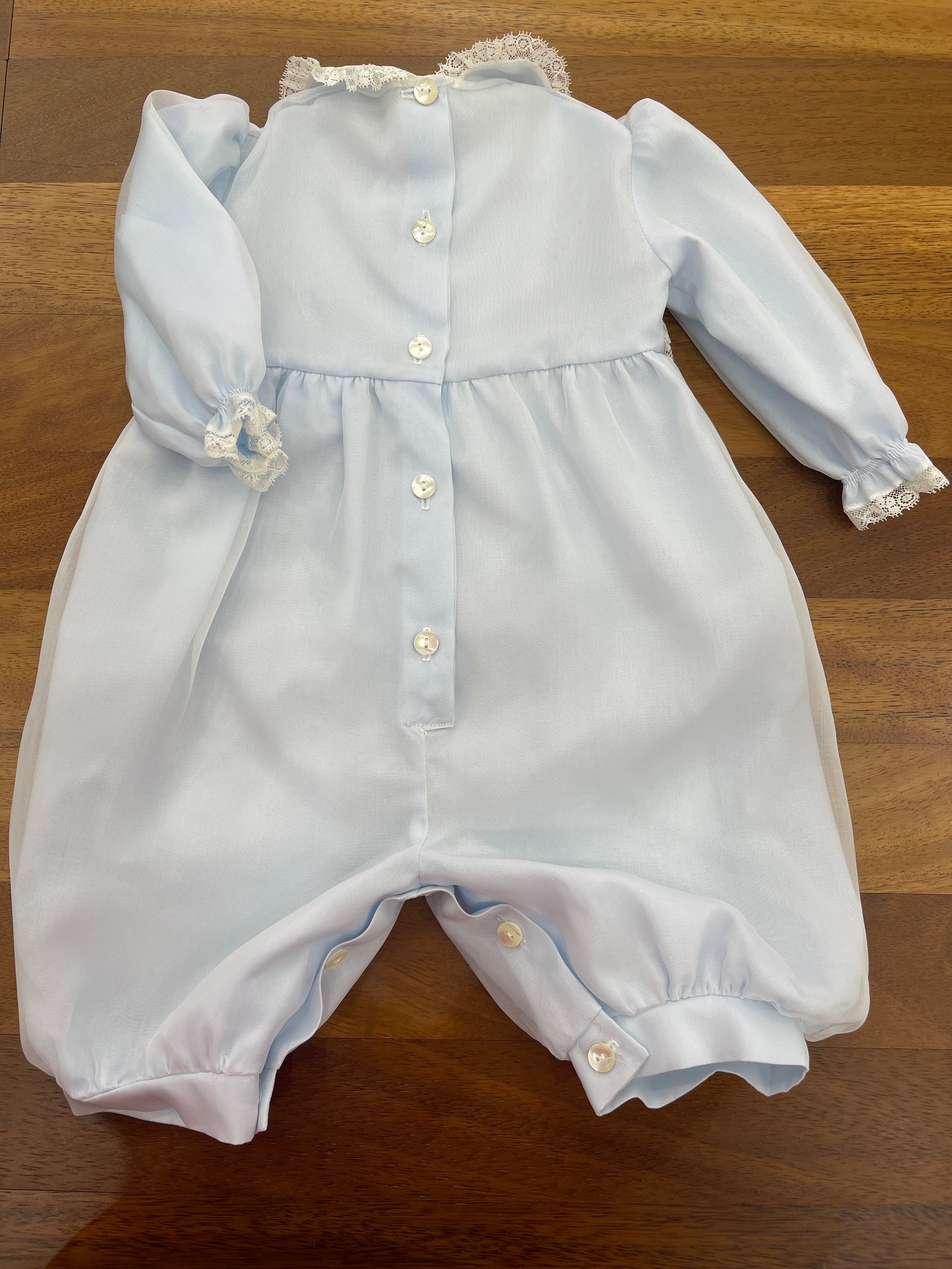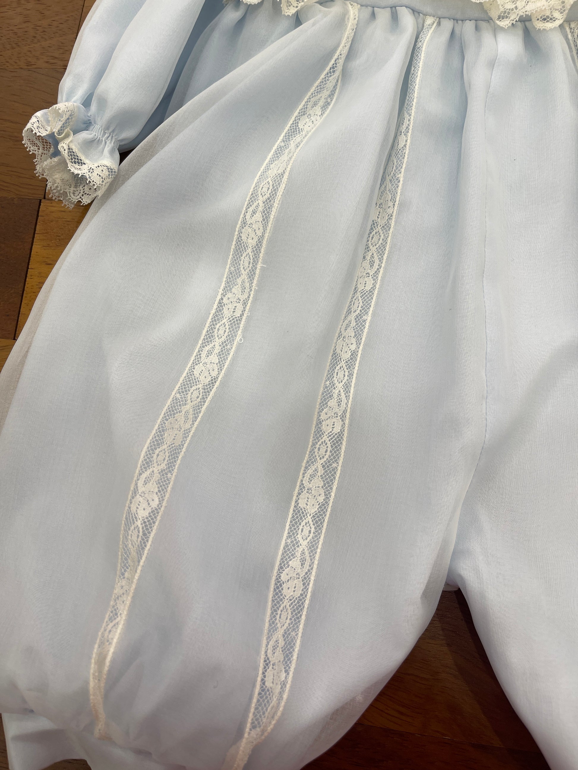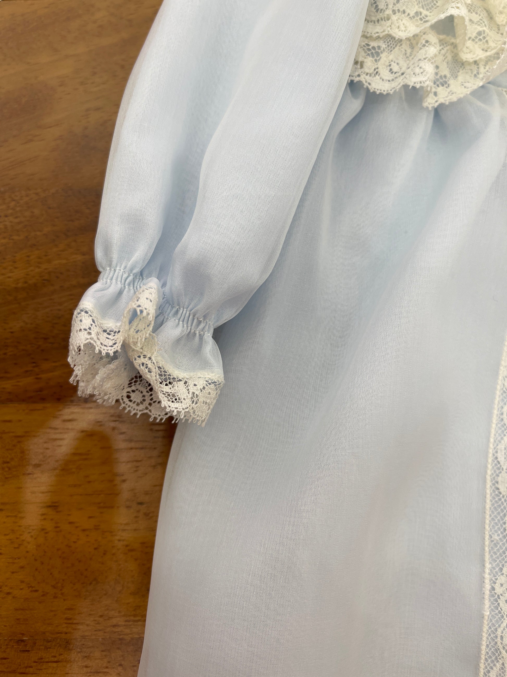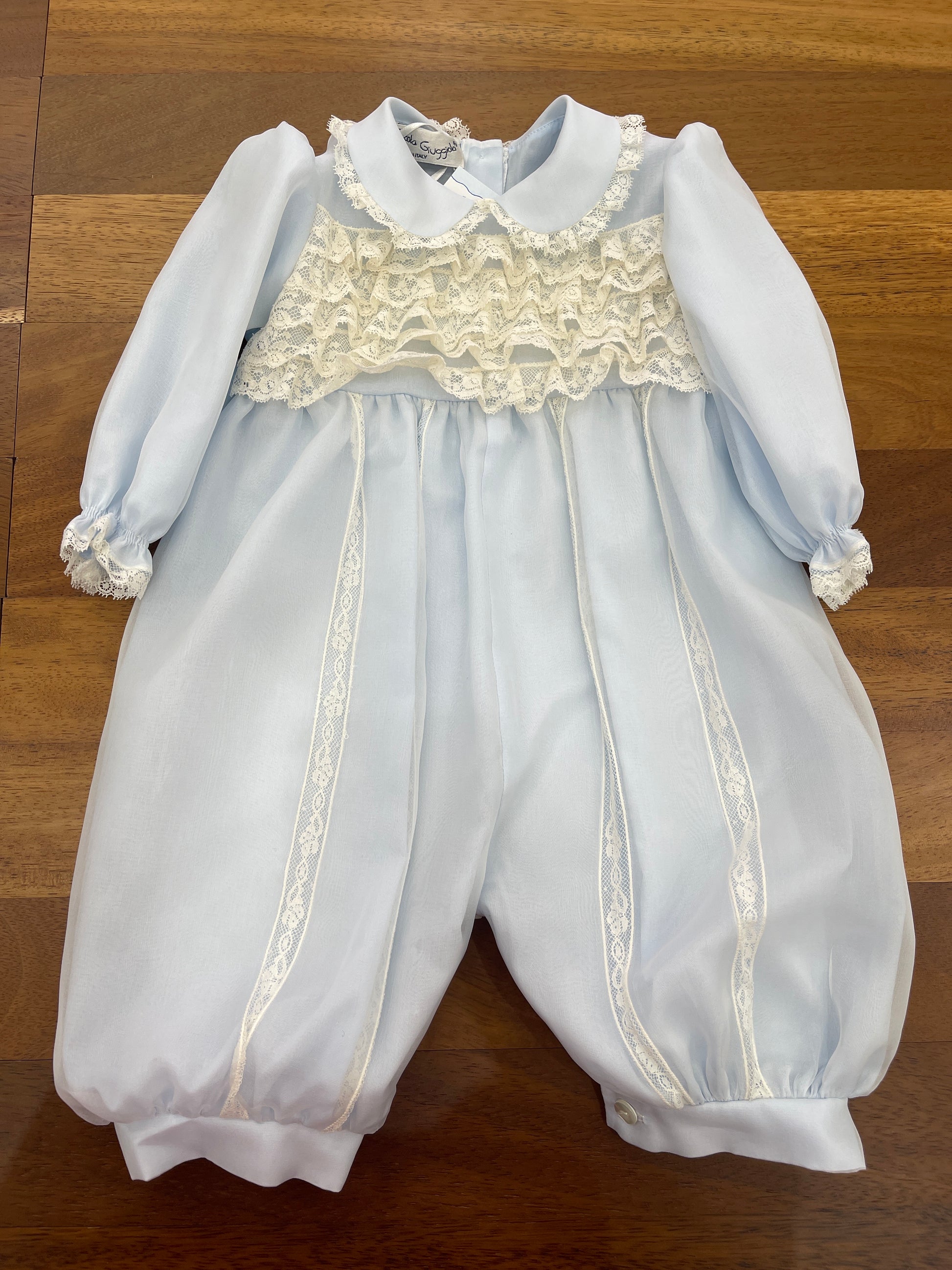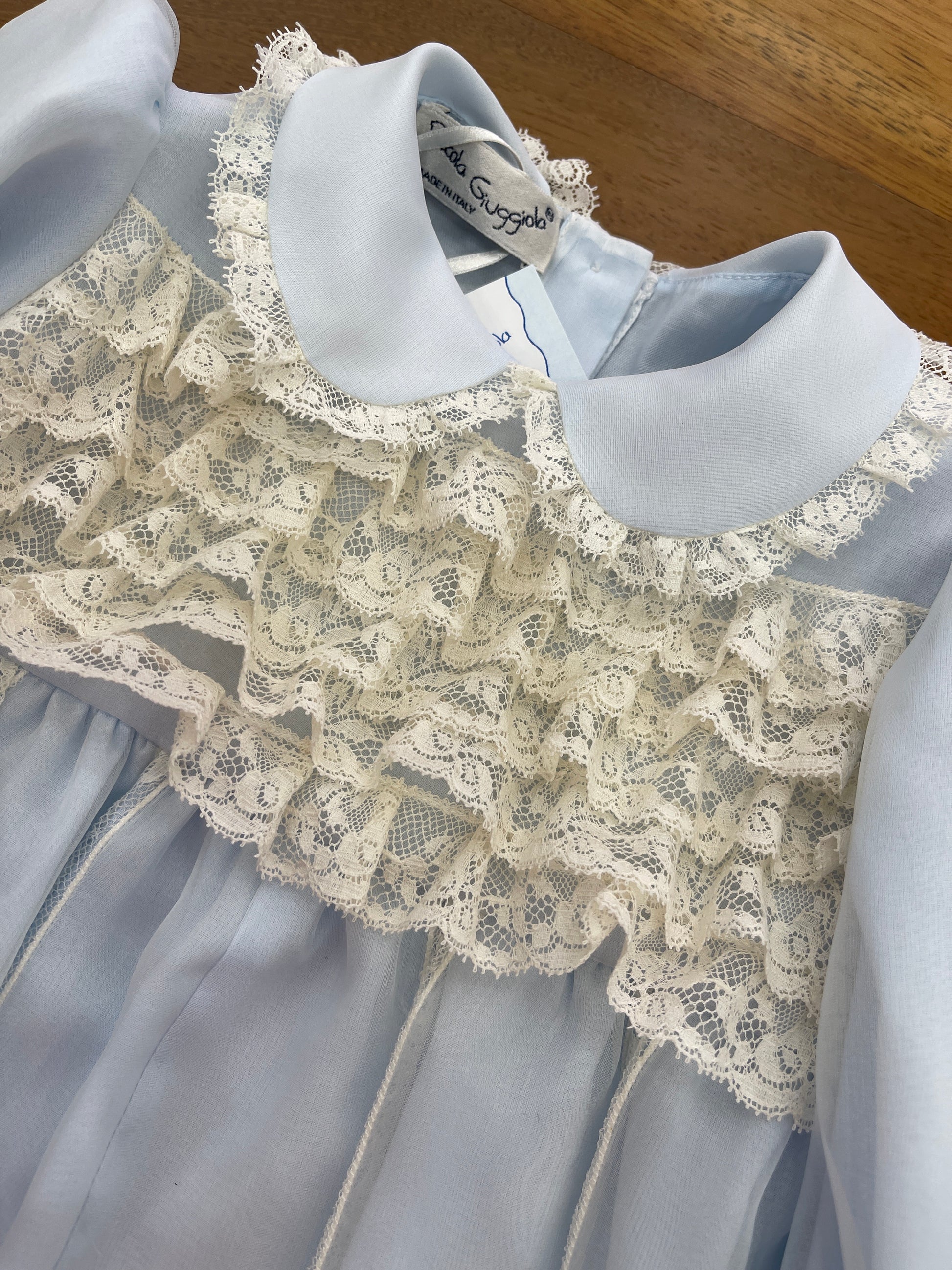 Pagliaccetto realizzato in organza di seta a maniche lunghe, con il corpetto decorato da balze in pizzo valencienne. Il colletto è rifinito nello stesso pizzo, mentre i polsi delle maniche presentano un delicato riccetto. Al centro del capo sono applicate strisce di valencienne che ne esaltano l’eleganza artigianale.
