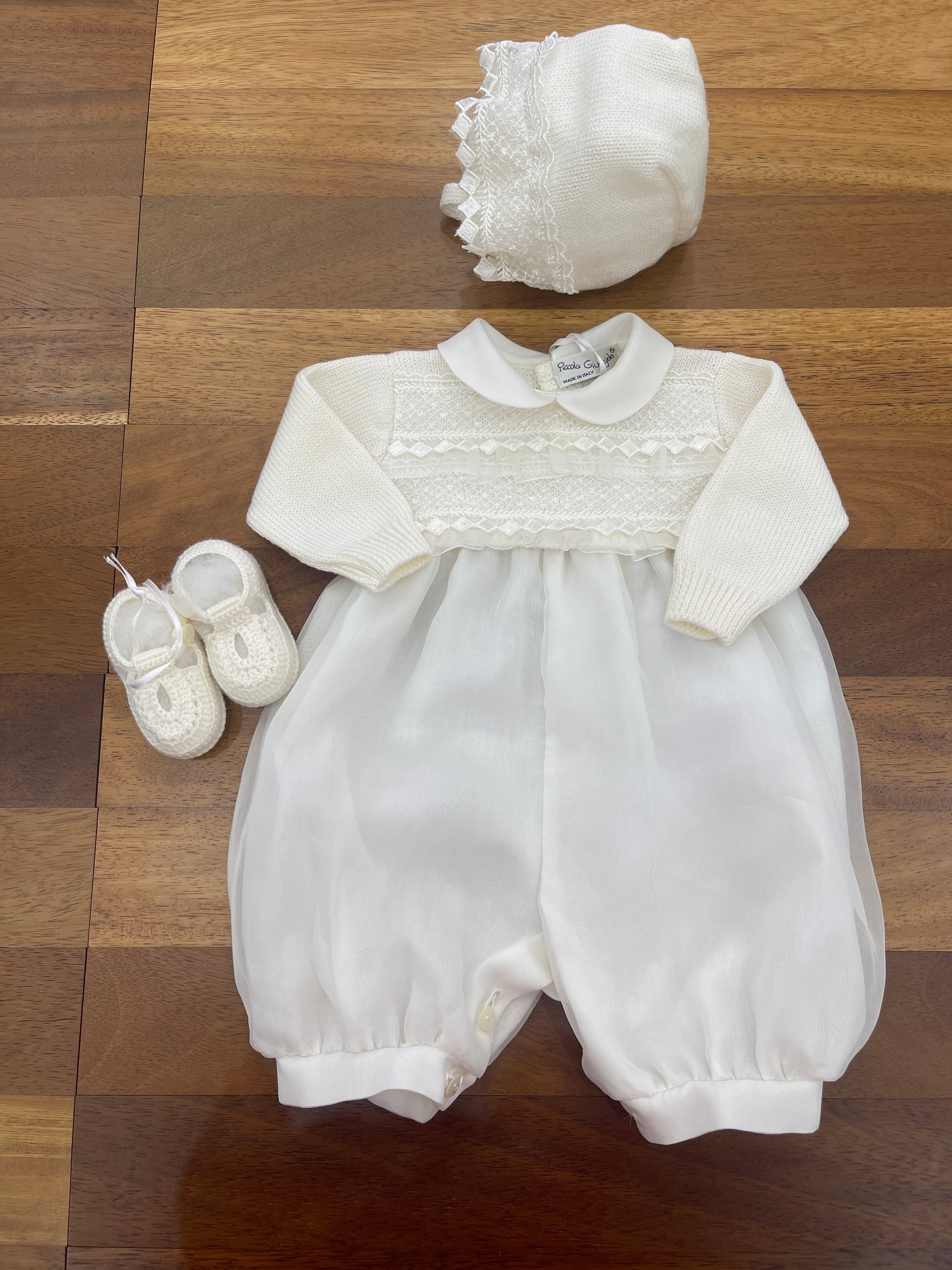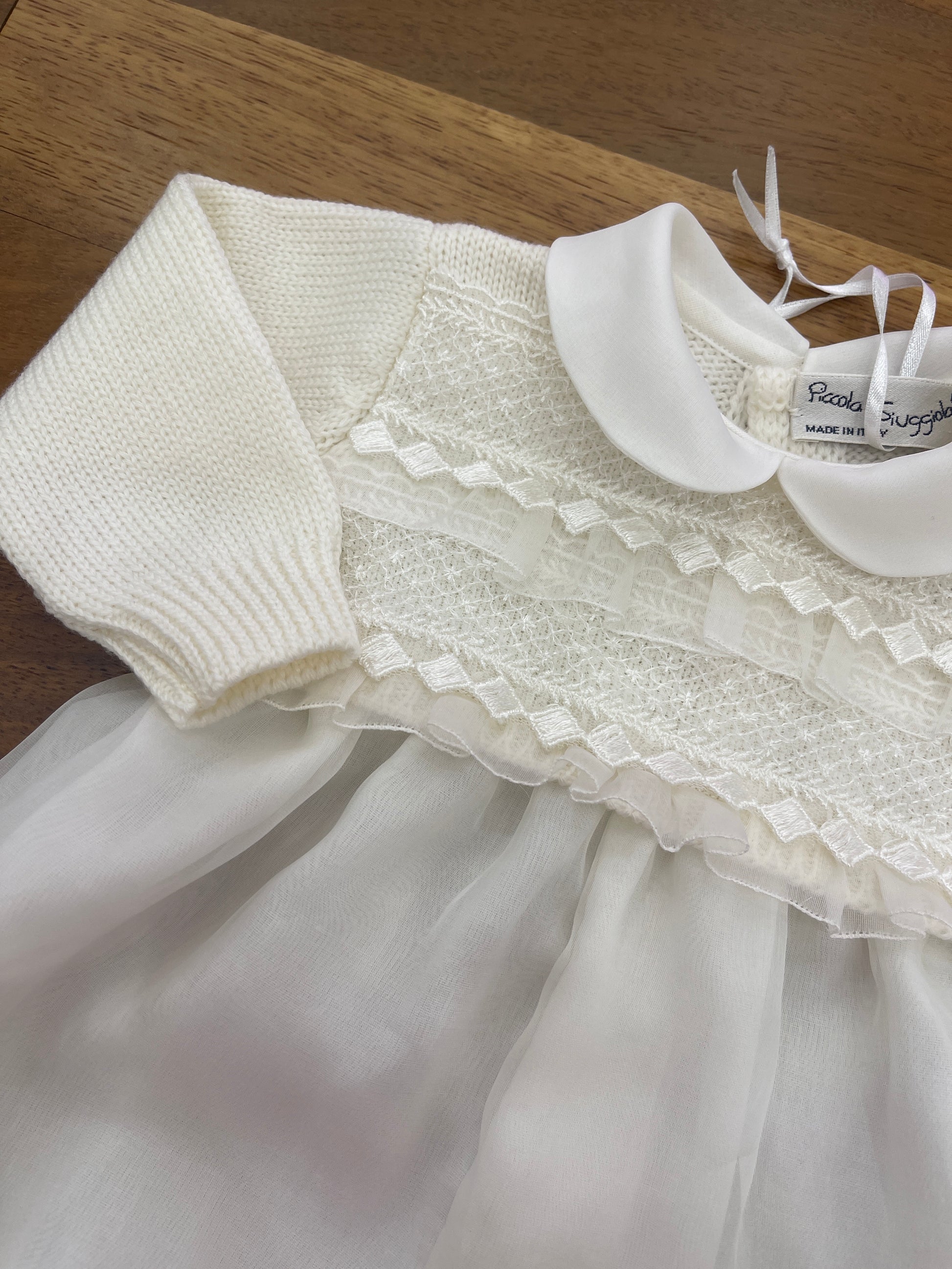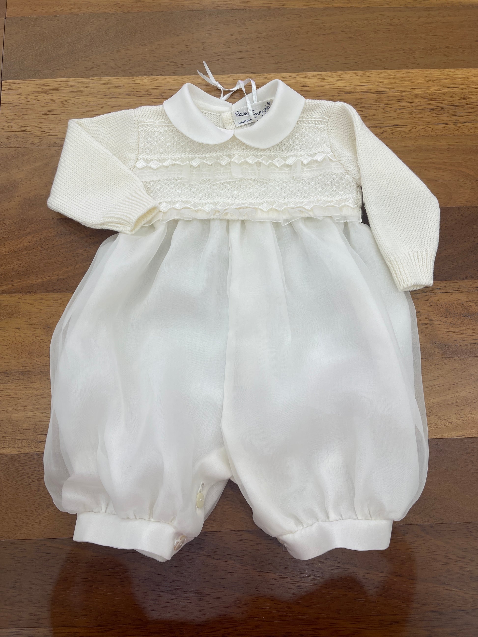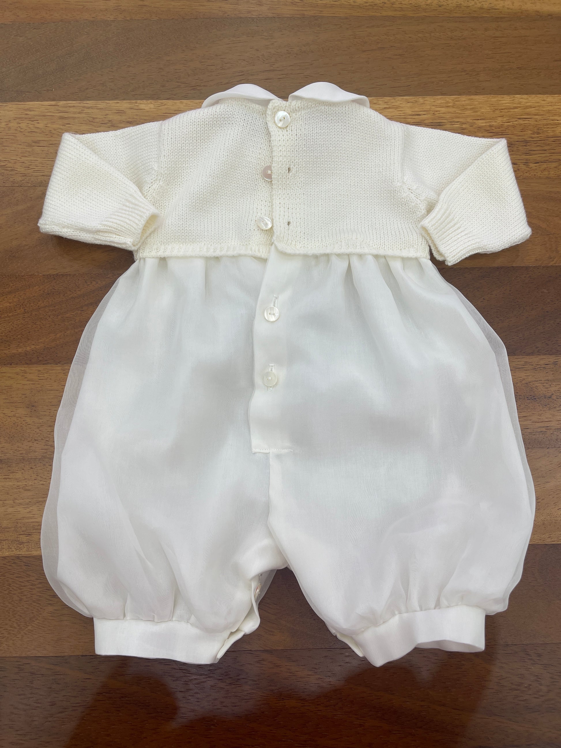 Pagliaccetto con corpetto realizzato in lana e decorato con applicazioni di merletto. Il colletto è rifinito in organza di seta, mentre la parte inferiore a sbuffo è anch’essa in organza di seta. Il capo è completamente foderato in battista di cotone per un comfort ottimale.