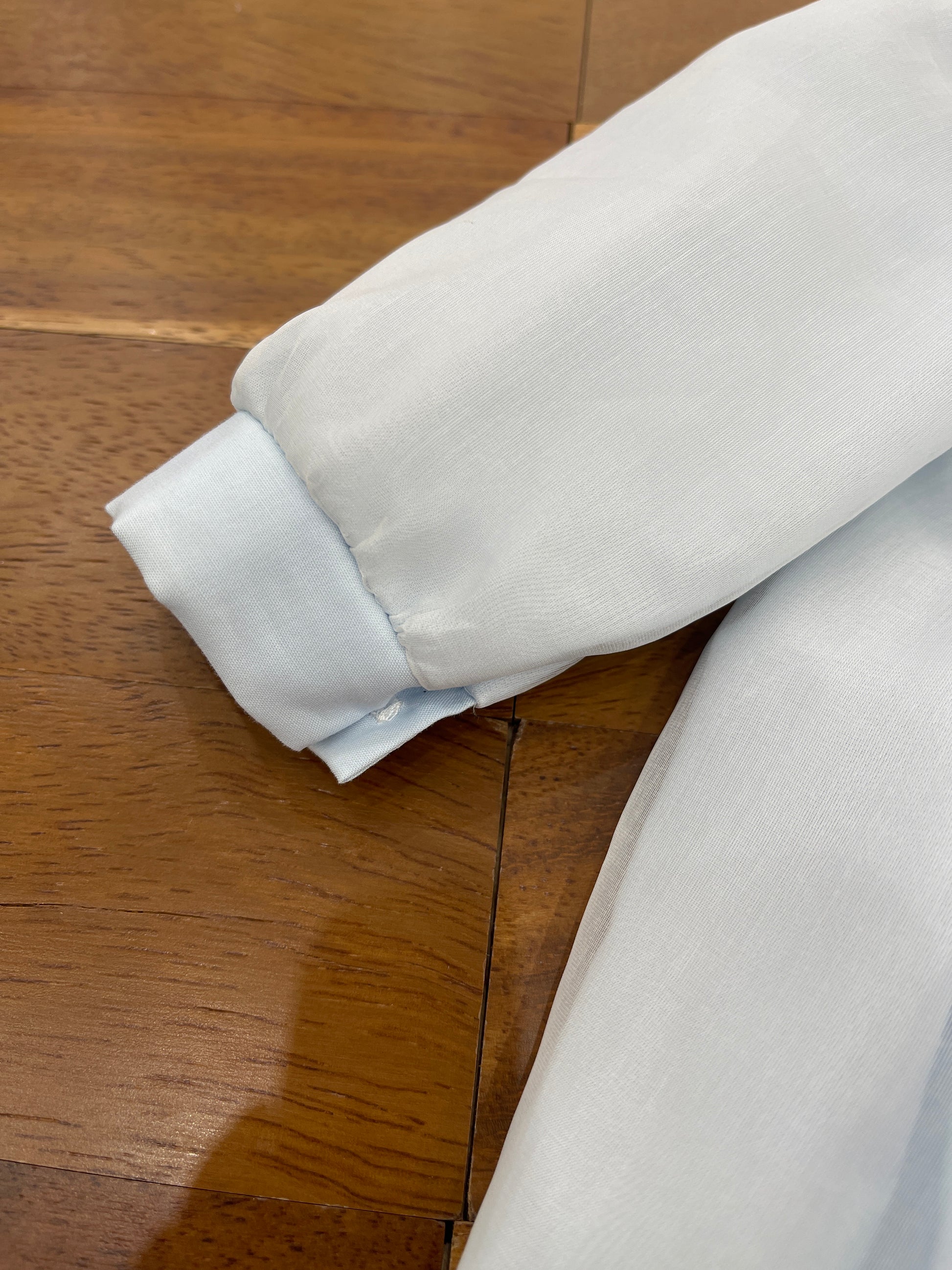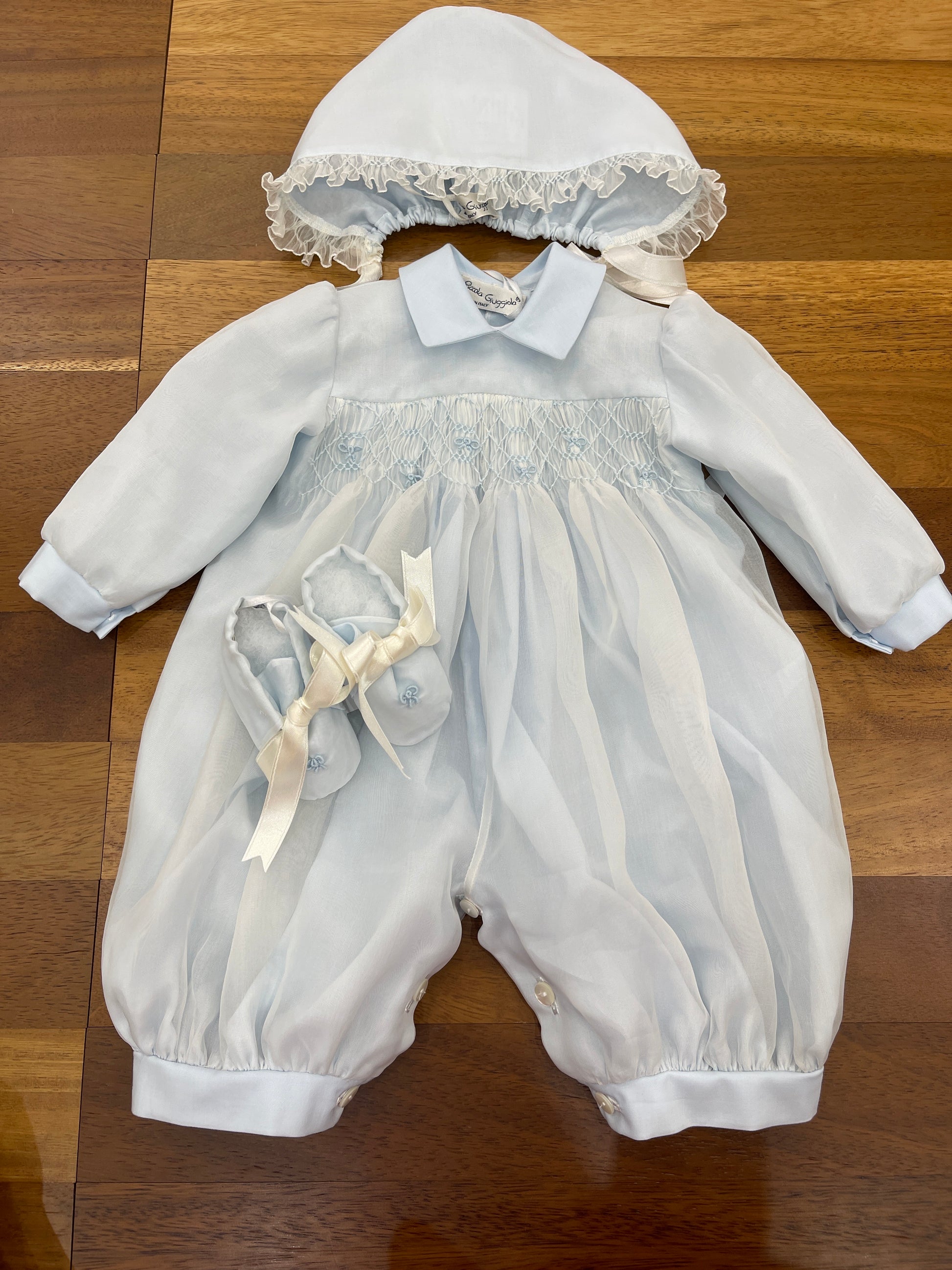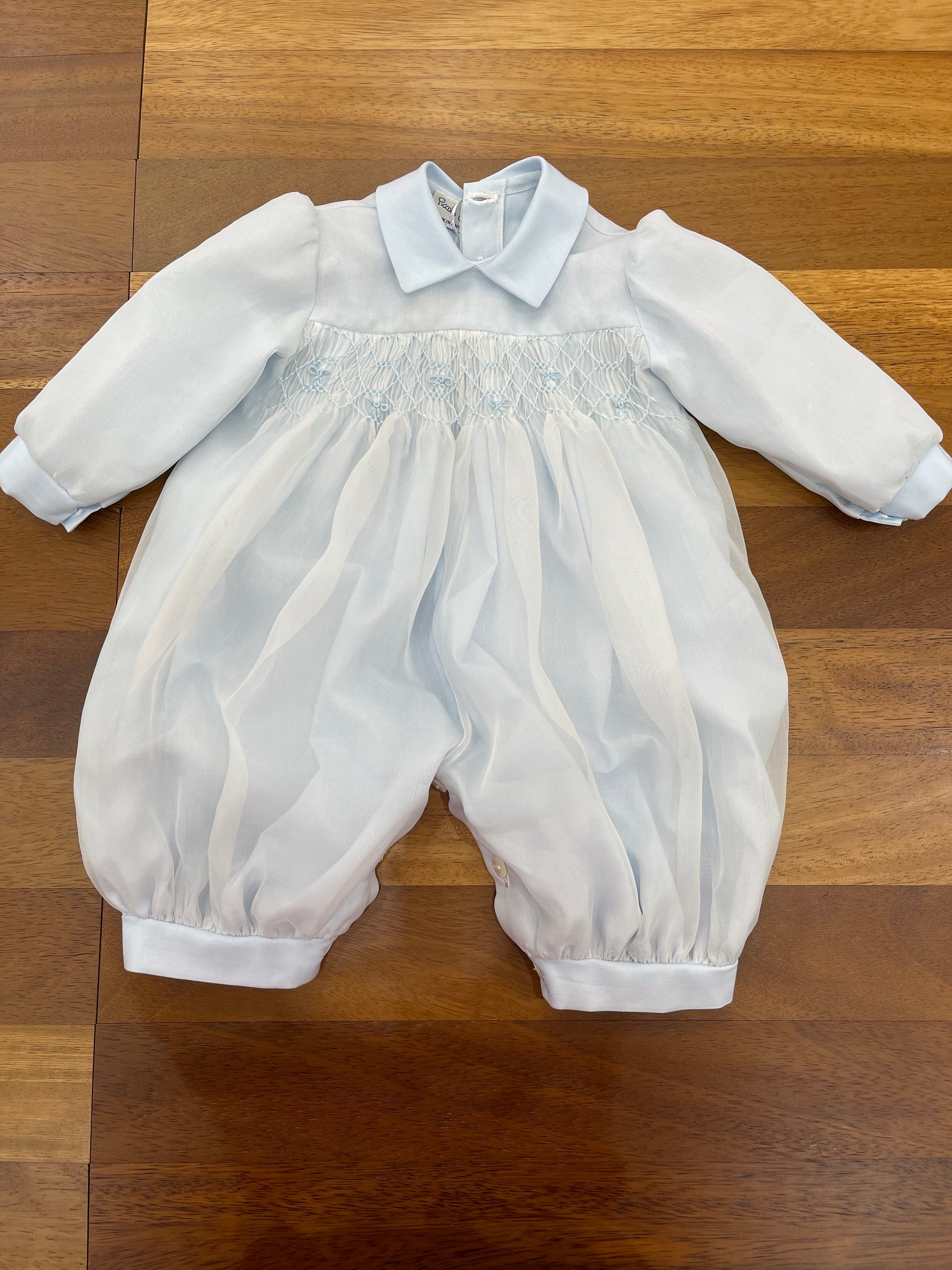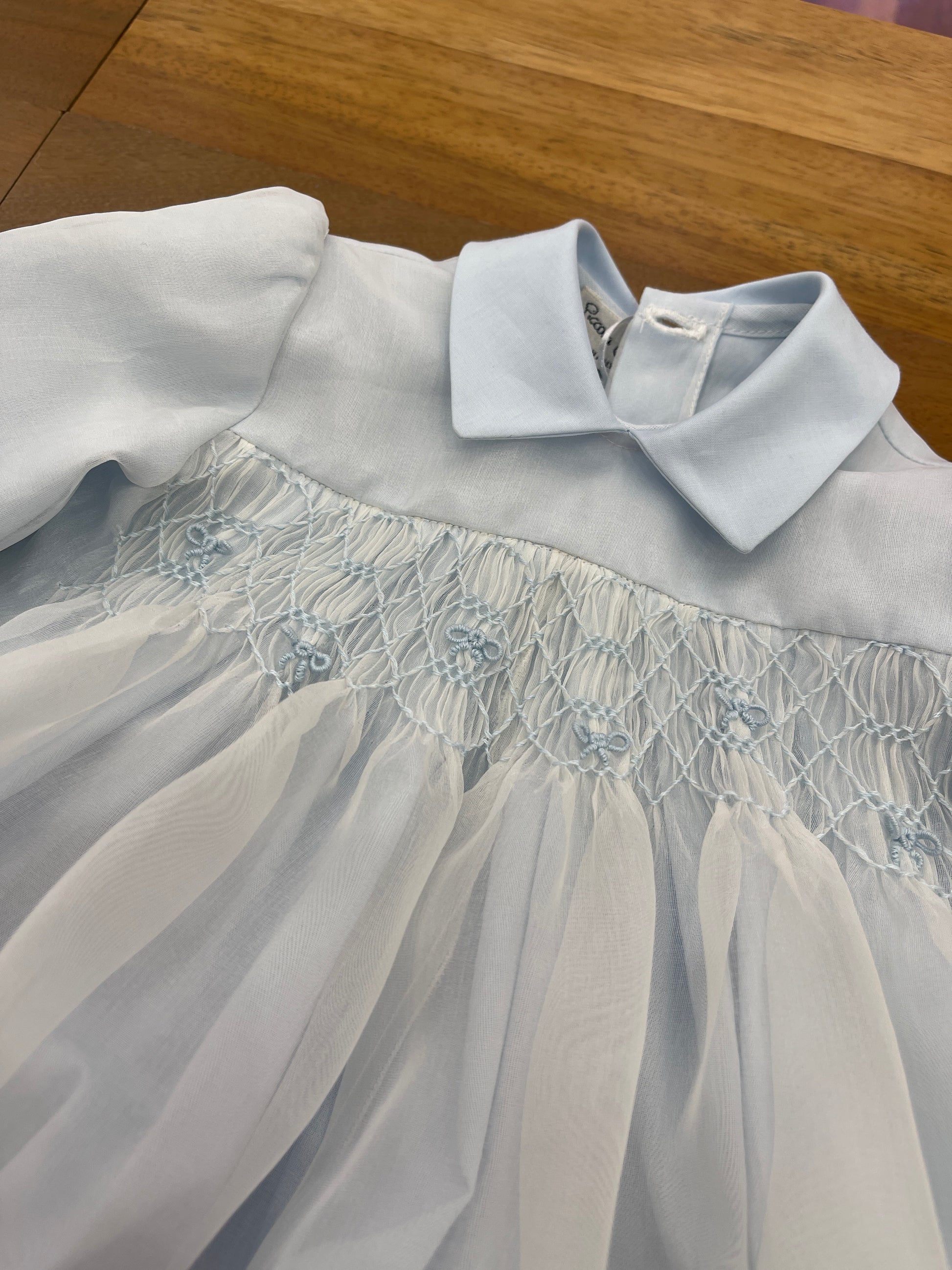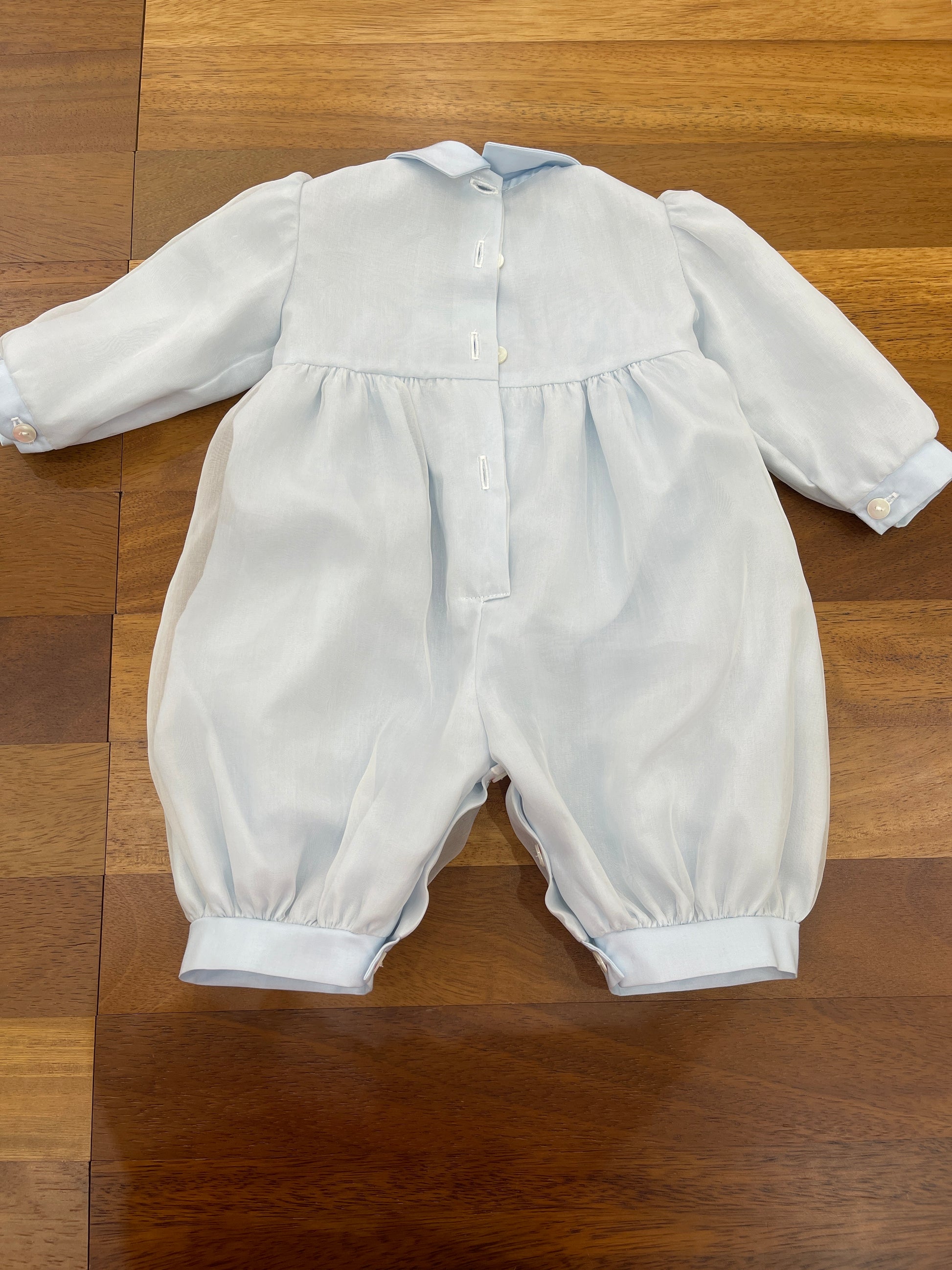 Pagliaccetto in organza di seta color cielo con maniche lunghe, dotato di un corpetto lavorato a punto smock e dettagli di fiocchetti celesti realizzati a mano. Presenta un colletto a camicia e polsini rifiniti con cura su maniche e gambine.