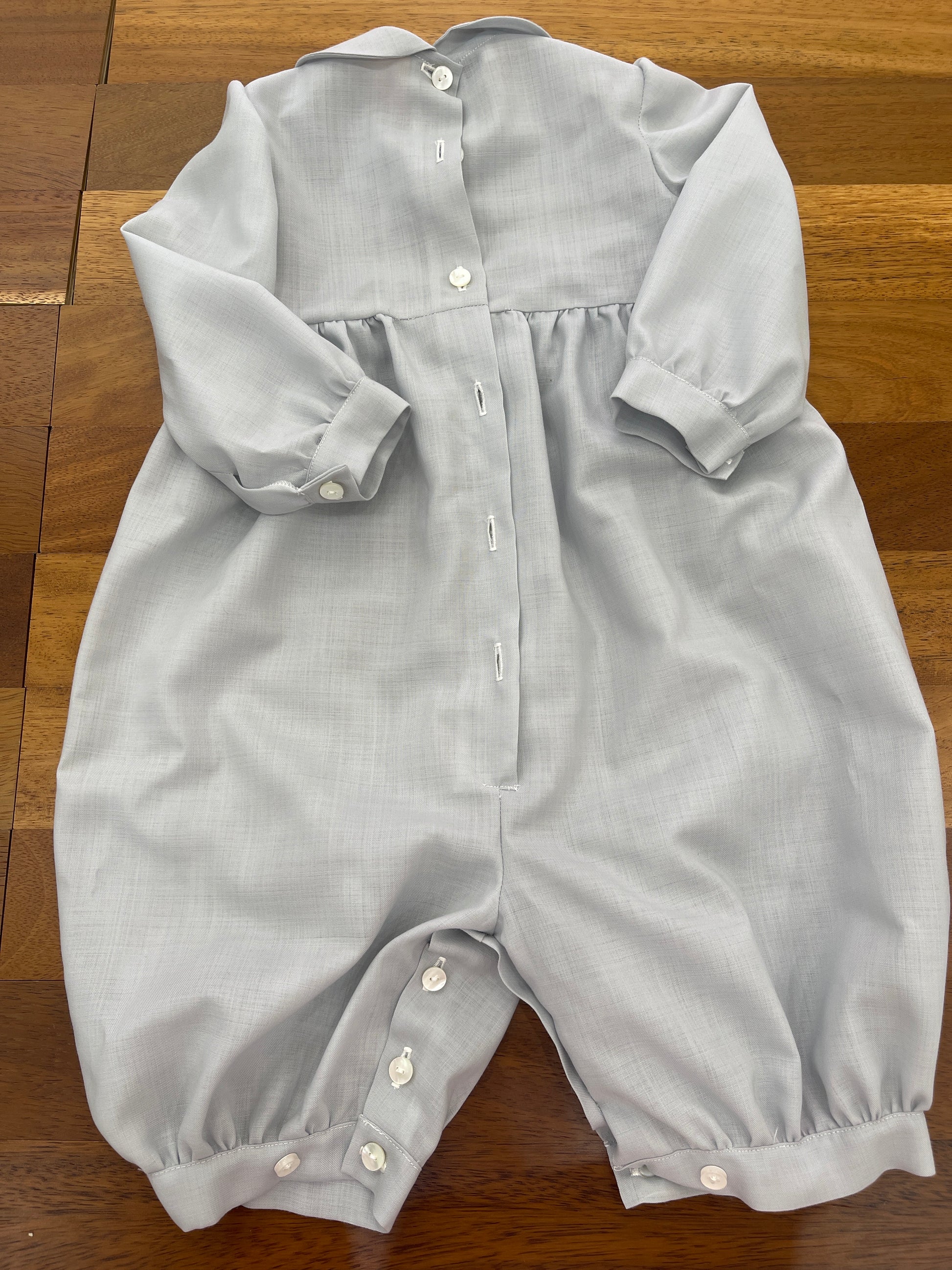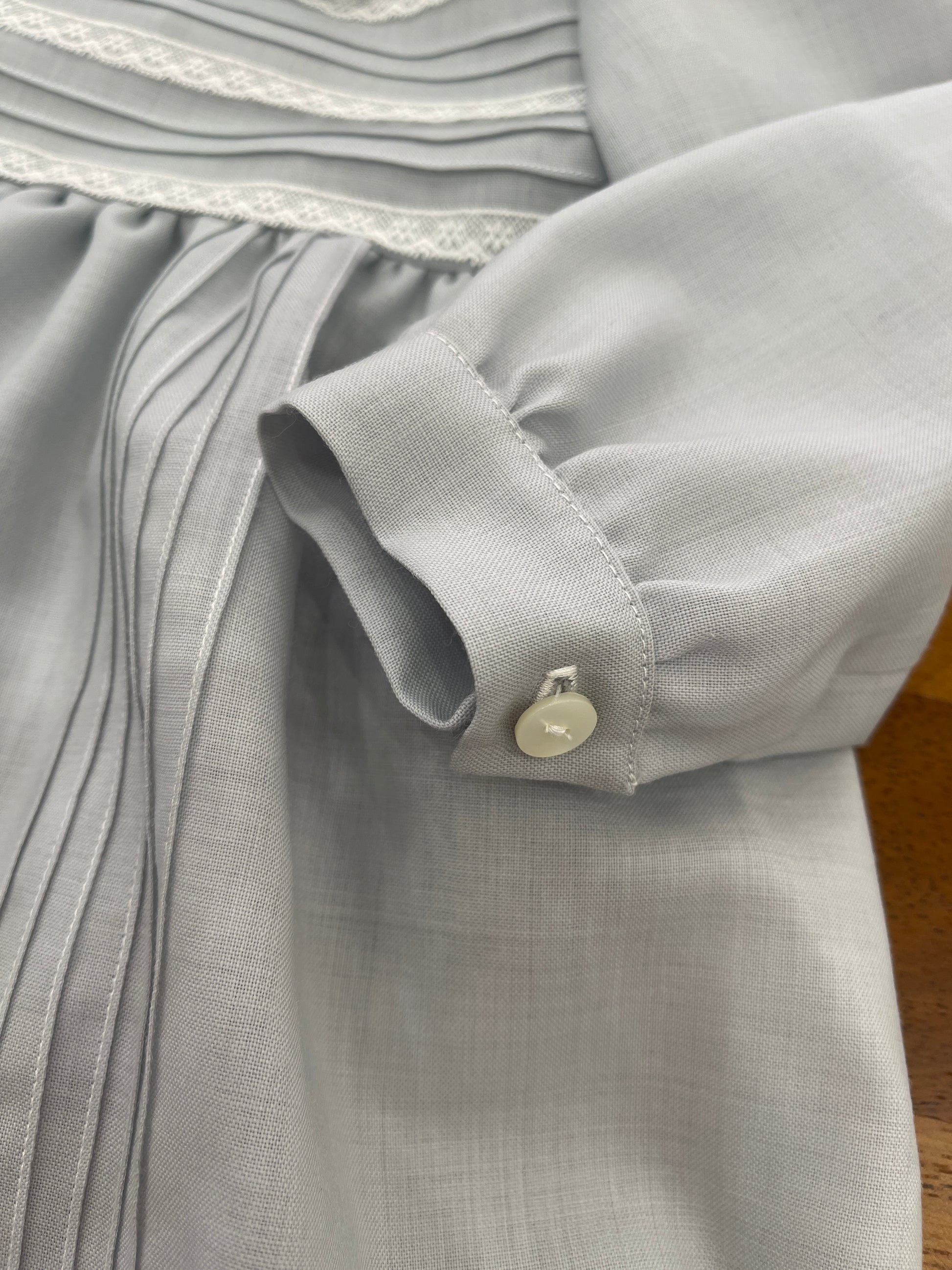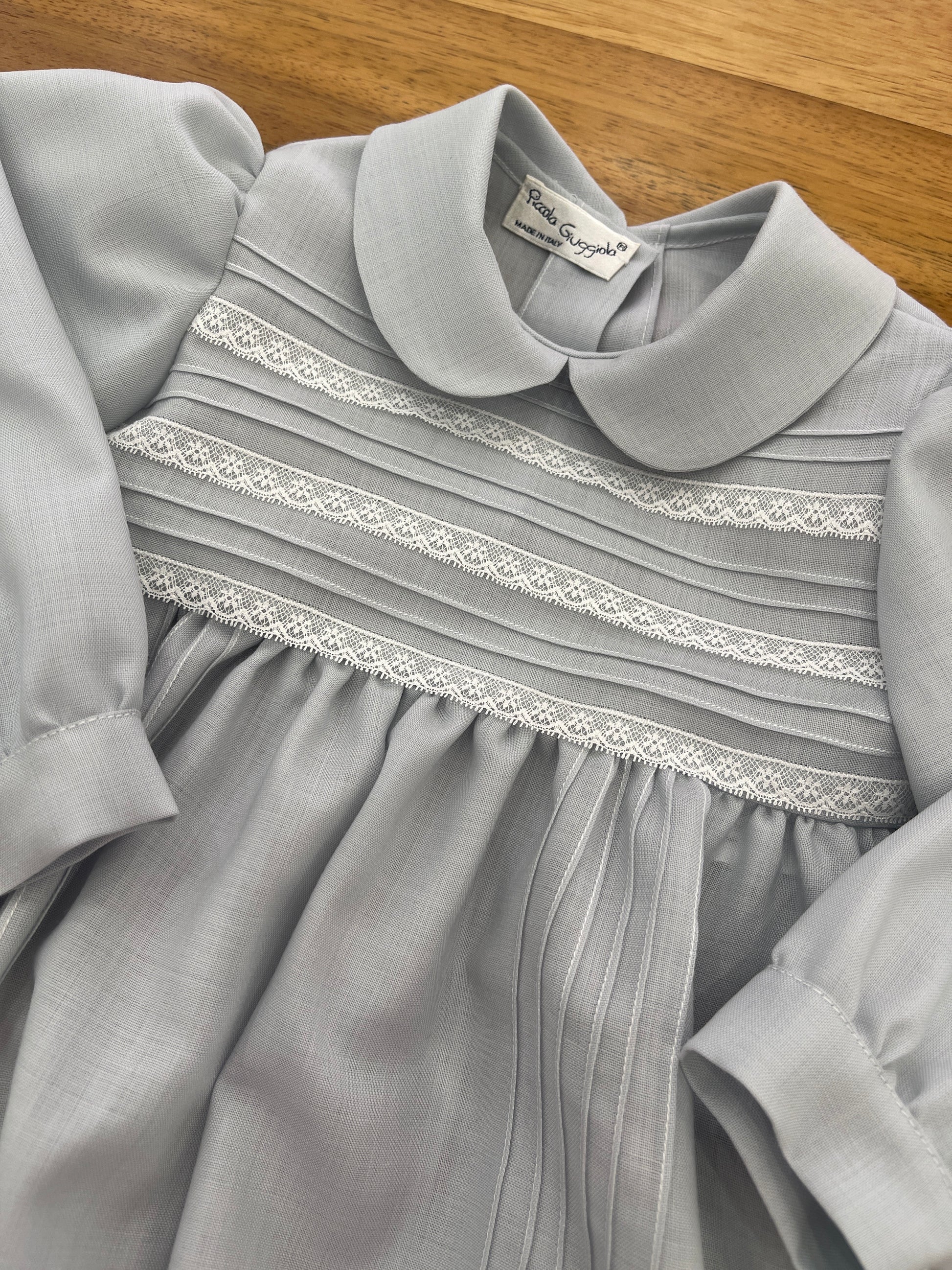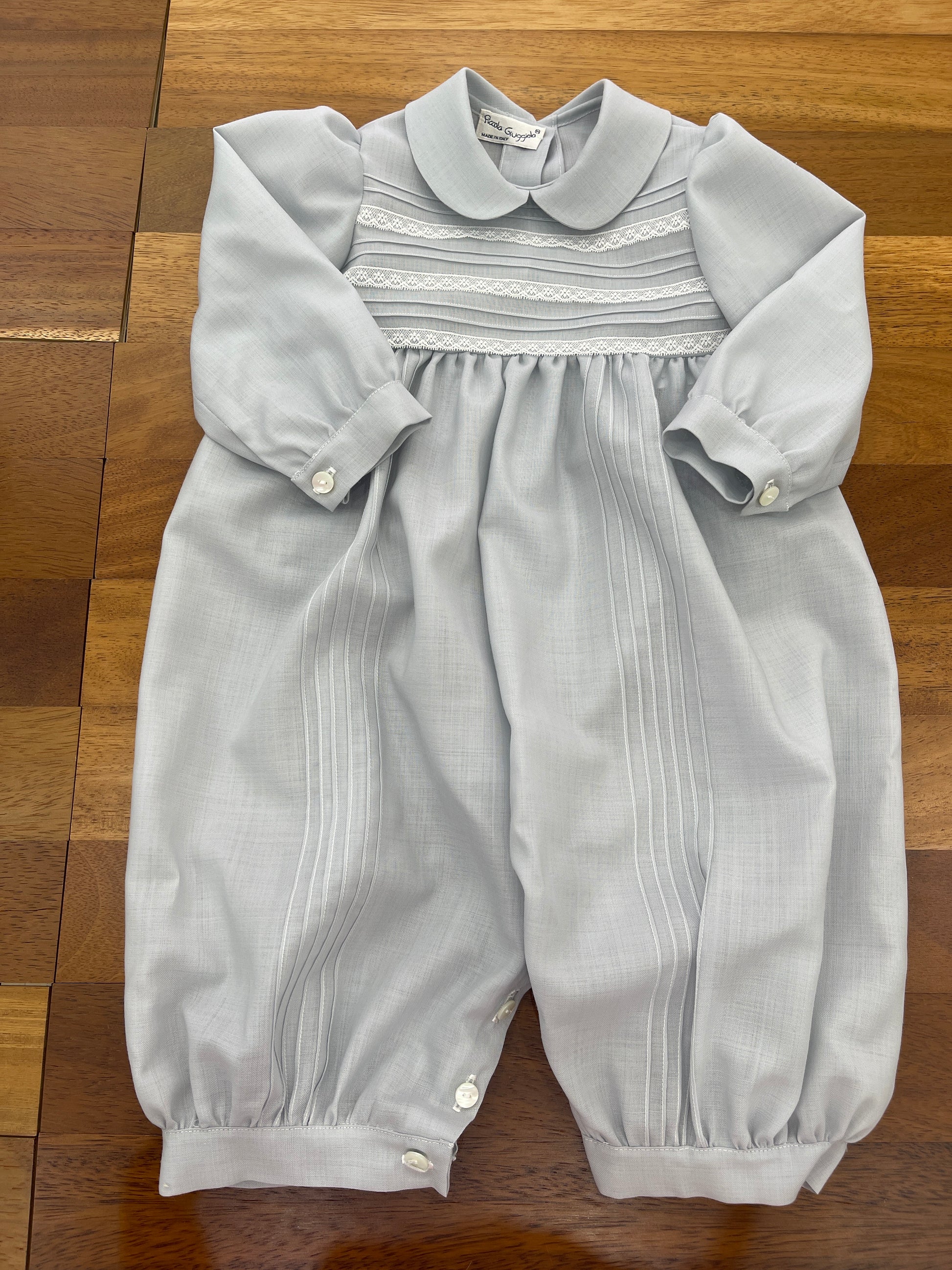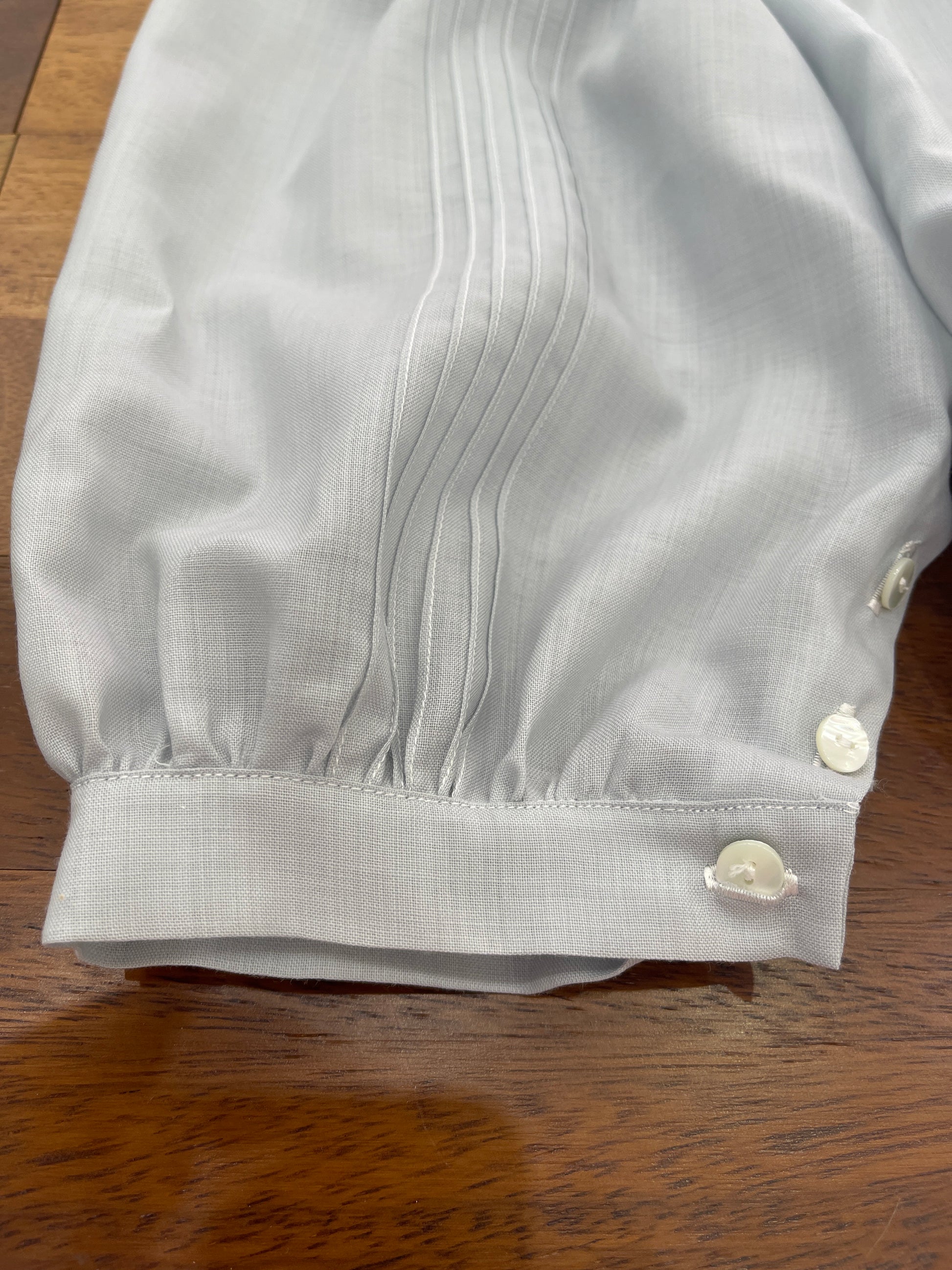 Questo pagliaccetto è realizzato in raffinata organza di seta color celeste polvere, con maniche lunghe e un corpetto ornato da preziosi dettagli in valencienne. Il modello presenta un colletto sobrio, senza decorazioni, e polsini rifiniti su maniche e gambine. Caratterizzato da pieghe sottili sia sul corpetto che sulle gambine, unisce eleganza e cura dei particolari.