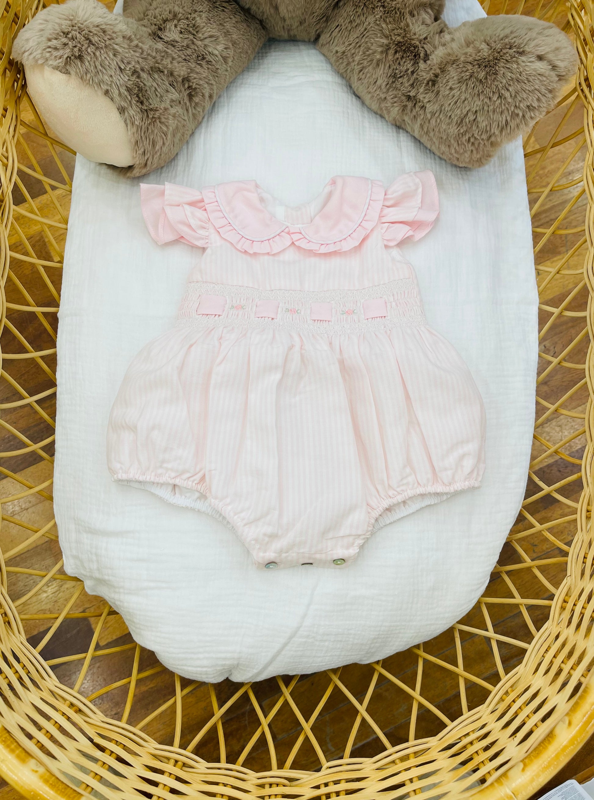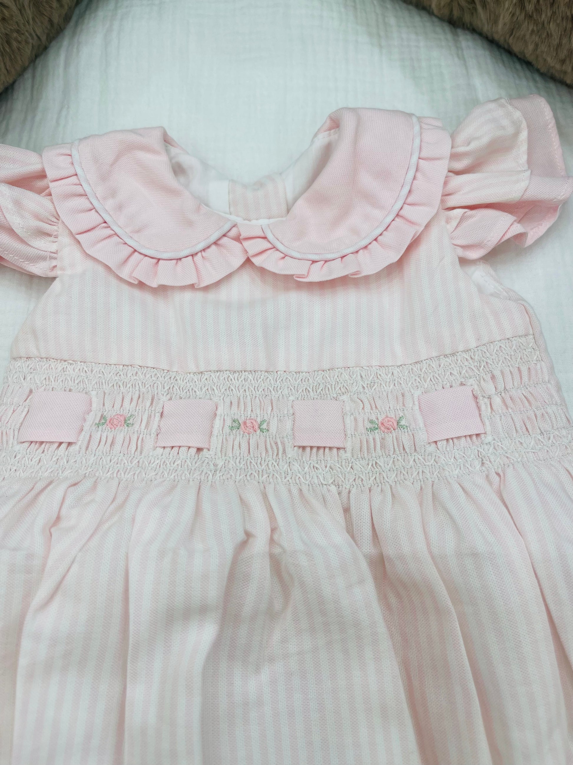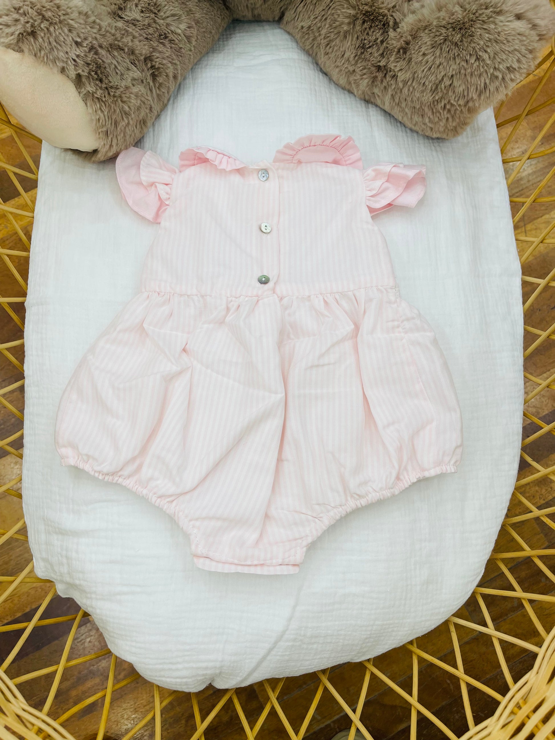 Questo pagliaccetto Fofettes a righe rosa è perfetto per la tua bambina. Il suo collo e le maniche rouches aggiungono un tocco di eleganza, mentre il punto vita porta questo punto smok e passanastro con deliziose rosselline ricamate per un tocco di dolcezza.