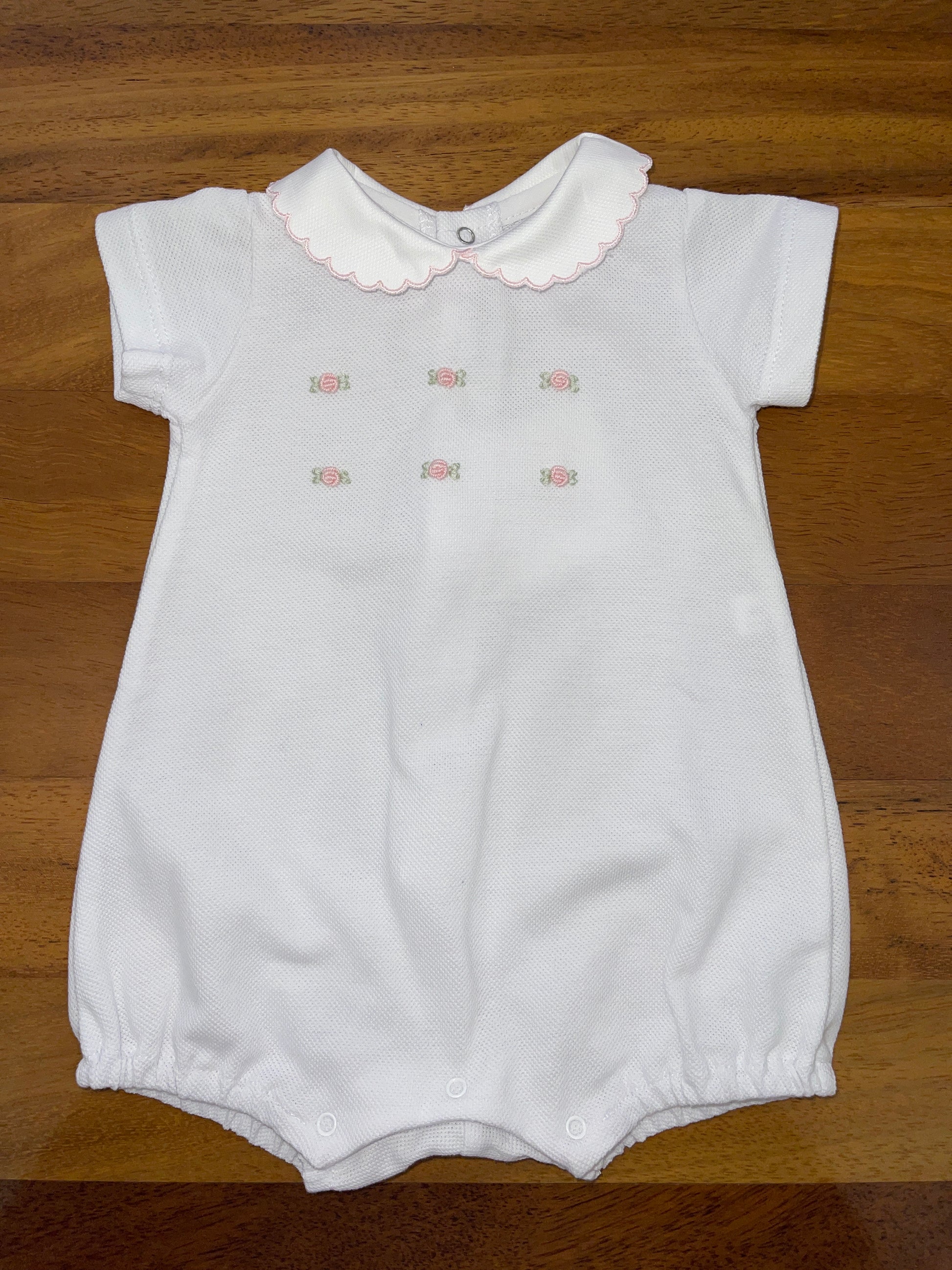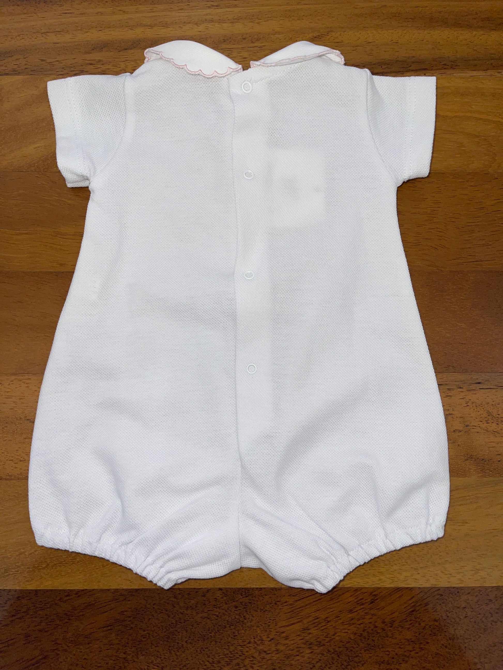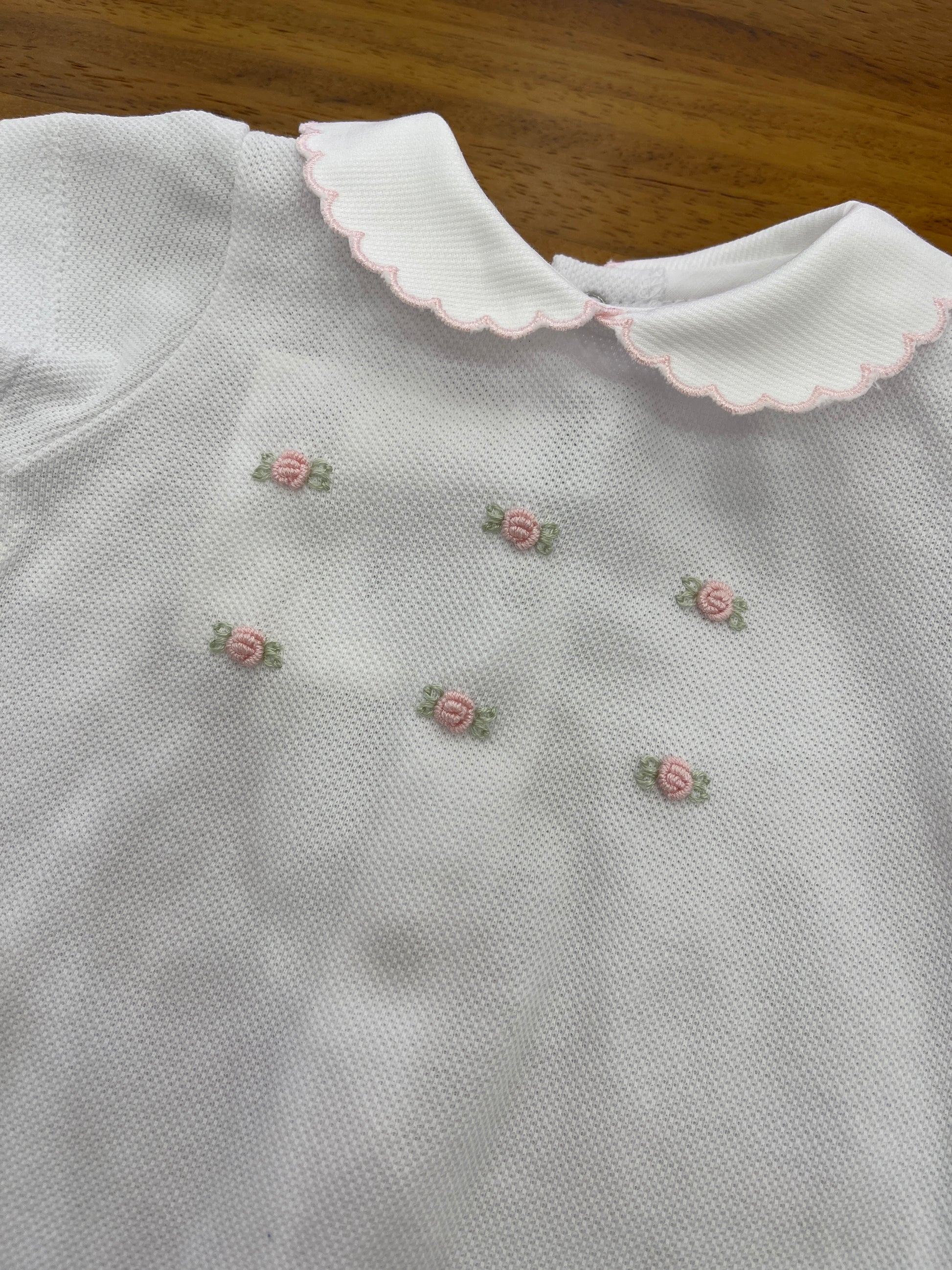 Pagliacetto in piquet con collo smerlato, ricamato a mano con 6 Rossellina sul davanti. Perfetto per un look elegante e classico.