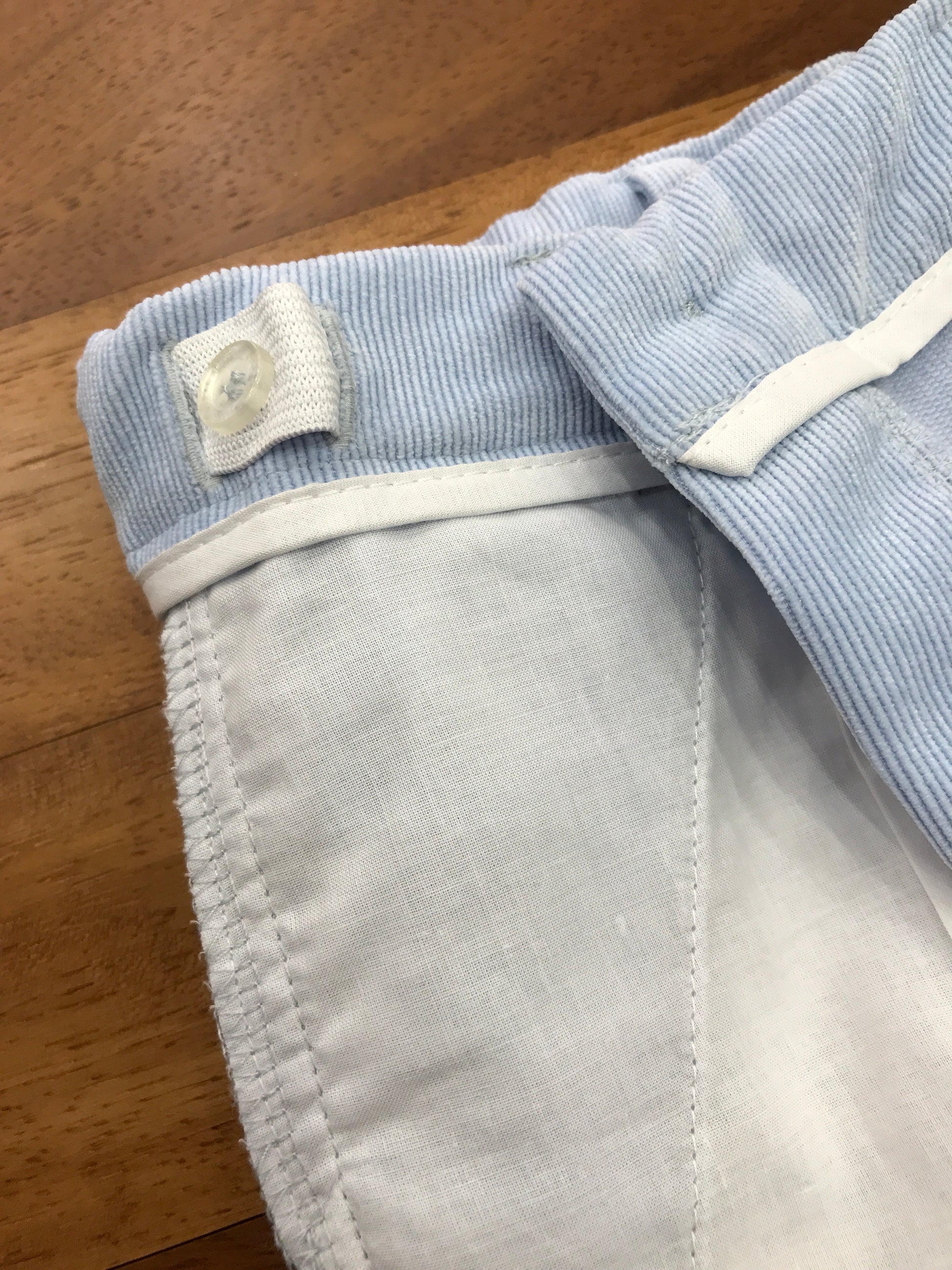 Bermuda stile inglese in velluto a coste azzurro, dotato di passacintura, due bottoni laterali vicino all’orlo e chiusura con zip e bottone. All’interno include un elastico regolabile con bottone, per una vestibilità personalizzata.