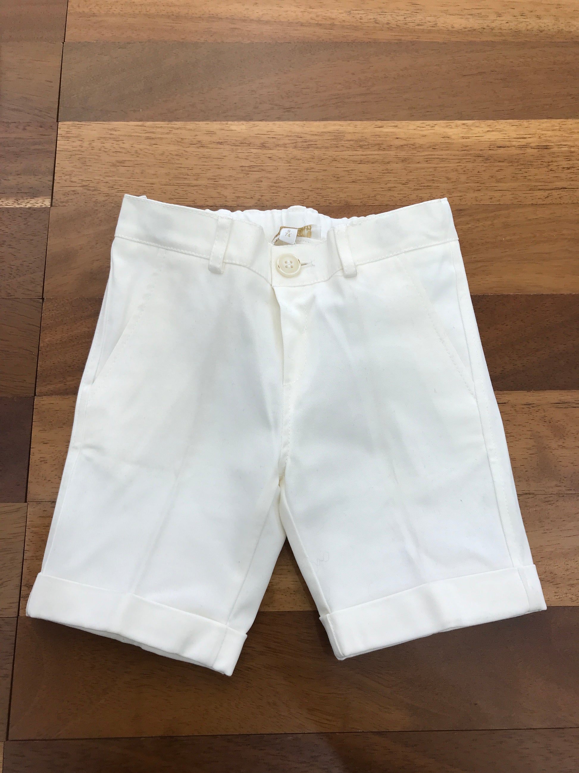 Bermuda in velluto color panna, dotati di bottone frontale, passanti per cintura e un elastico interno che permette di regolare perfettamente la vestibilità.