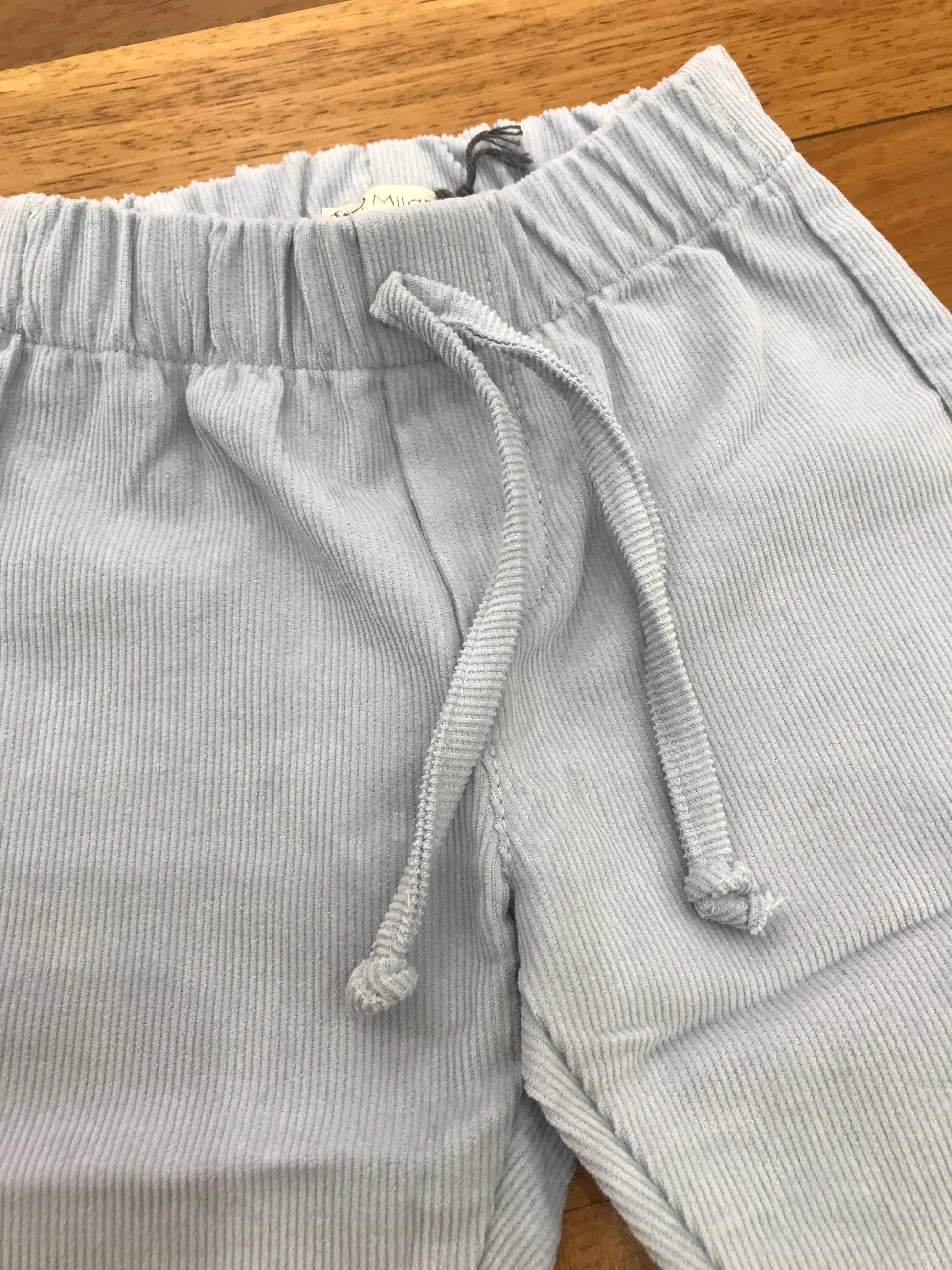 Pantalone lungo in vellutino a coste colore celeste, dotato di elastico in vita e due laccetti frontali per un raffinato fiocco decorativo.
