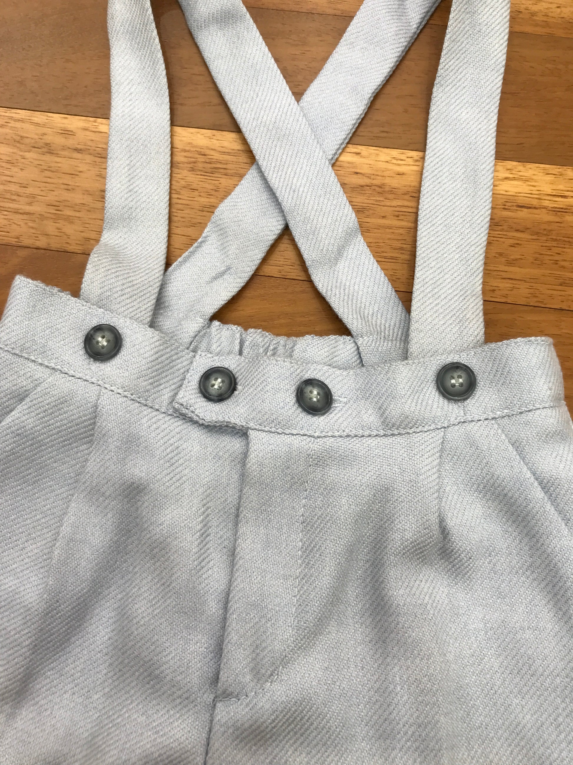 Questi pantaloni in panno color cielo presentano polsini aderenti alle caviglie, tasche sia sul davanti che sul retro, una vita elasticizzata e bretelle regolabili per una vestibilità personalizzata.