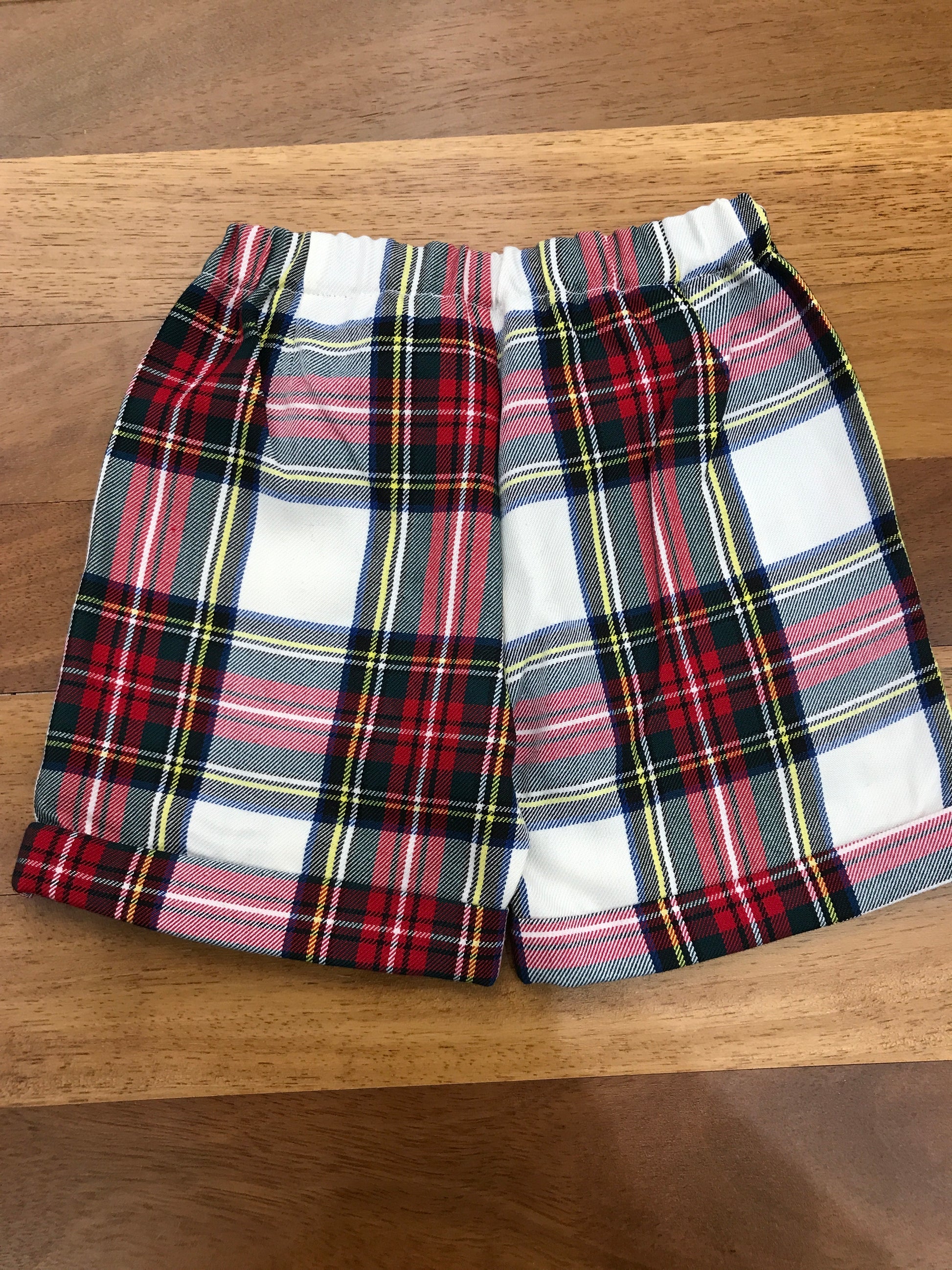 Bermuda a fantasia scozzese con vita elasticizzata, dotati di piccoli bottoncini per la chiusura, due taschine discrete e risvolto sulle estremità delle gambe.