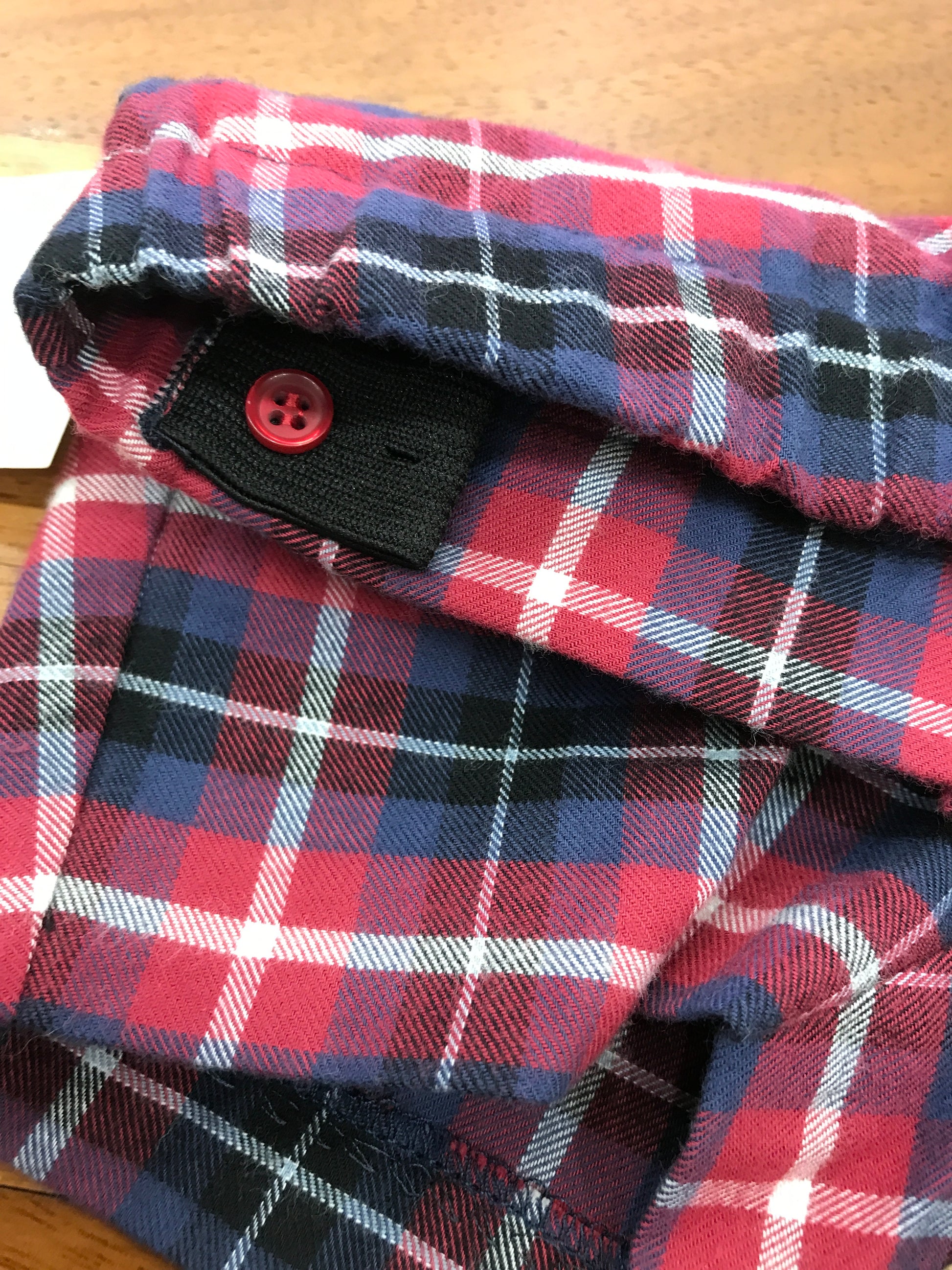 Pantalone in cotone dal motivo scozzese con prevalenza di rosso e blu, chiuso da un piccolo bottone rosso. All'interno è dotato di elastico regolabile con bottoncini per una vestibilità su misura.
