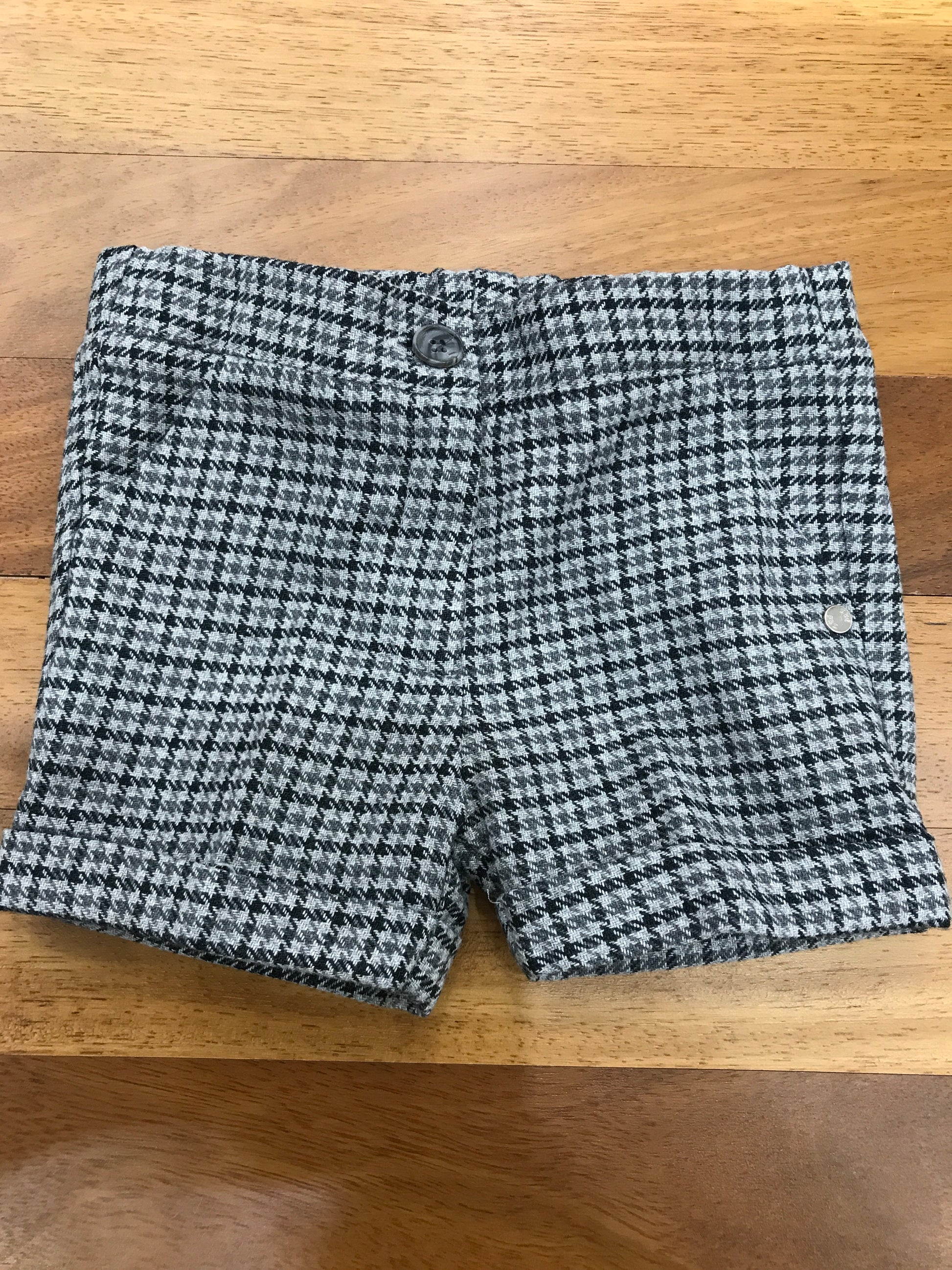 Pantalone in tessuto grigio completo di dettagli neri, dotato di risvolto inferiore, elastico in vita e bottoncini interni per una regolazione personalizzata della vestibilità.