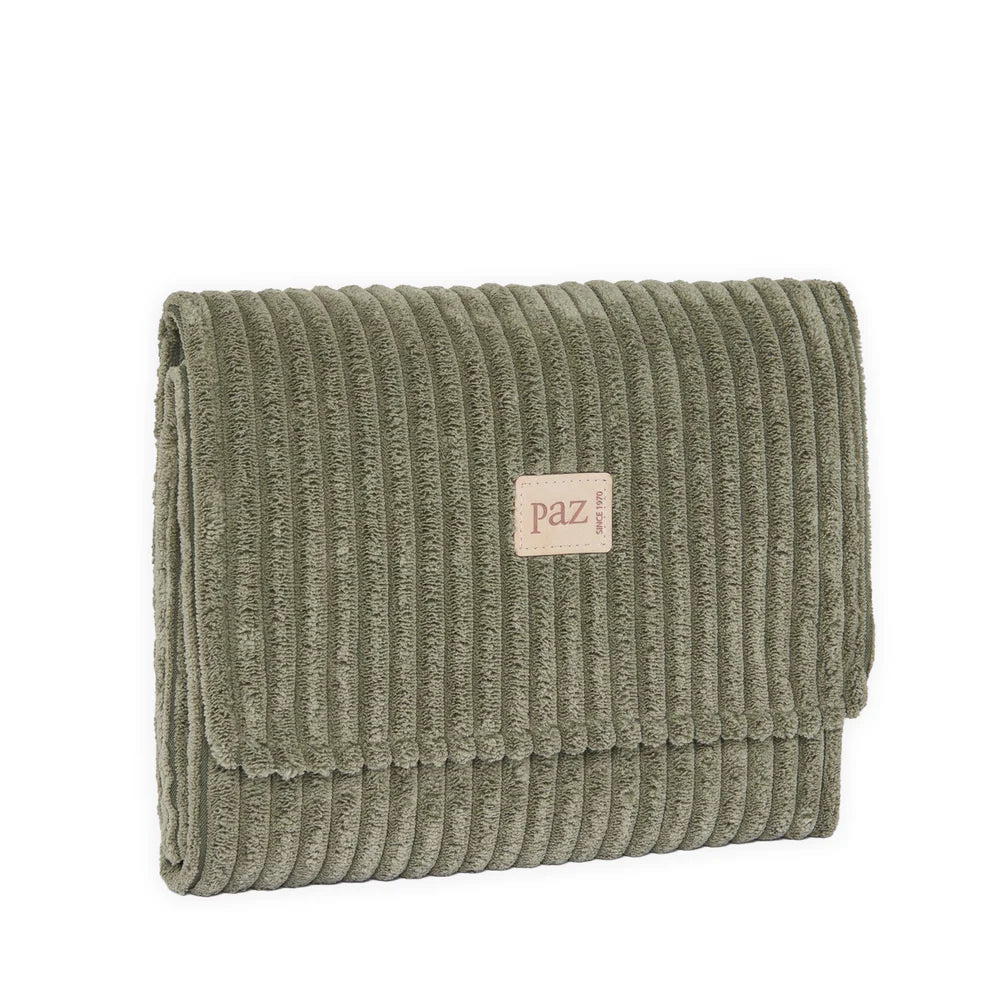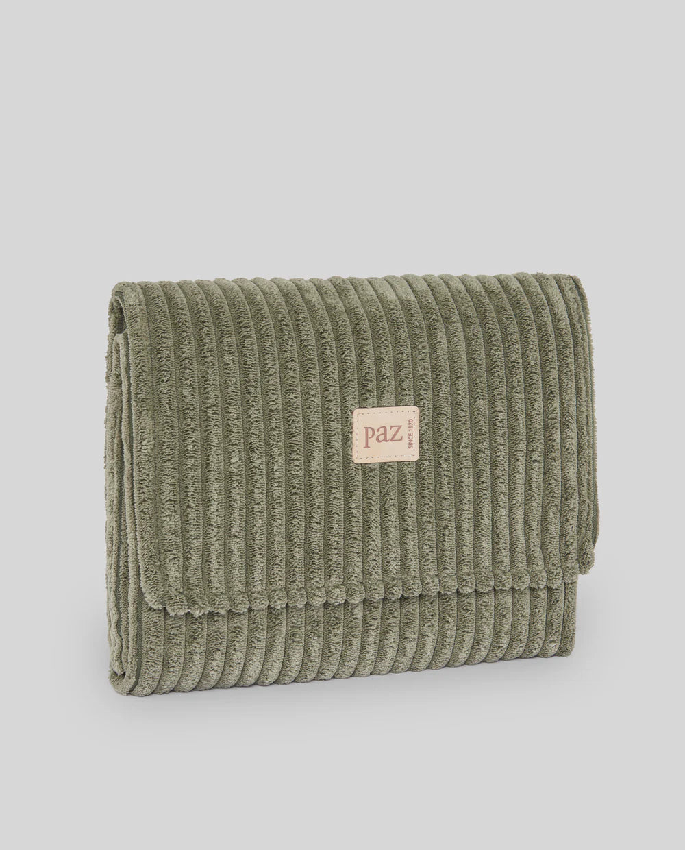Cambia pannolini pieghevole imbottito in velluto a coste larghe. Interno impermeabile e facile da pulire. Chiusura con calamita per maggiore comodità.