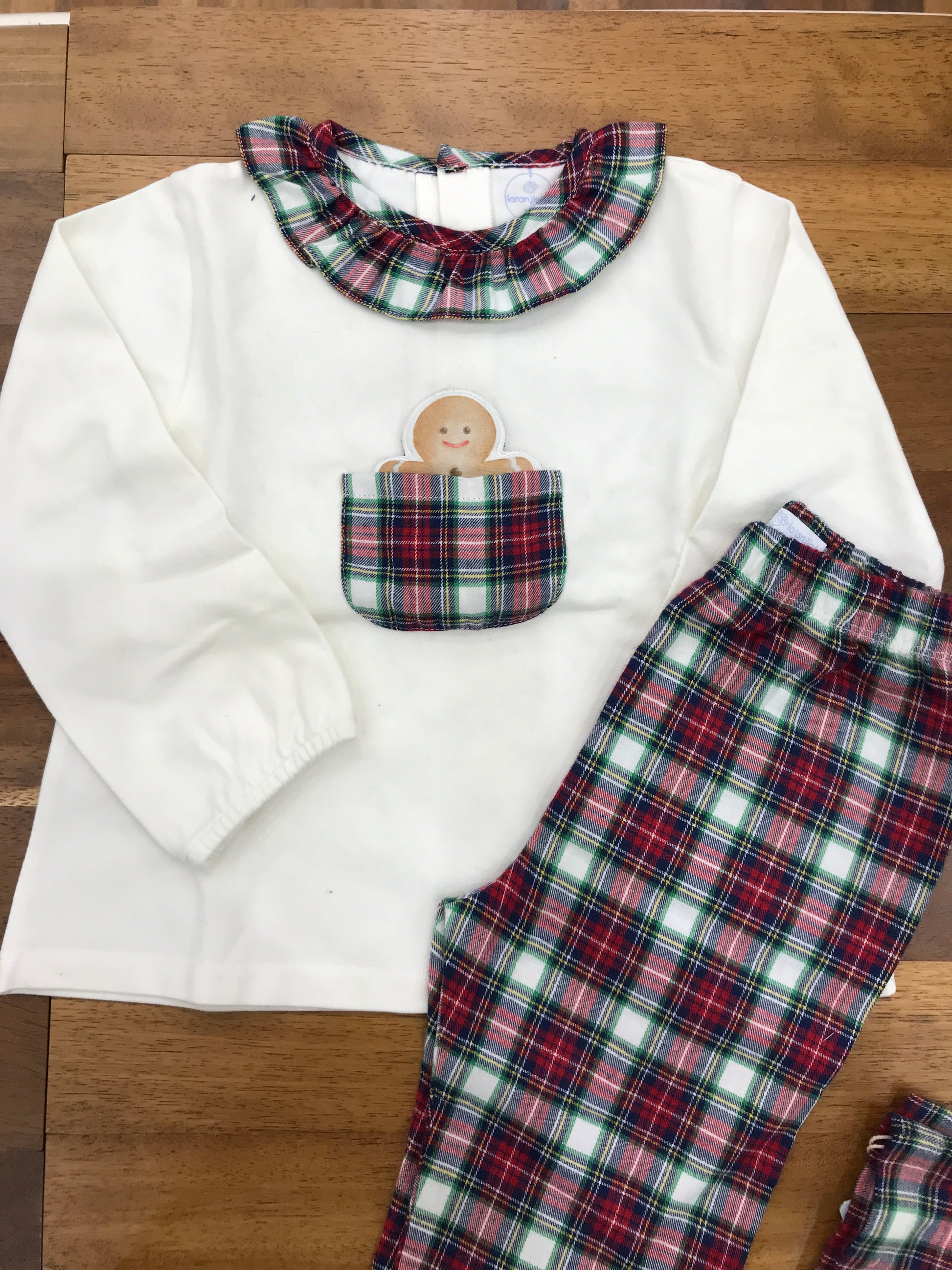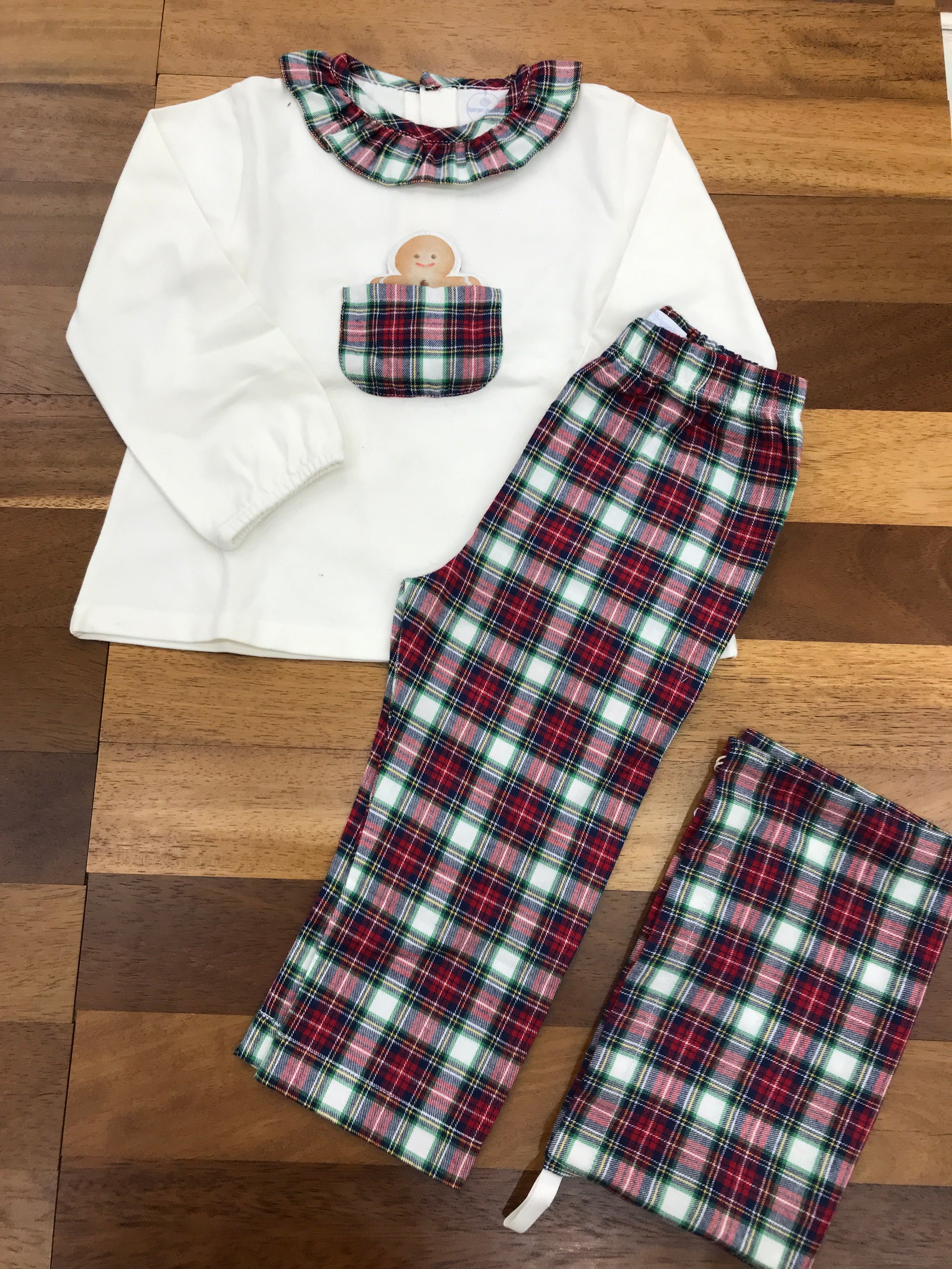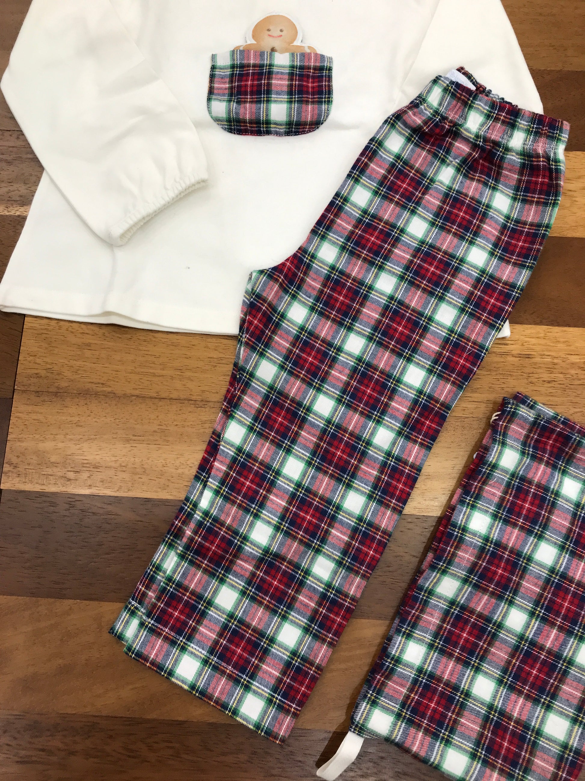 Pigiama in morbida ciniglia con pantalone a quadri scozzesi nelle tonalità rosso, bianco e verde. La maglietta bianca presenta polsini elasticizzati alle maniche e un colletto con volant scozzese coordinato al pantalone. Un dettaglio esclusivo arricchisce il capo: una piccola tasca sul petto decorata con motivo scozzese che contiene una simpatica figurina di marzapane. Un capo pensato per garantire comfort e calore durante le ore di riposo, con una proposta stilistica che unisce praticità e originalità.