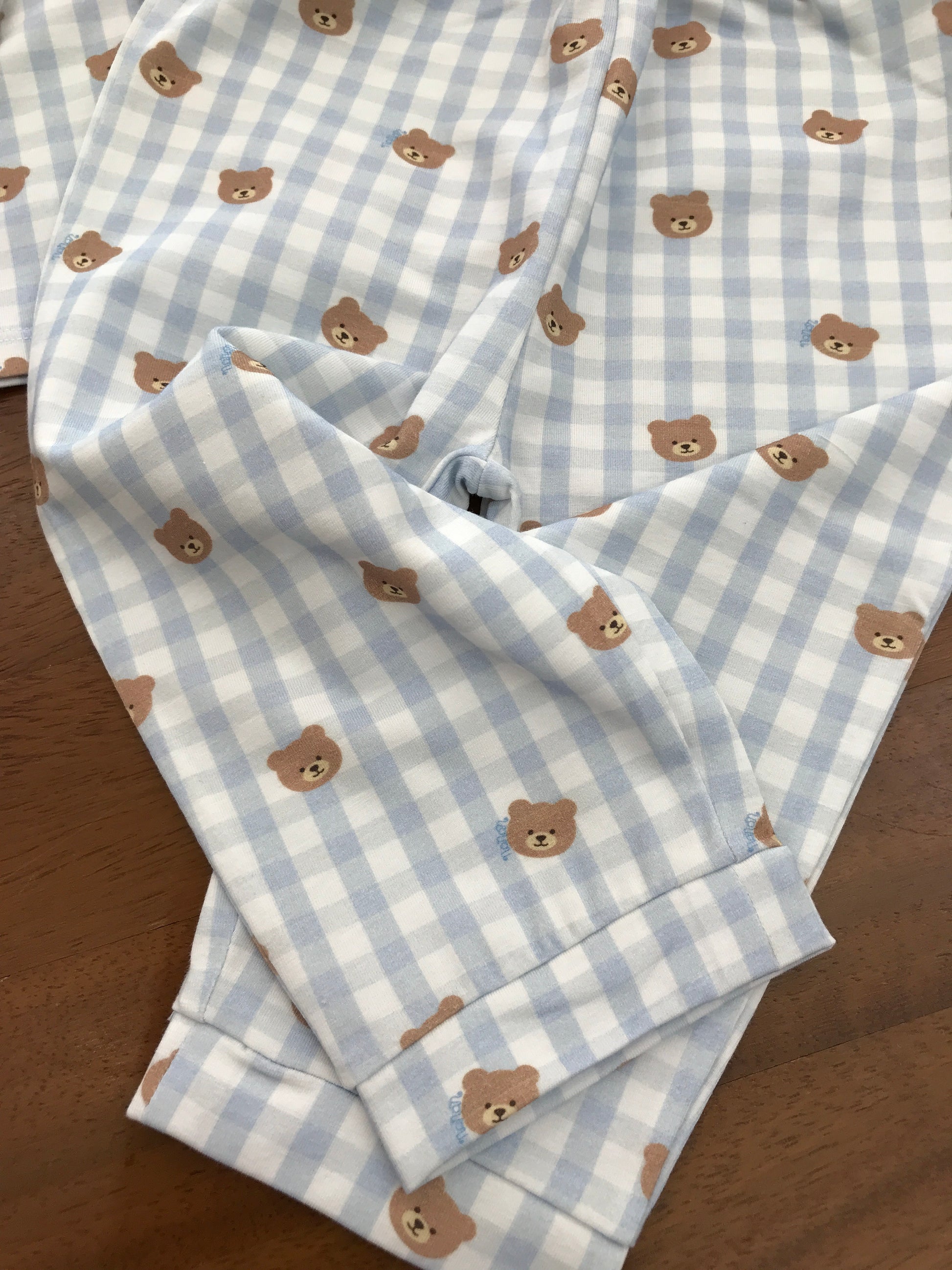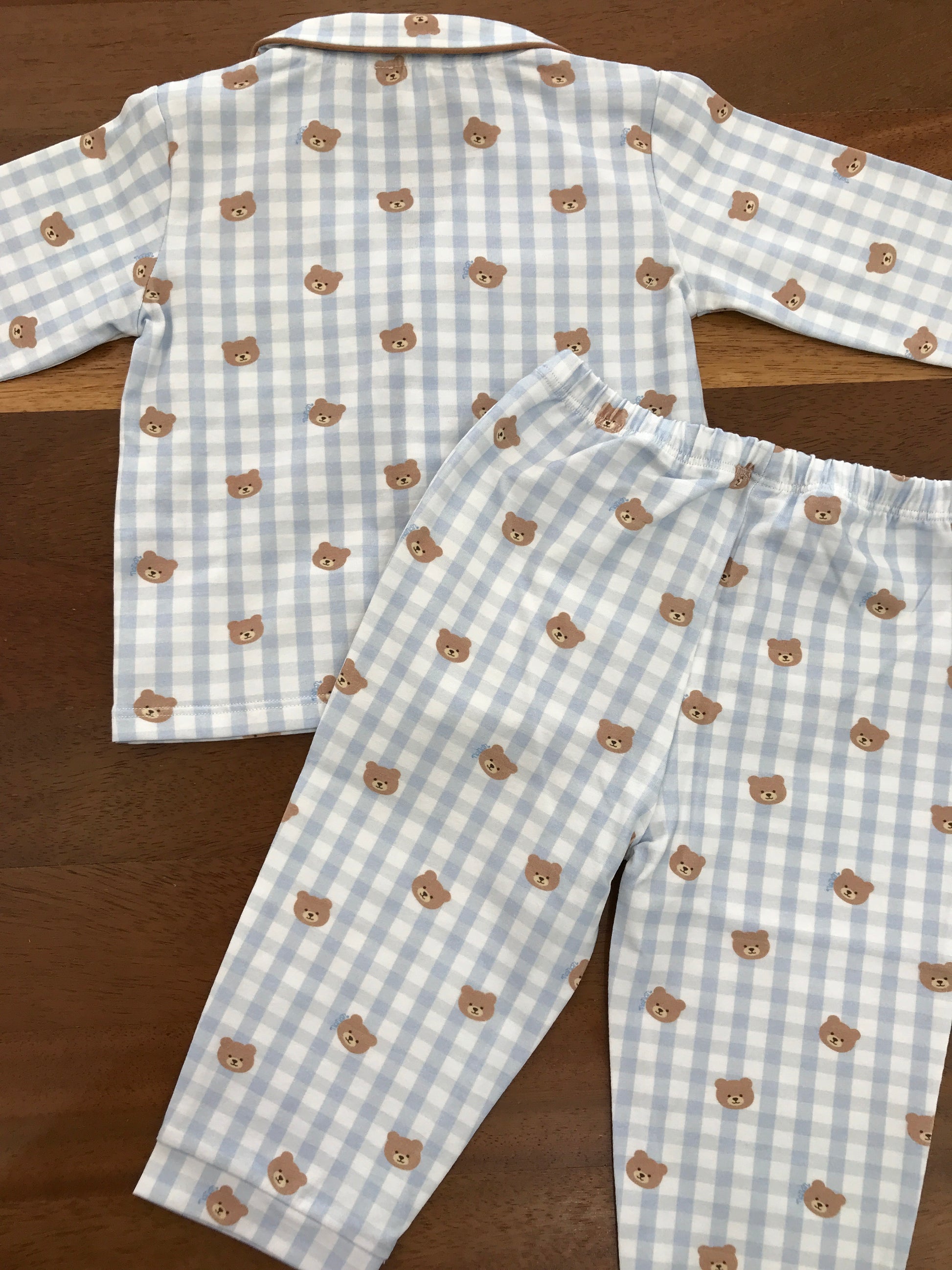 Pigiama Nanan in cotone due pezzi a quadretti bianchi e celesti con piccoli orsetti