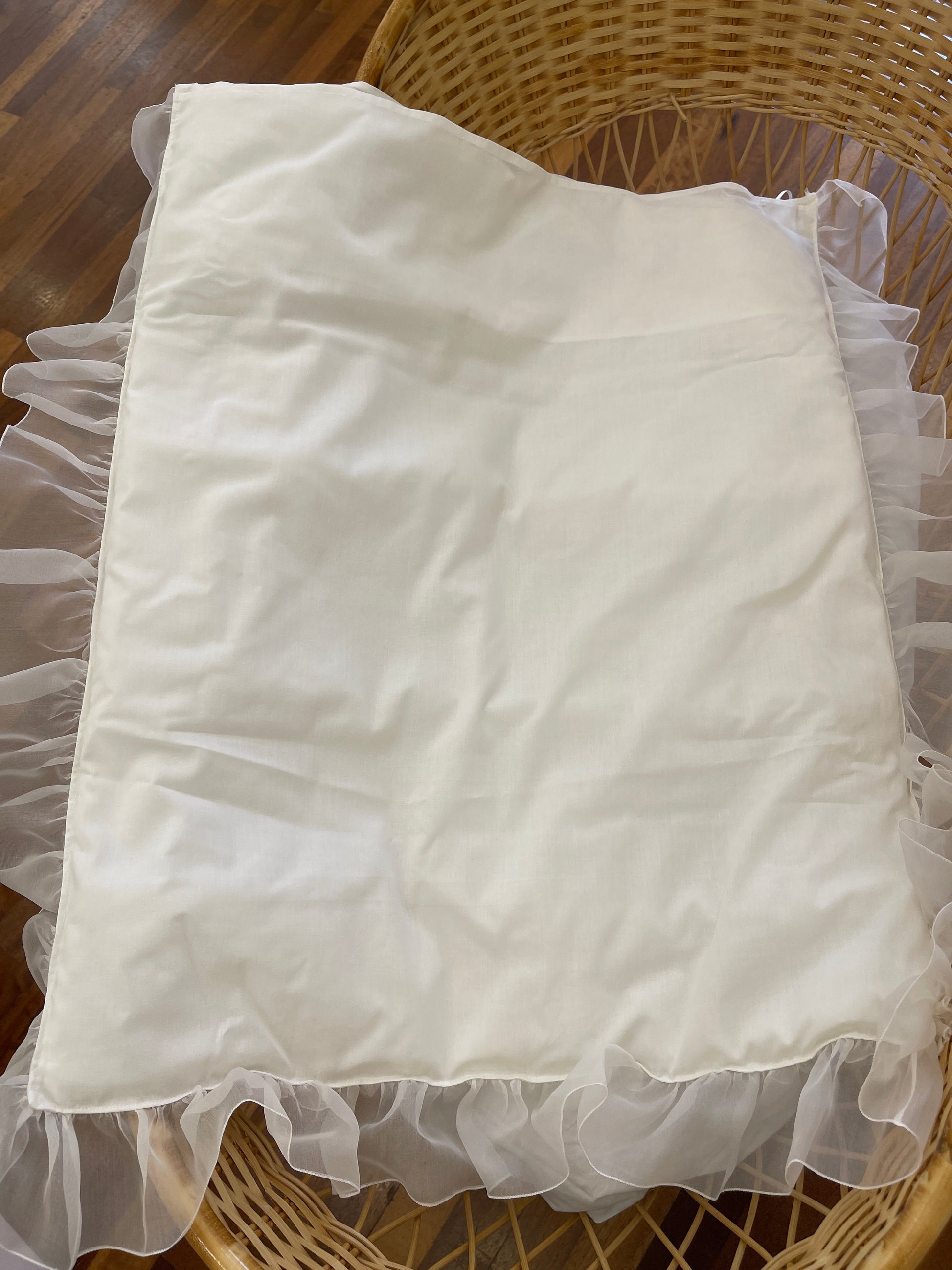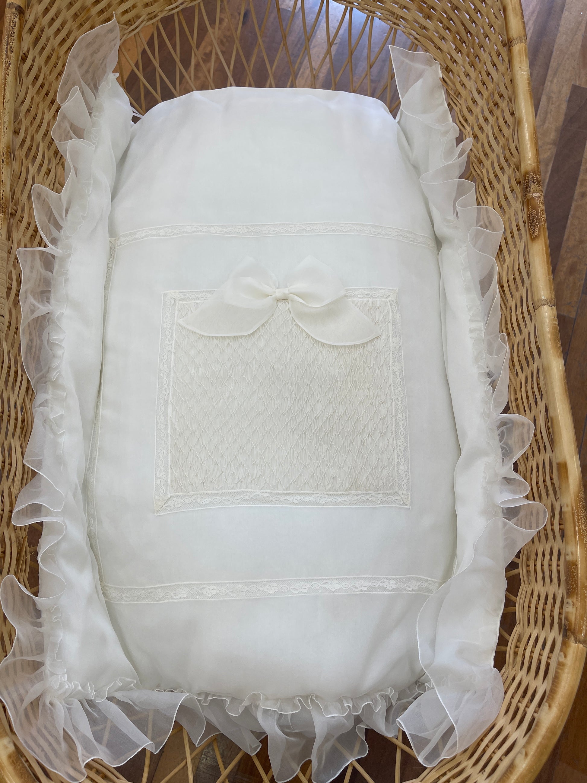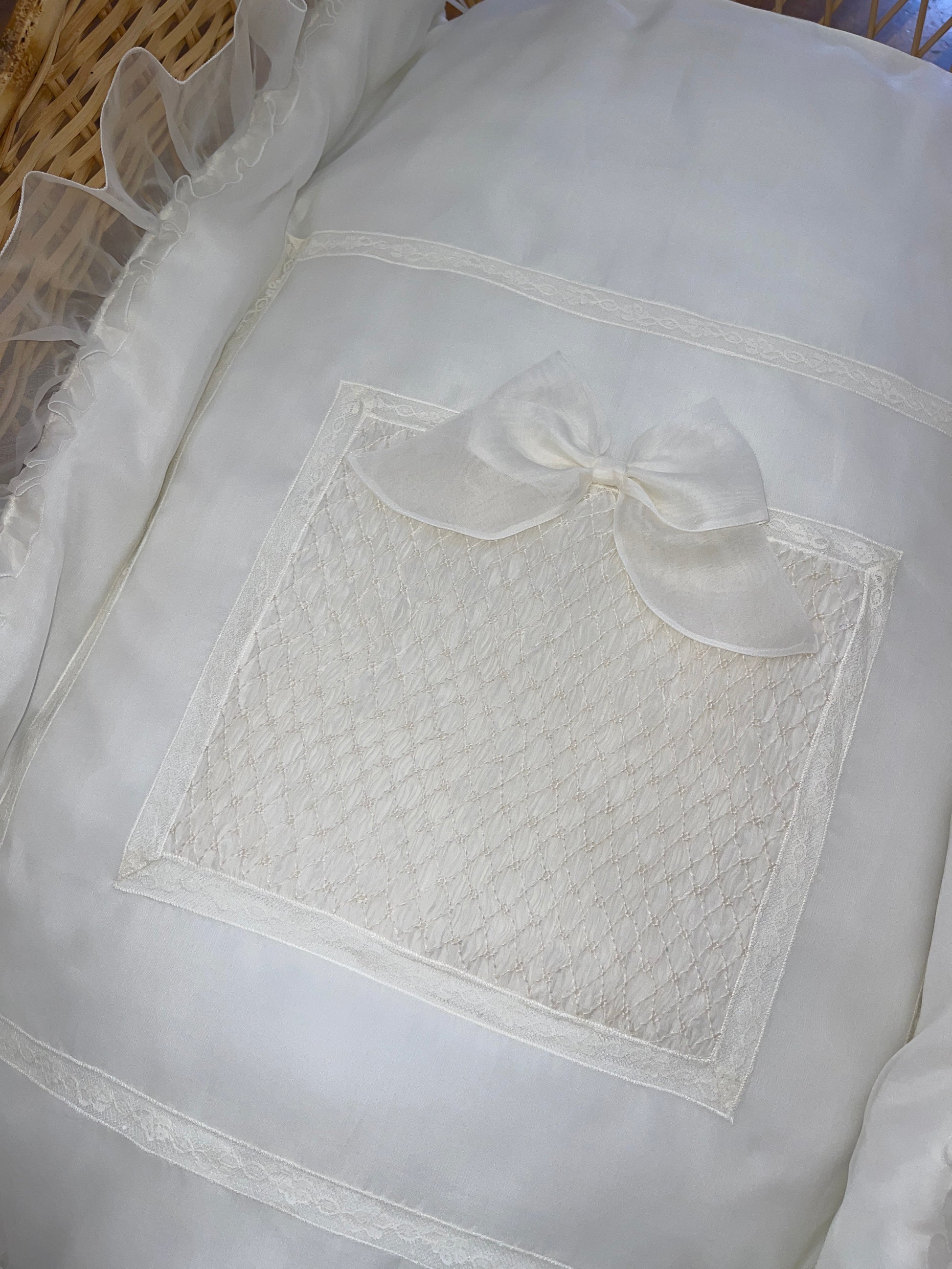 Questo piumoncino in organza di seta si distingue per la raffinata lavorazione artigianale: il rouché in organza impreziosisce i bordi, mentre il centro presenta un elegante quadrato realizzato con punto smok e valencienne, arricchito da delicate applicazioni e un fiocco in organza. Un capo sofisticato, ideale per chi cerca un dettaglio di alta qualità e stile senza tempo.