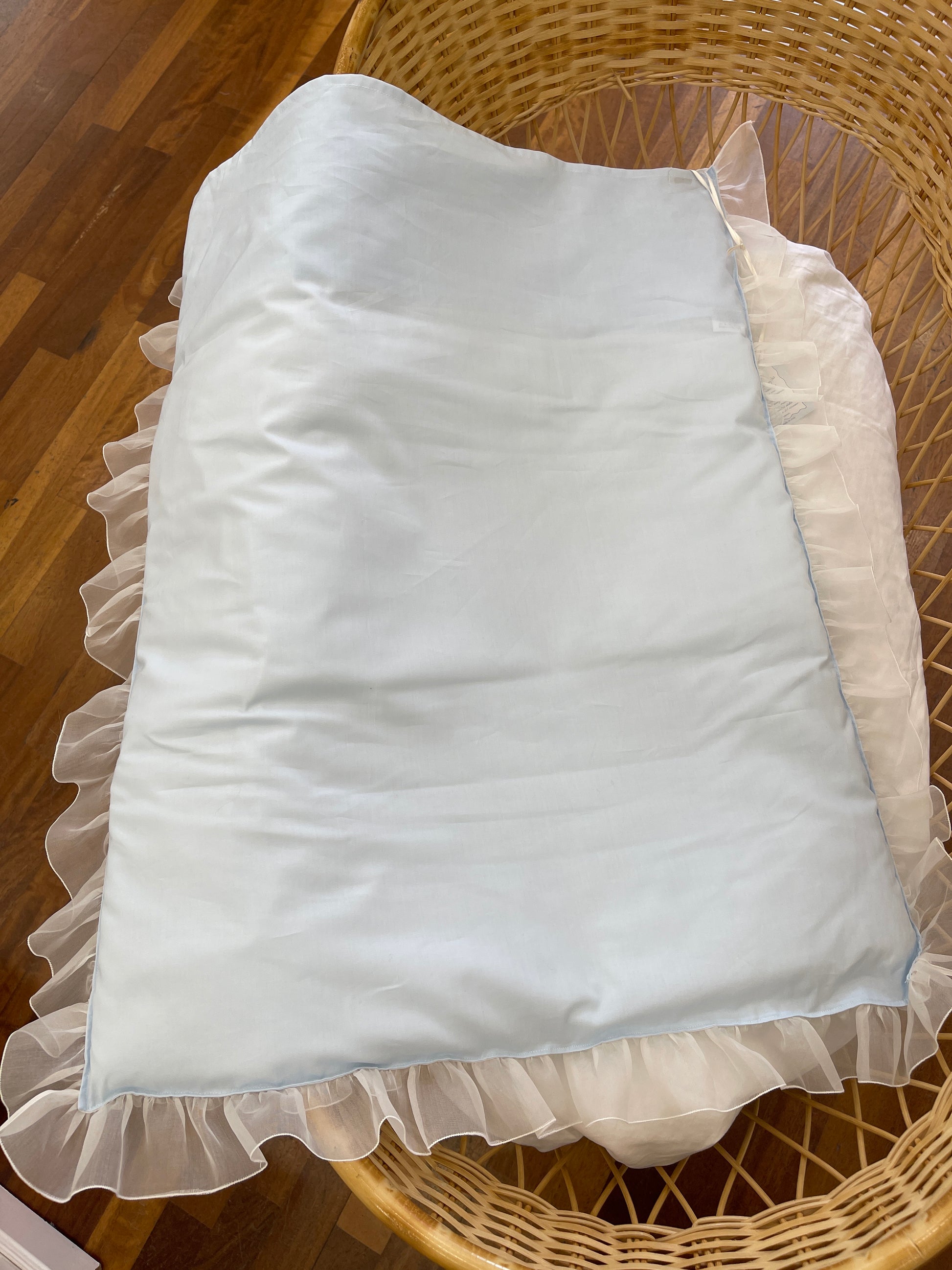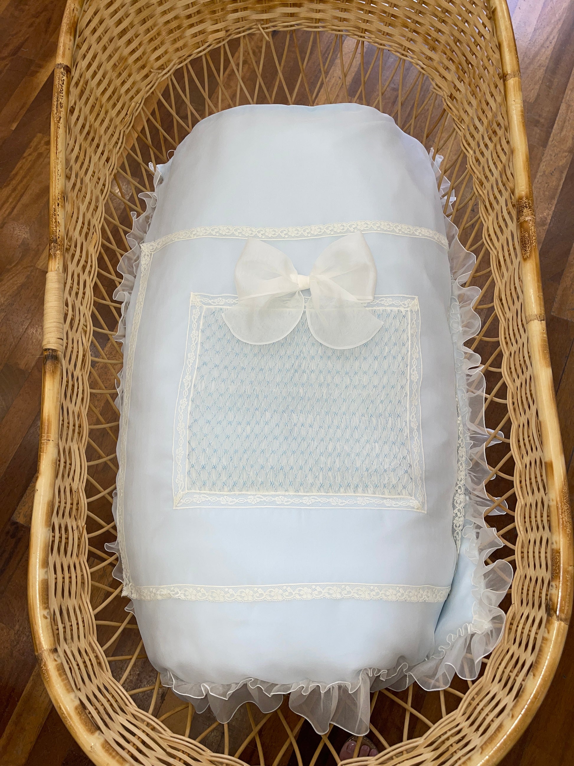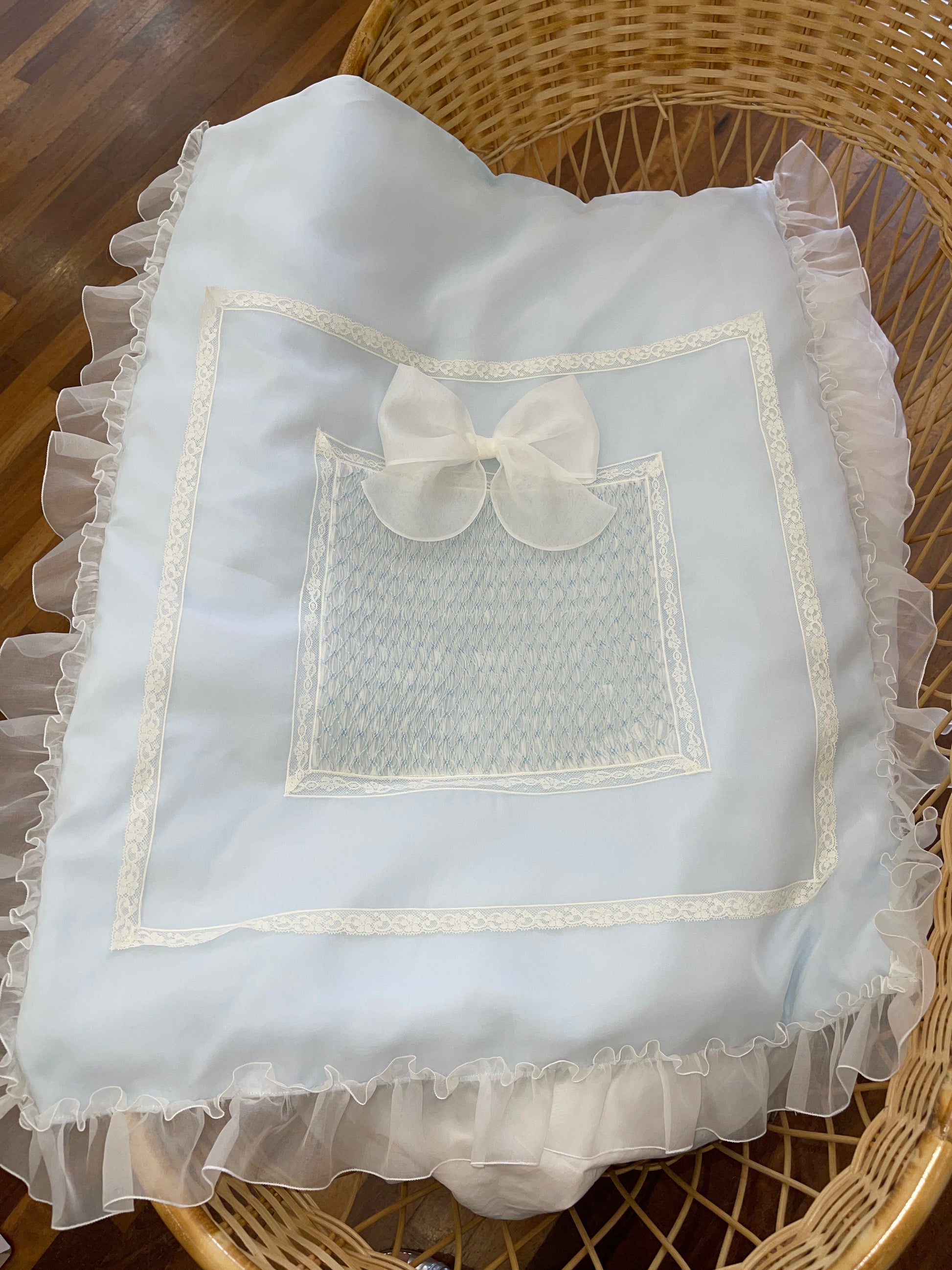 Questo piumoncino in organza di seta si distingue per la raffinata lavorazione artigianale: il rouché in organza impreziosisce i bordi, mentre il centro presenta un elegante quadrato realizzato con punto smok e valencienne, arricchito da delicate applicazioni e un fiocco in organza. Un capo sofisticato, ideale per chi cerca un dettaglio di alta qualità e stile senza tempo.