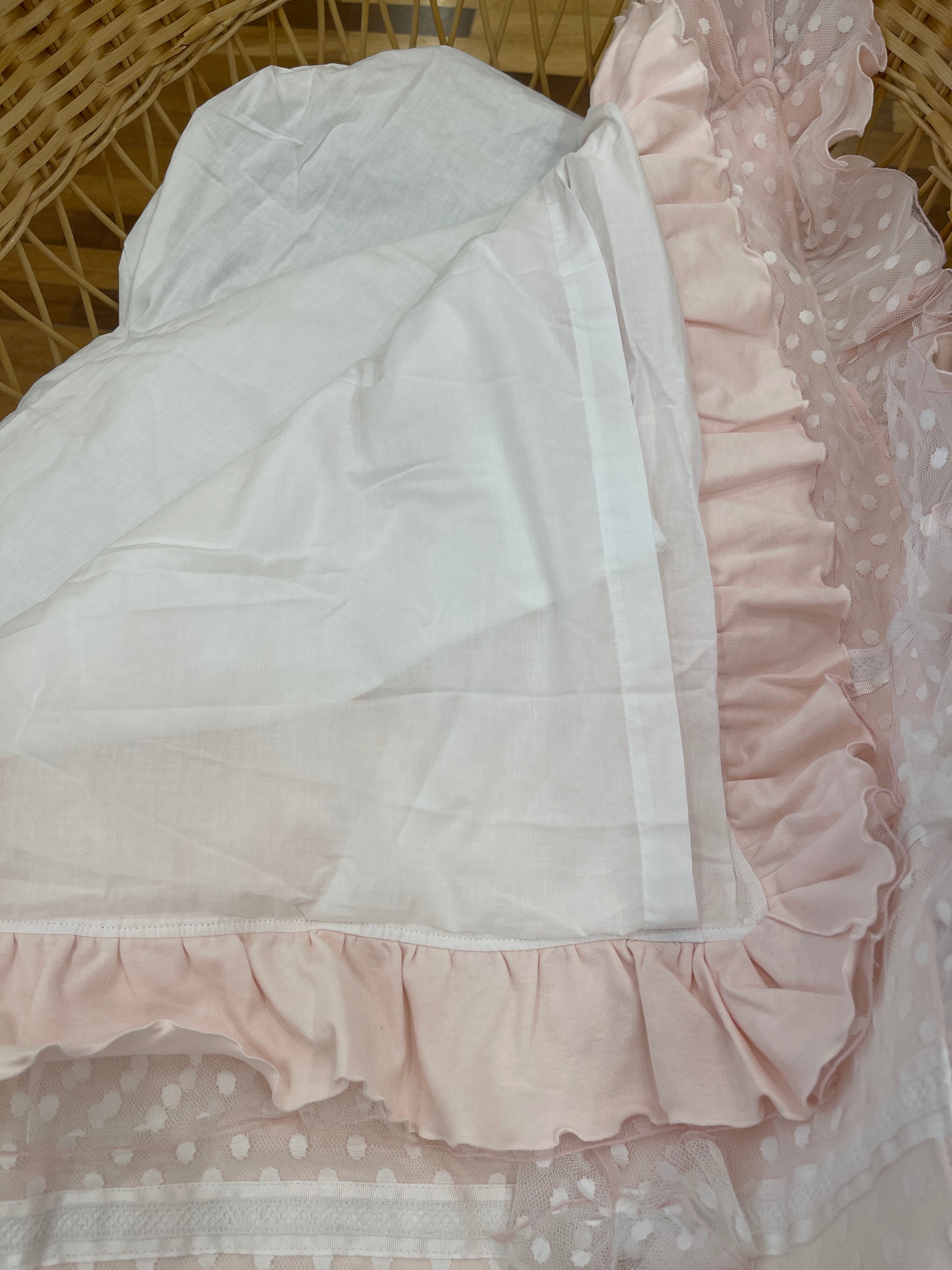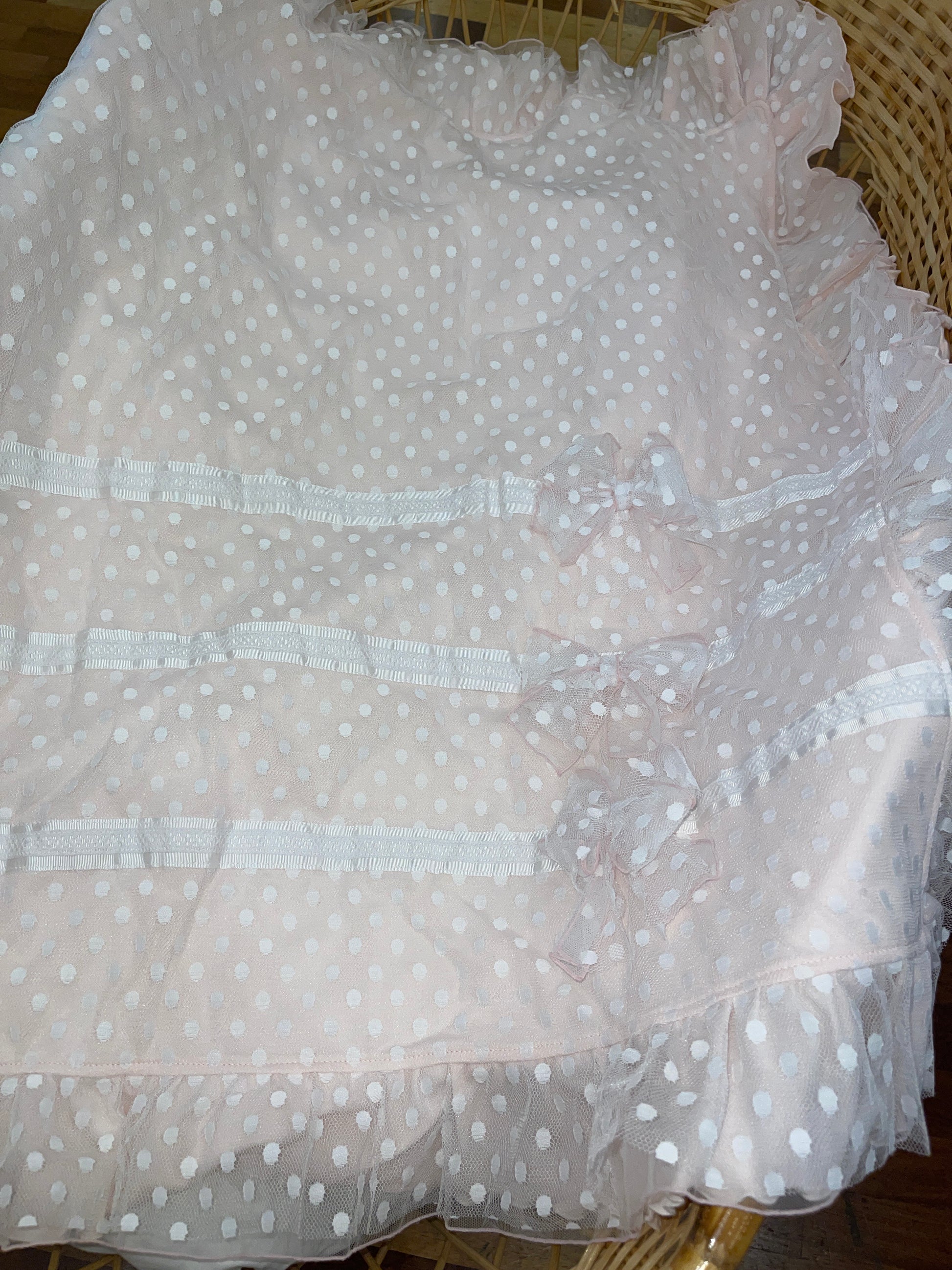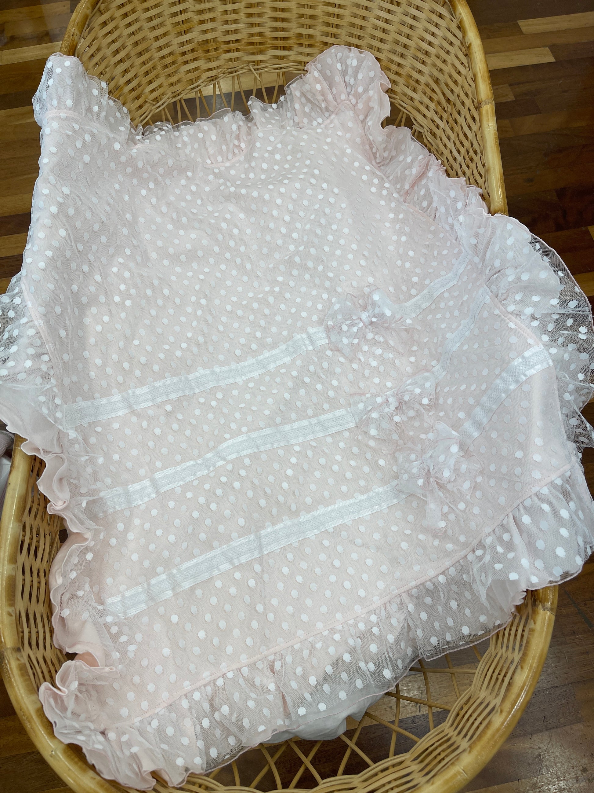 Il Piumoncino cielor rosa è il capo ideale per le giornate più fresche. Realizzato in cotone e ricoperto di tulle a pois, è finemente rifinito con roush nello stesso tessuto, conferendogli un tocco elegante e raffinato. La presenza di tre fiocchi al centro aggiunge un ulteriore dettaglio di stile.