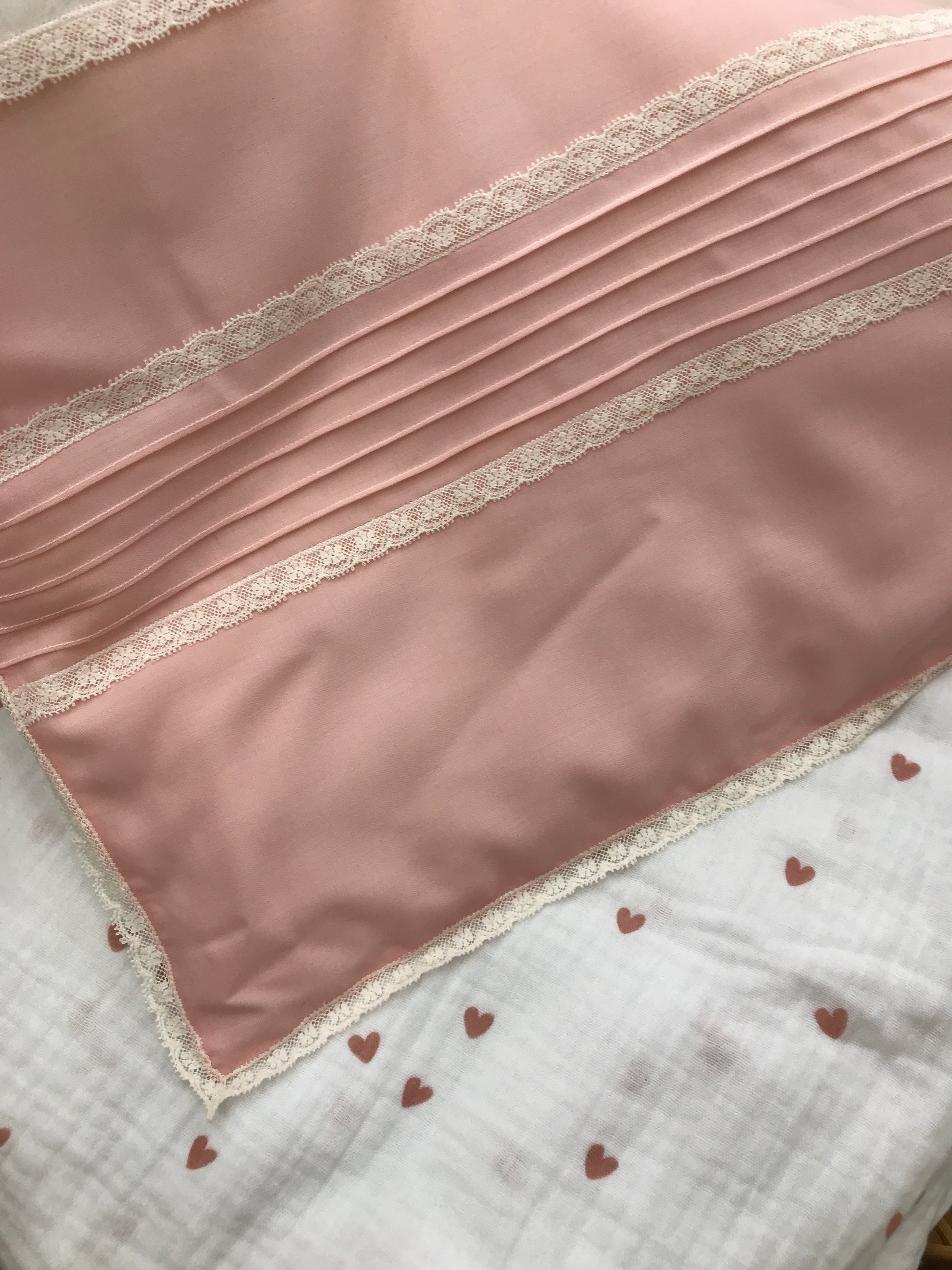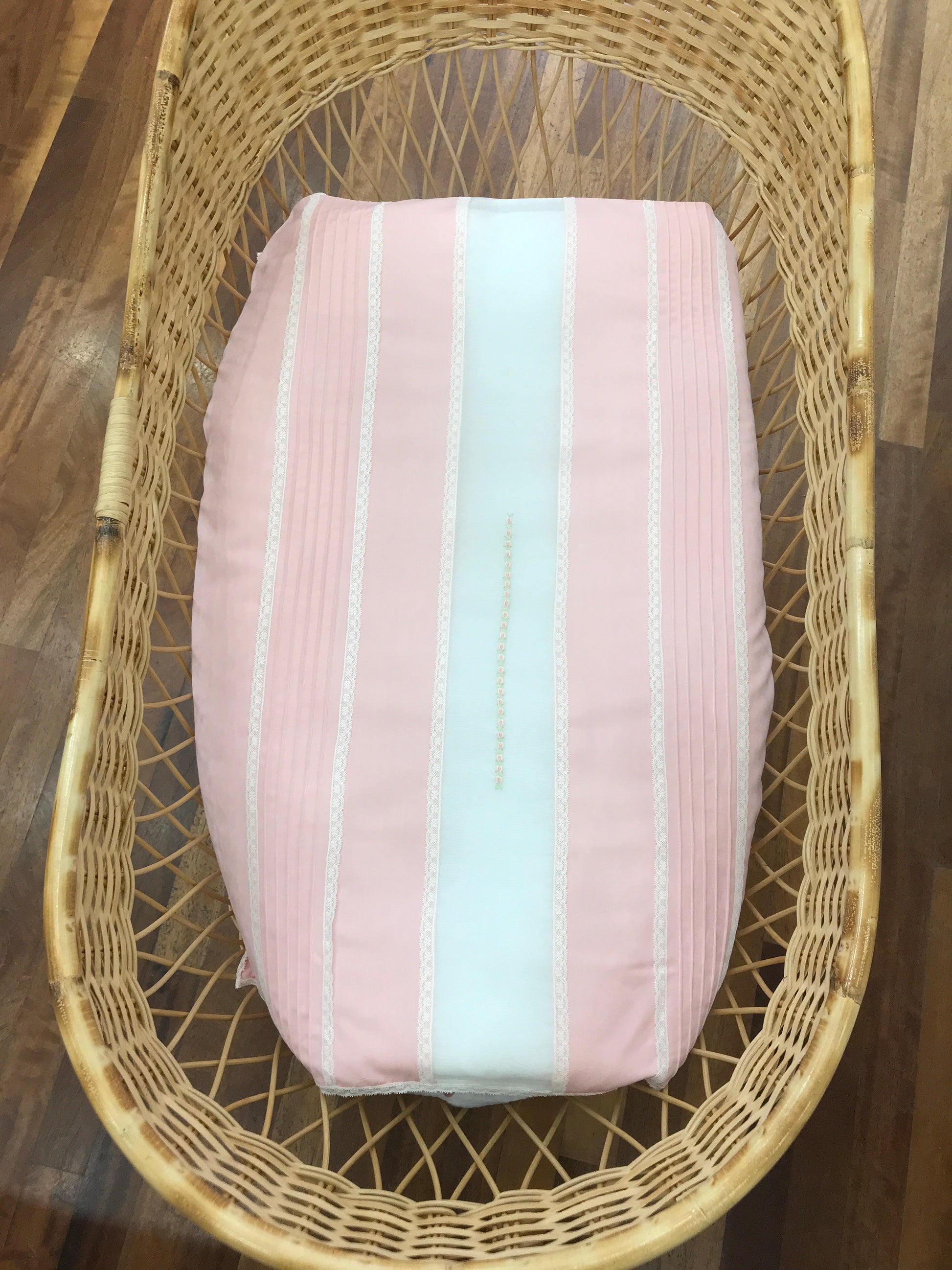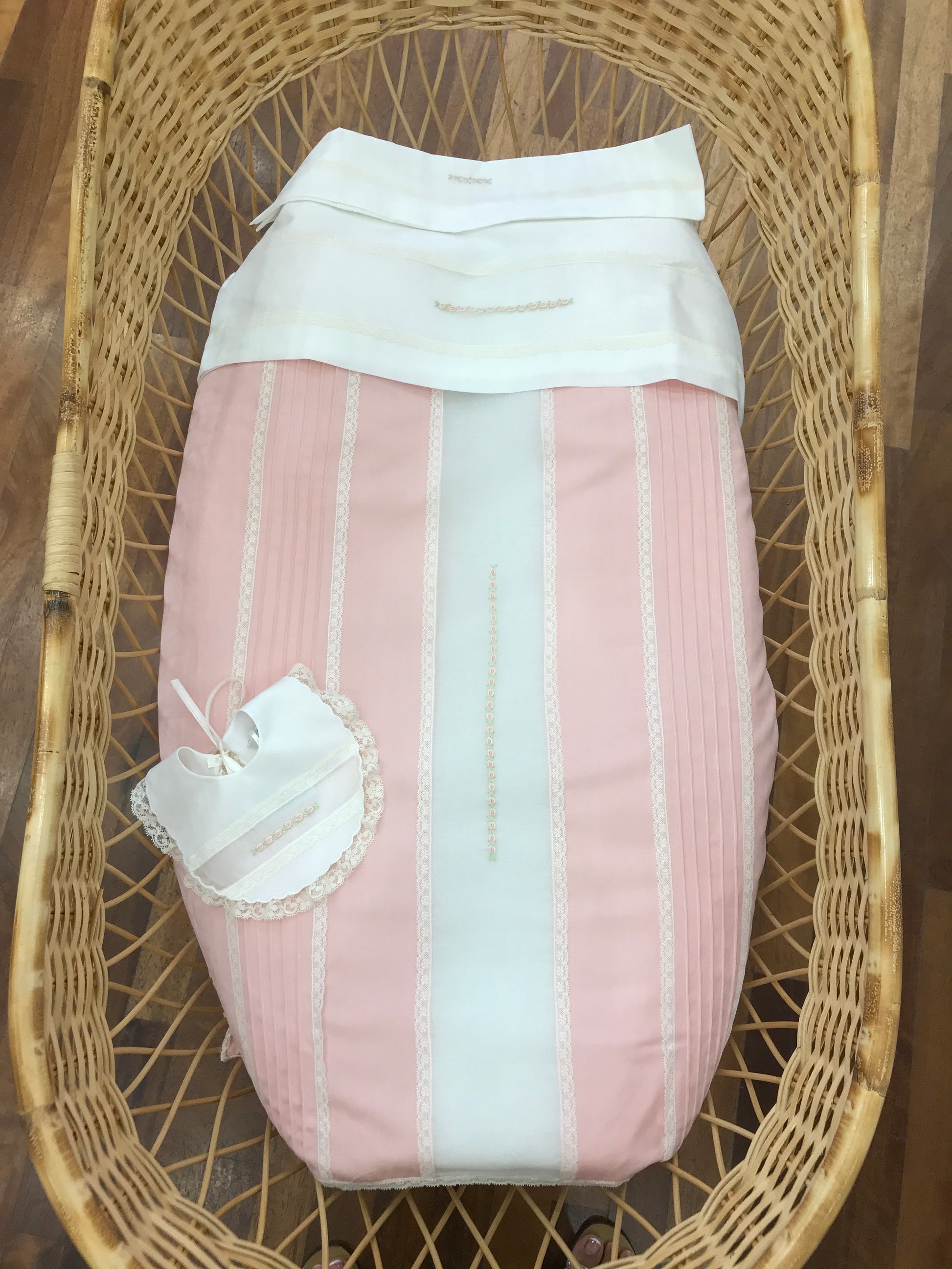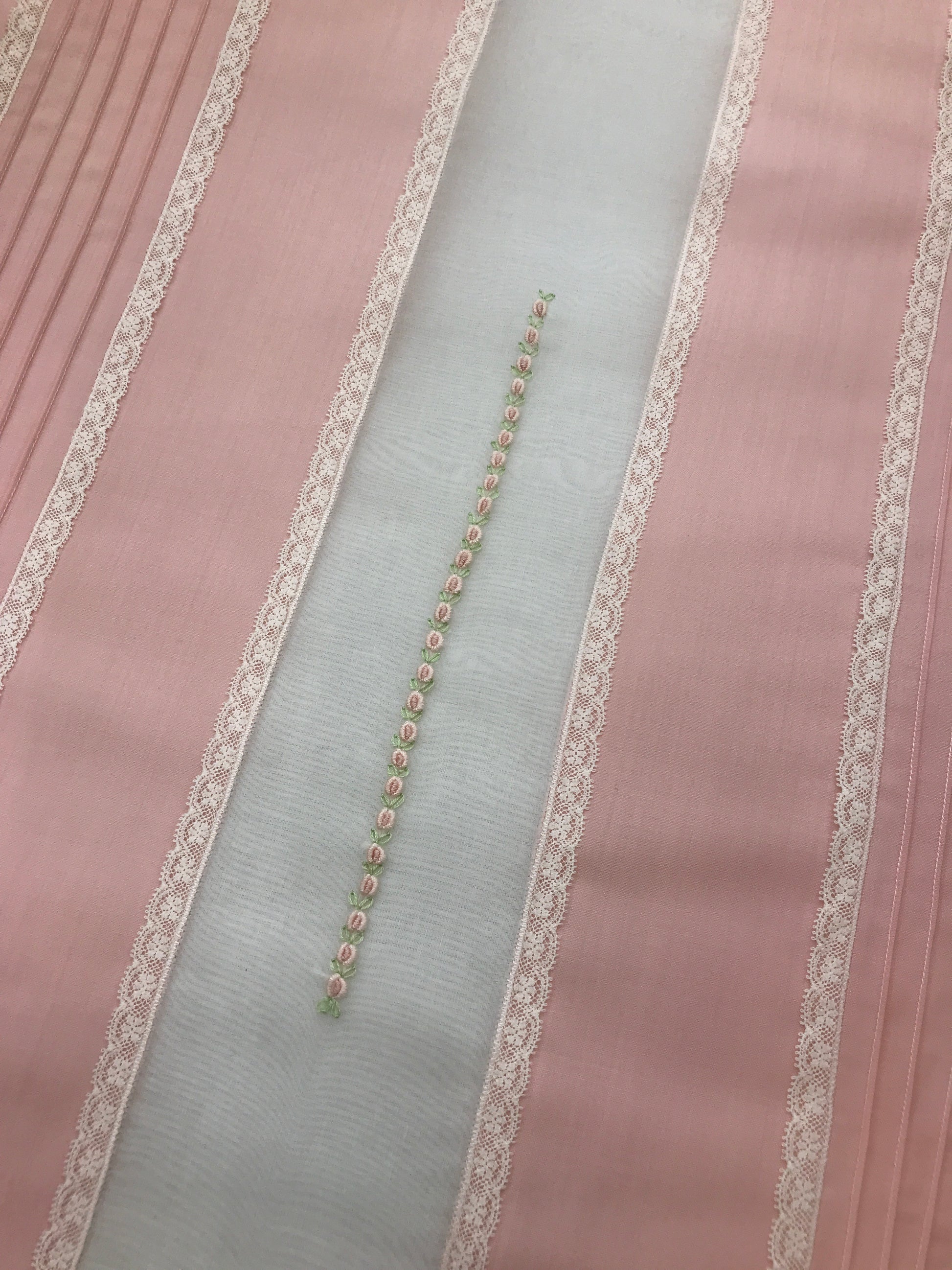 Piumoncino composto da tre fasce, caratterizzato da pieghe e valenciennes laterali; al centro presenta una fascia in organza adornata con roselline ricamate, mentre il perimetro è rifinito con valencienne.
