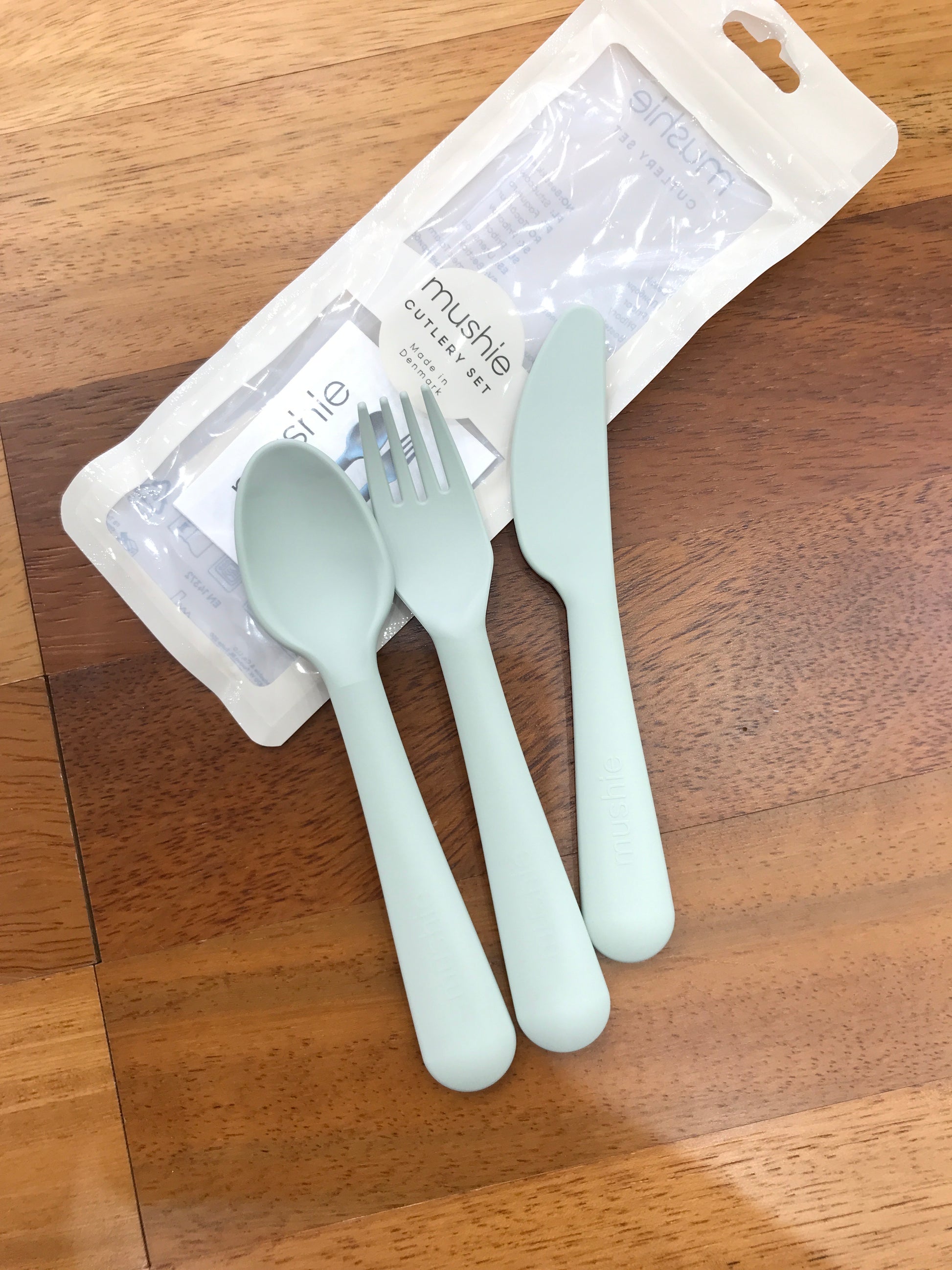 Set di tre posate composto da coltello, forchetta e cucchiaio, ideali per i bambini piccoli. Questi utensili sono progettati per adattarsi alle mani dei più piccoli, facilitando l'apprendimento dell'autonomia durante i pasti in modo sicuro e confortevole.