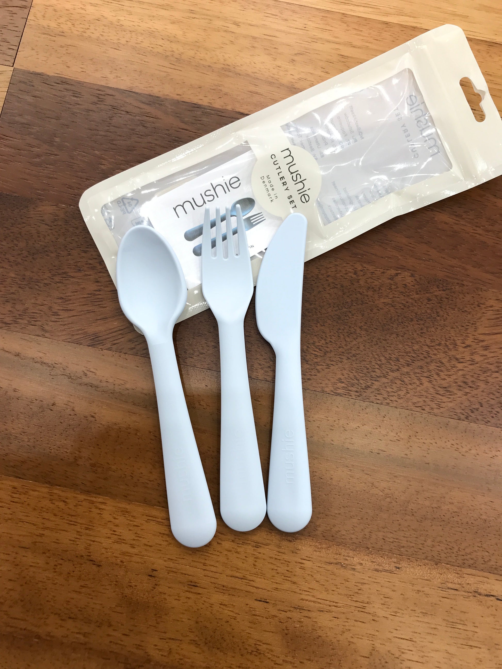 Set di tre posate composto da coltello, forchetta e cucchiaio, ideali per i bambini piccoli. Questi utensili sono progettati per adattarsi alle mani dei più piccoli, facilitando l'apprendimento dell'autonomia durante i pasti in modo sicuro e confortevole.