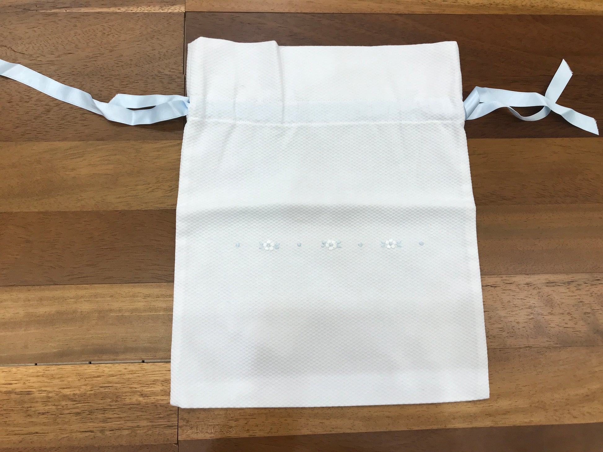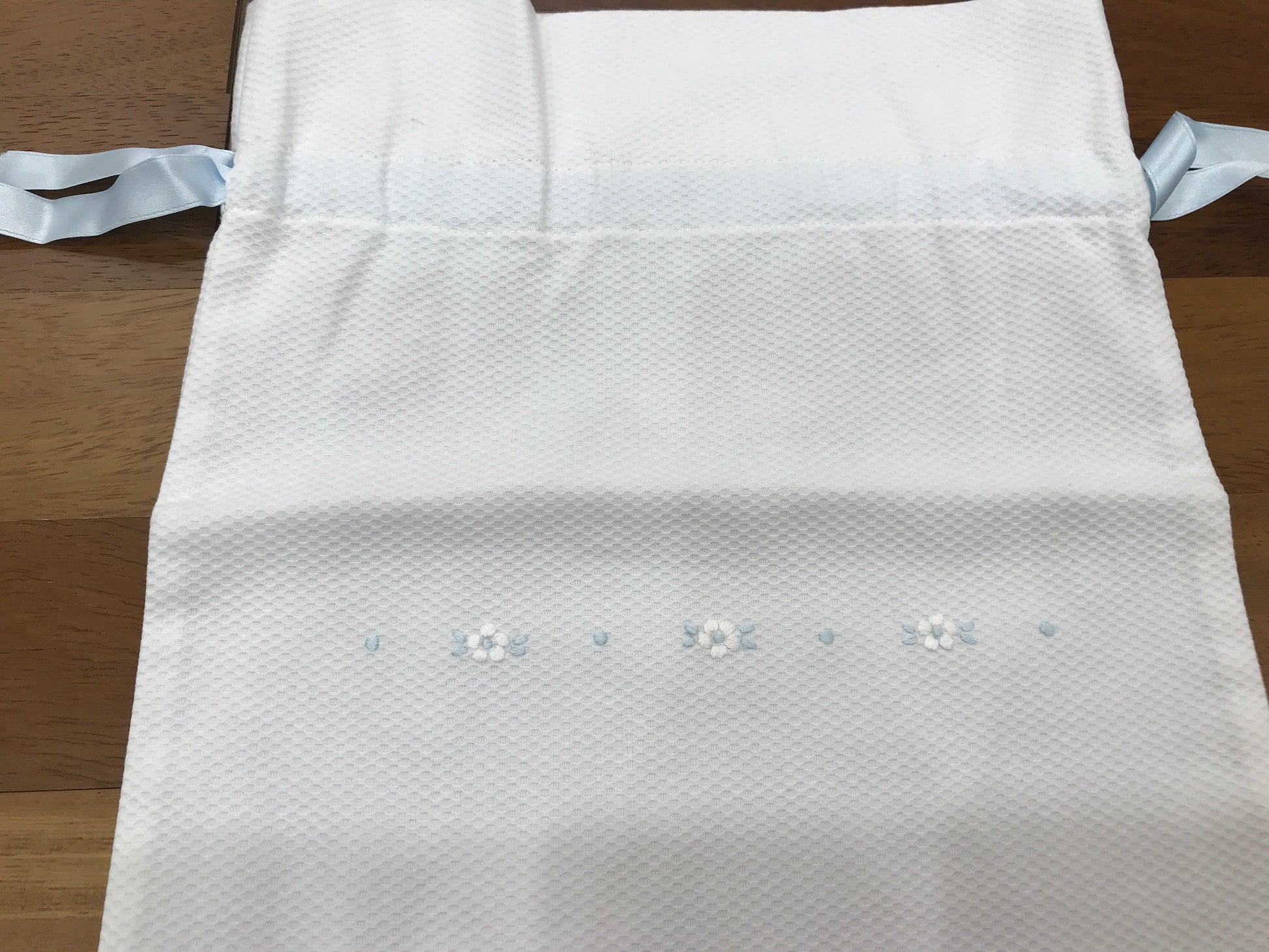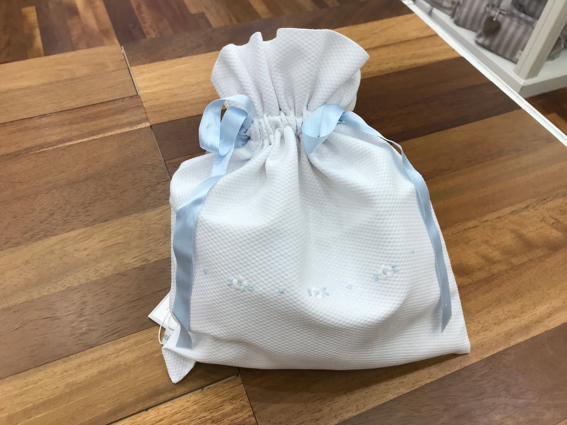 Il sacco cambio è realizzato in un raffinato tessuto bianco ed è dotato di un portanastro in tonalità celeste, progettato per offrire praticità e stile. Sul lato frontale, al centro, presenta una delicata decorazione di fiorellini ricamati con cura in bianco e celeste, che conferisce un tocco di eleganza e raffinatezza al prodotto. Questa combinazione di materiali e dettagli rende il sacco cambio non solo funzionale, ma anche un accessorio di grande classe per il corredino.