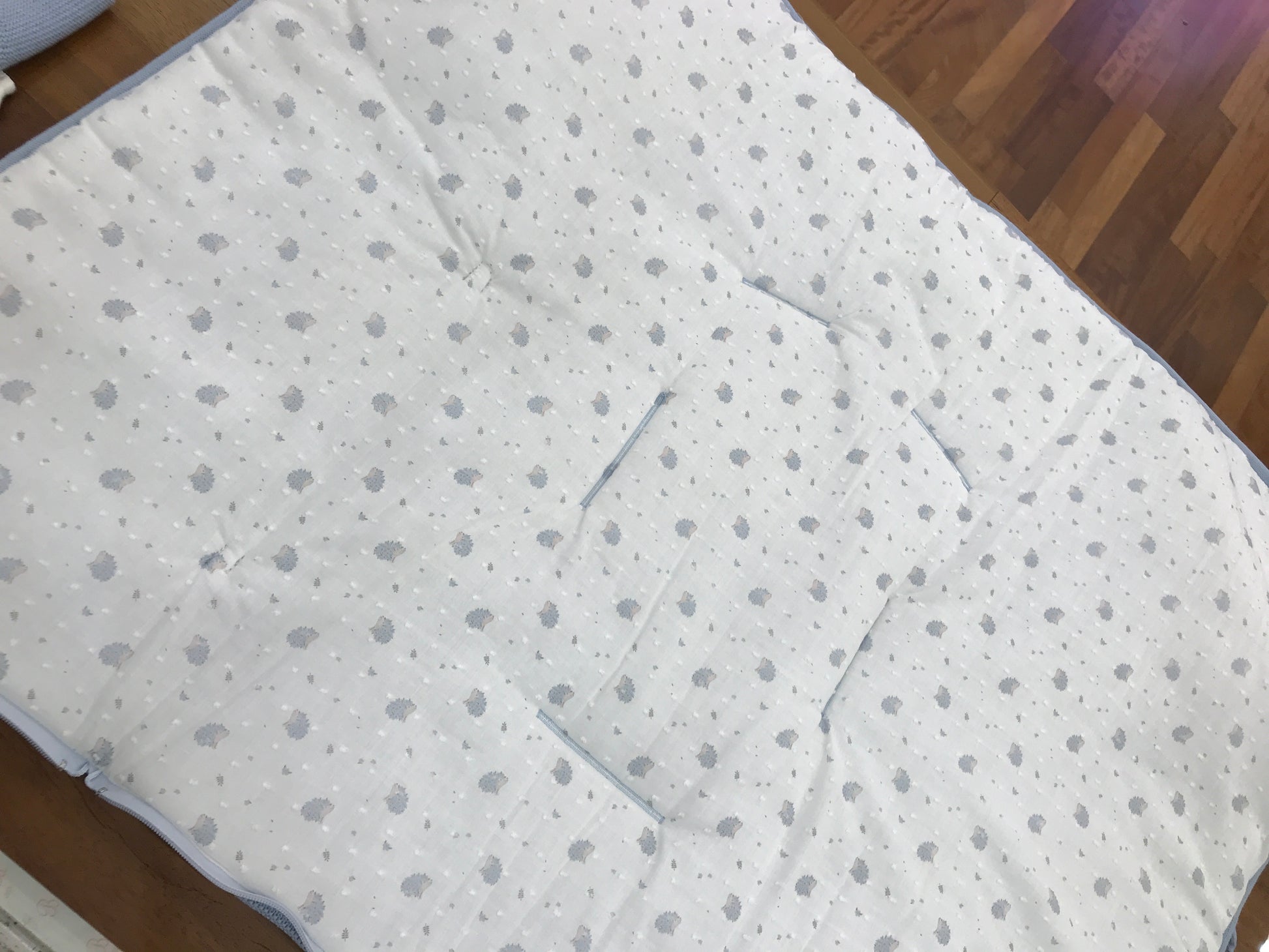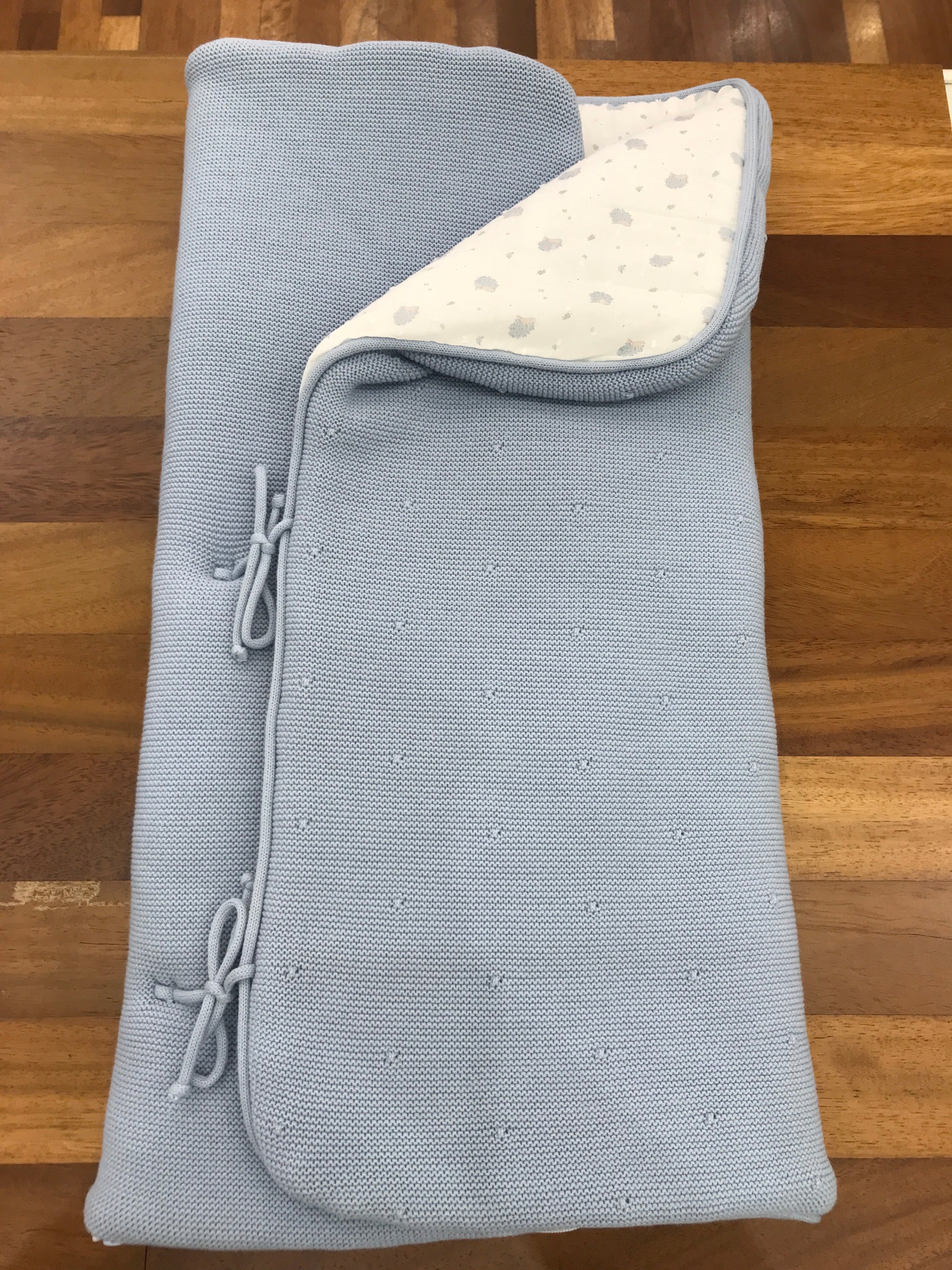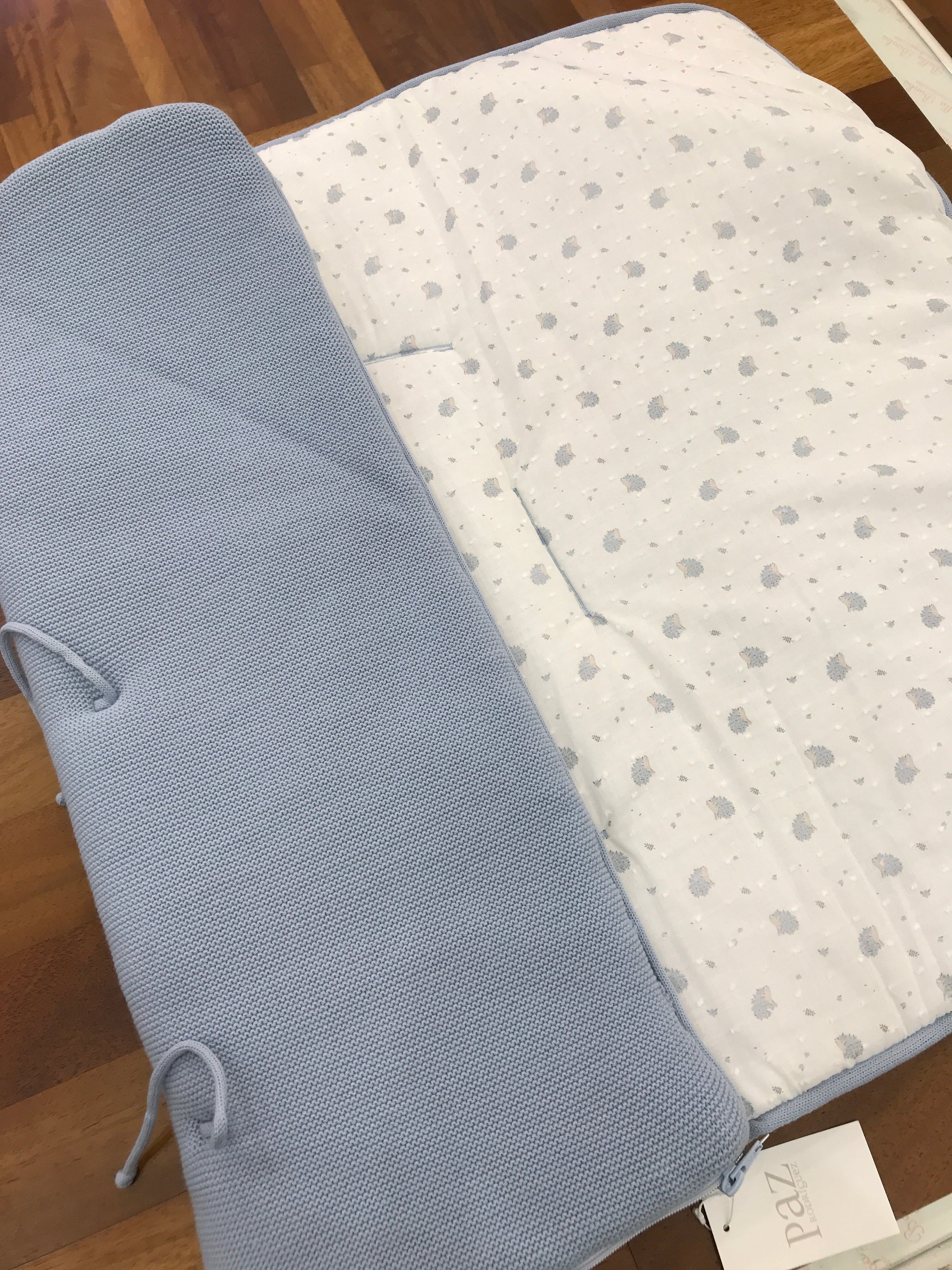 Questo sacco nanna in lana presenta un interno completamente decorato con porcupini celesti su sfondo bianco. La chiusura è composta da una zip discreta, completata da eleganti fiocchetti per una finitura raffinata.