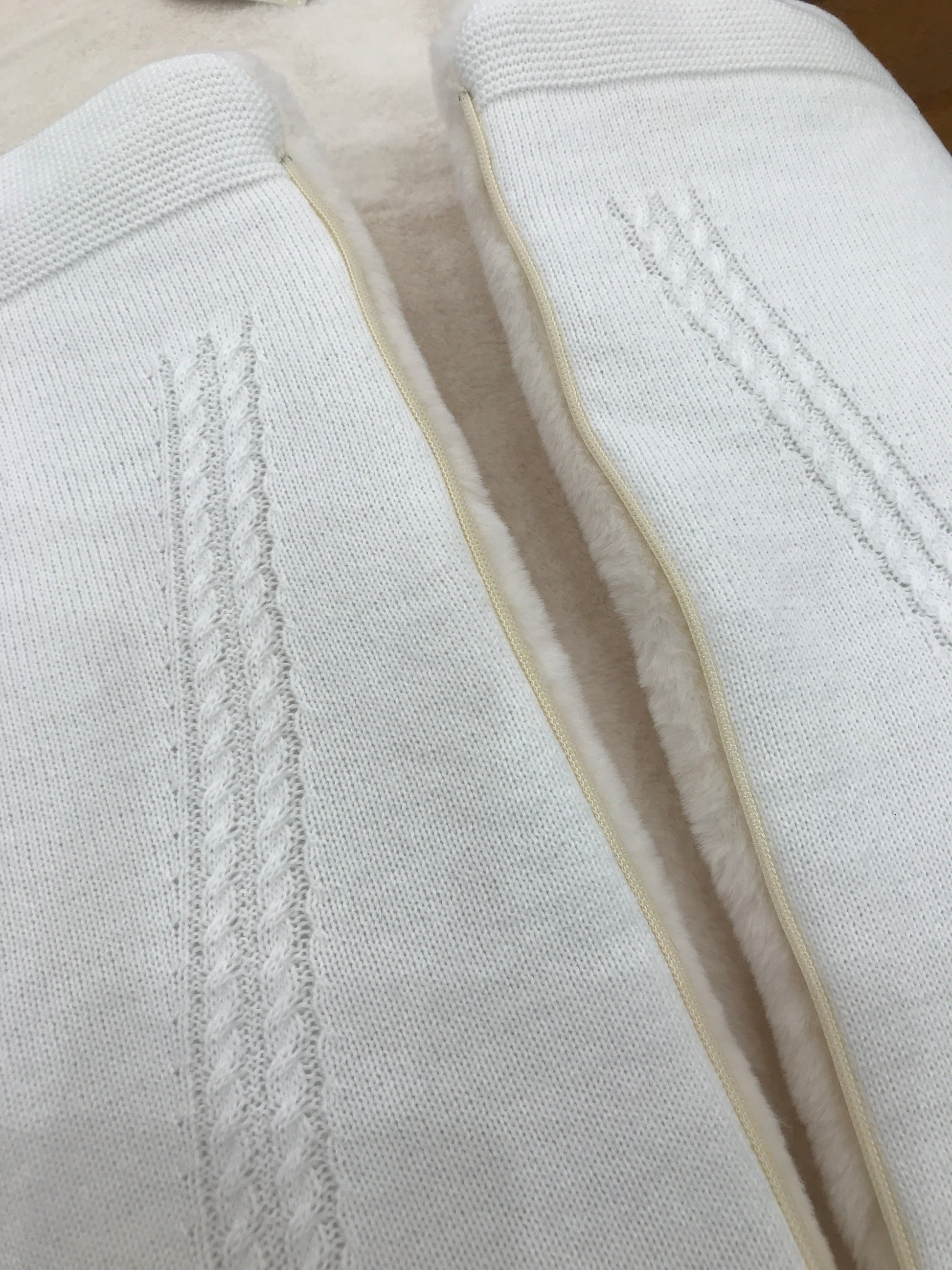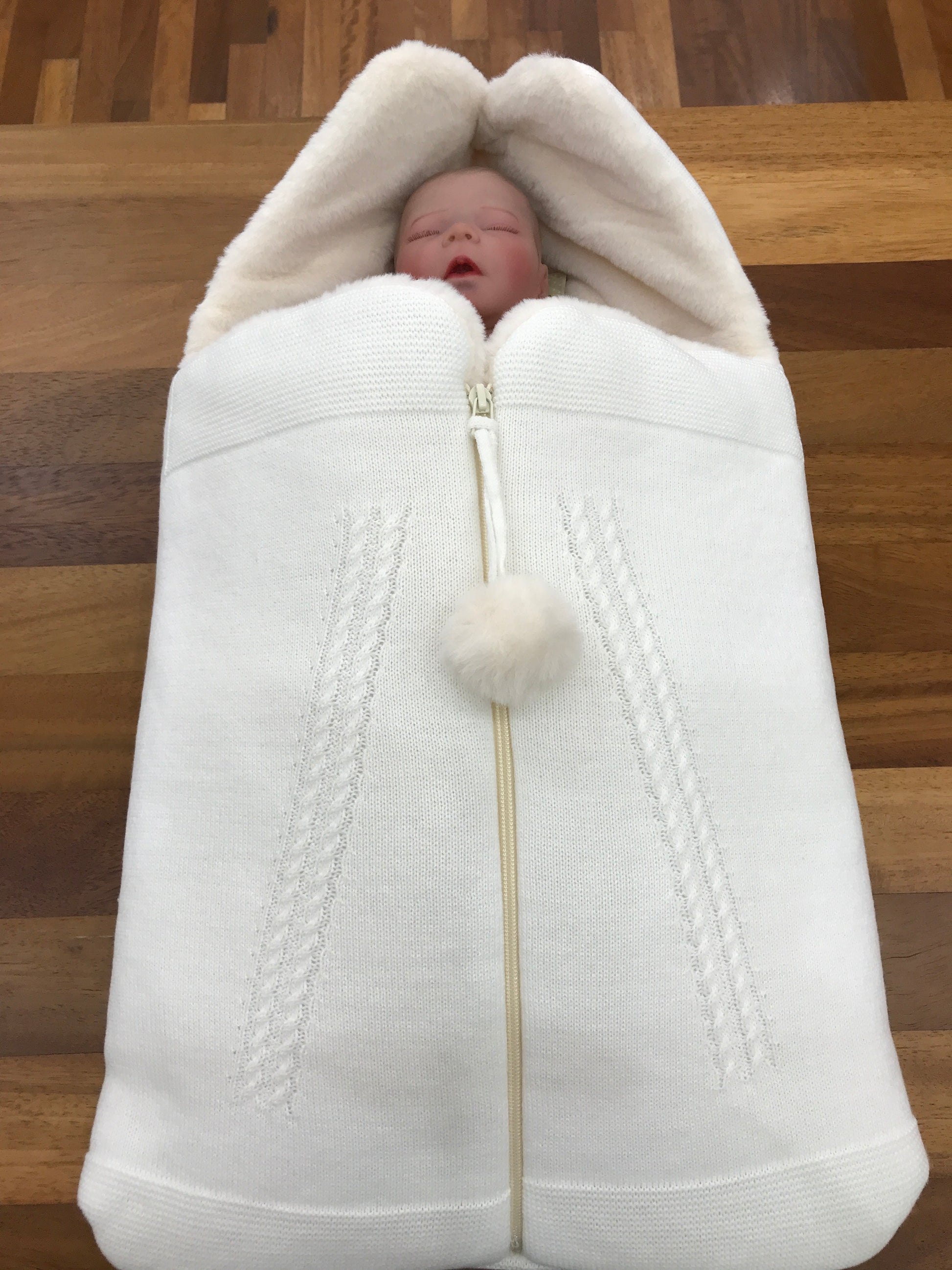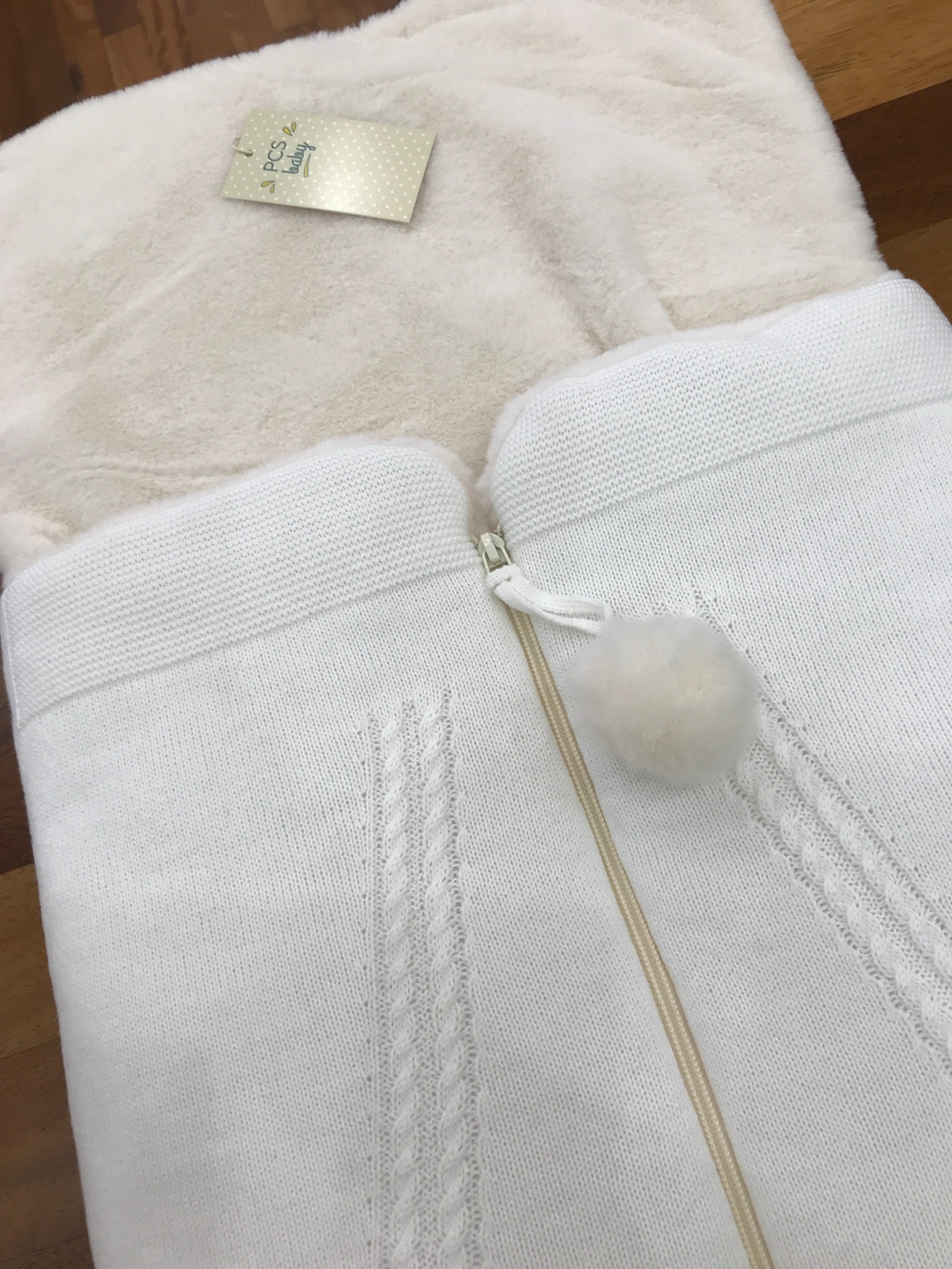 Il sacco nanna PCS baby è interamente foderato in pelliccia per garantire calore e comfort. Dotato di chiusura con zip e pon pon, presenta una lavorazione a trecce e una parte superiore con bottoni che permettono di trasformarlo in un cappuccio protettivo.