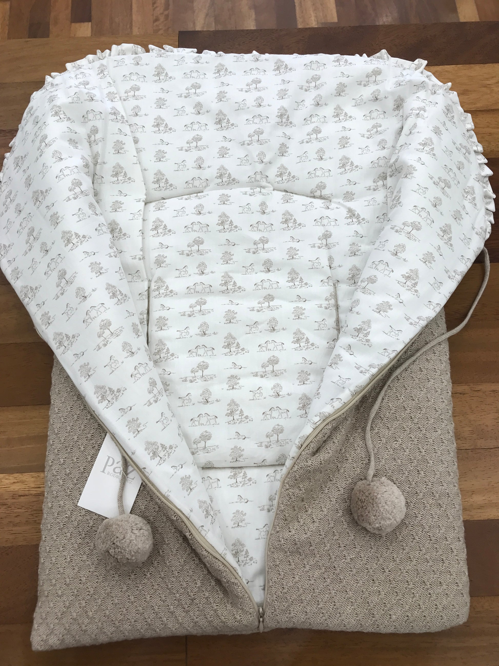 Il sacco nanna presenta una comoda chiusura a zip posizionata sul davanti che facilita la vestizione e la rimozione. Non è dotato di cappuccio per garantire una maggiore sicurezza e comfort durante il sonno. Sul lato anteriore è presente una pratica tasca a riccetto, ideale per piccoli oggetti o per un tocco estetico. L'interno, di un delicato colore panna, è impreziosito da una fantasia di alberi e animali in tonalità tortora, che conferisce un design elegante e naturale, perfetto per ambienti bambini raffinati.