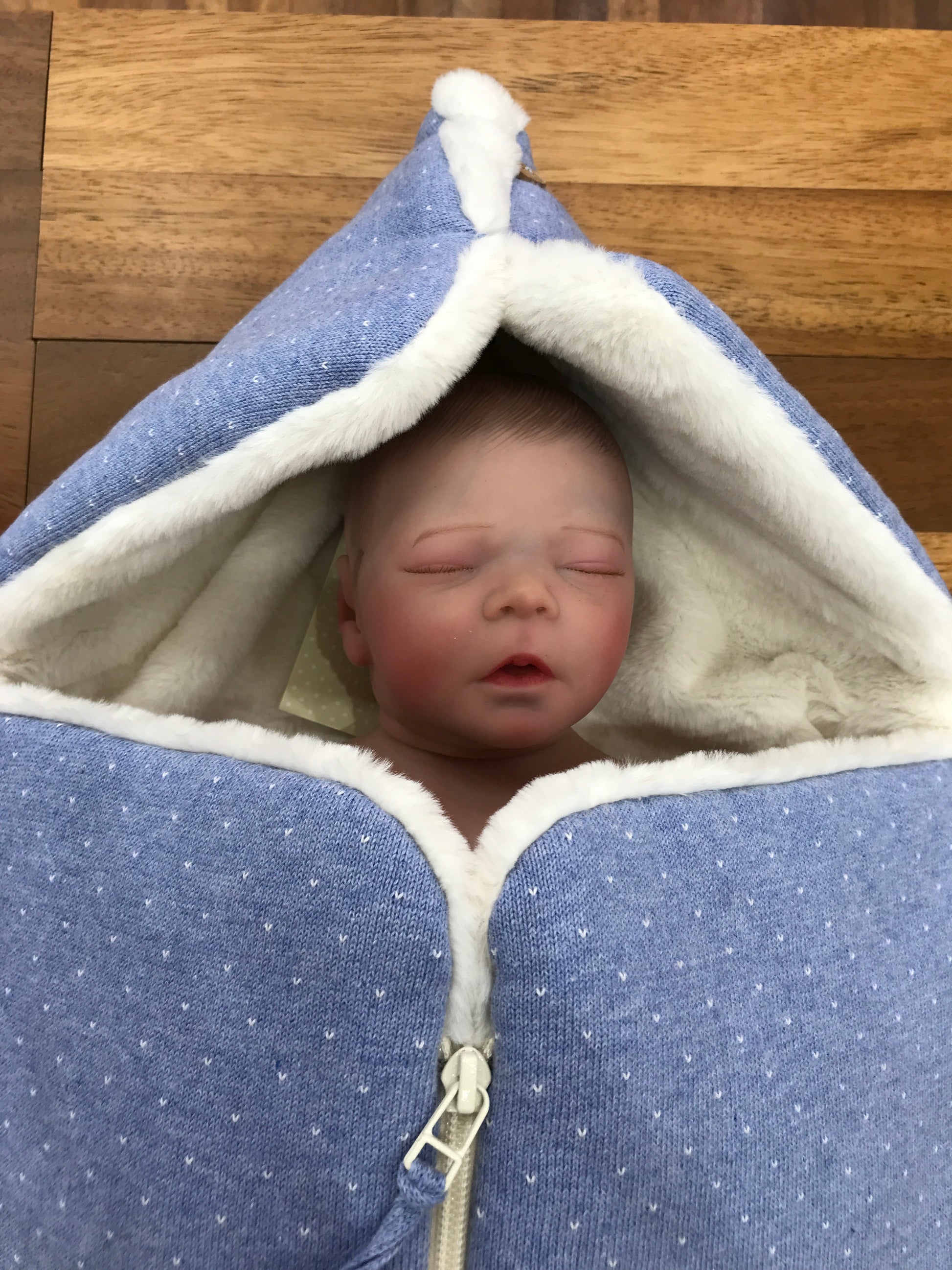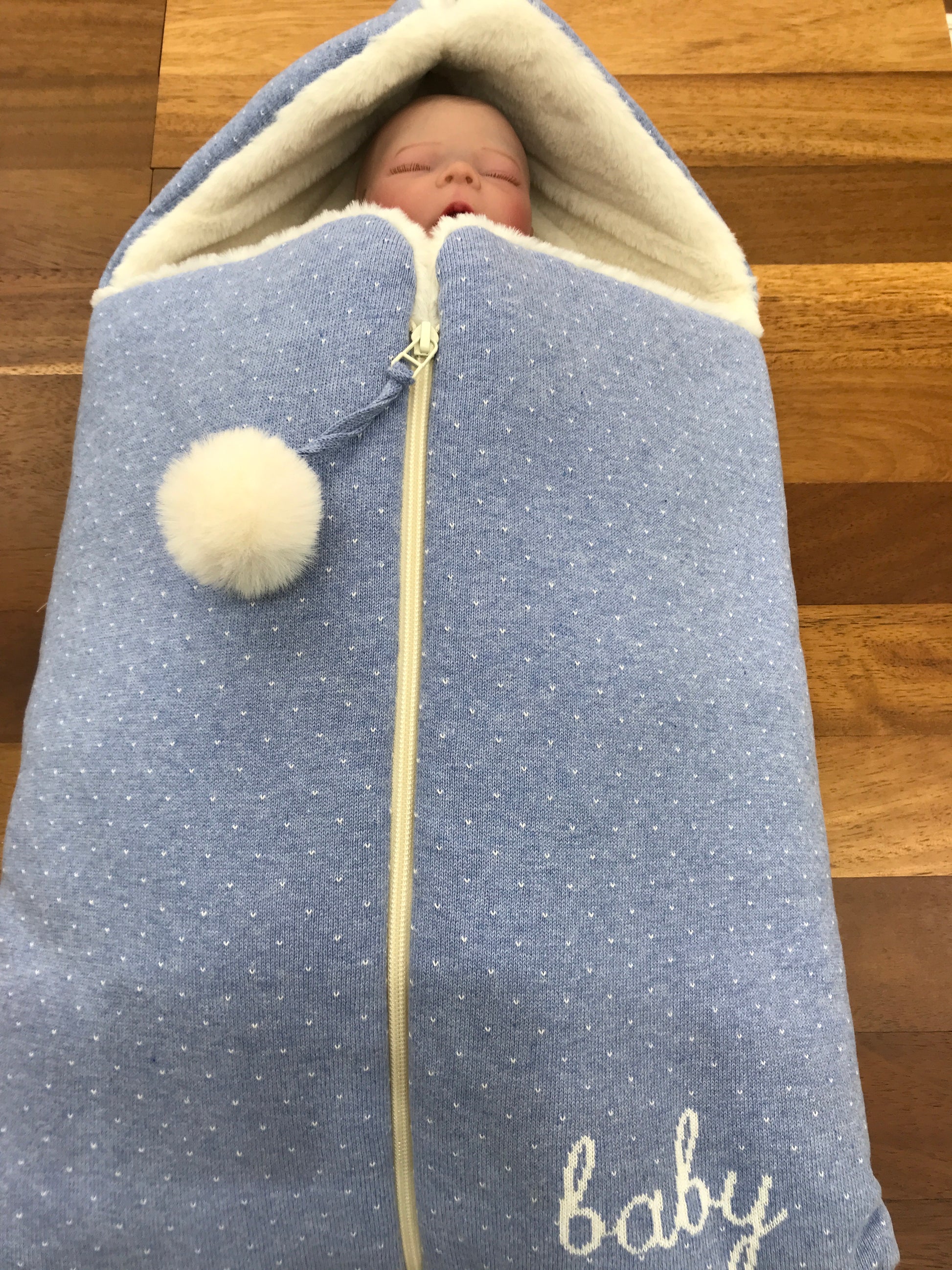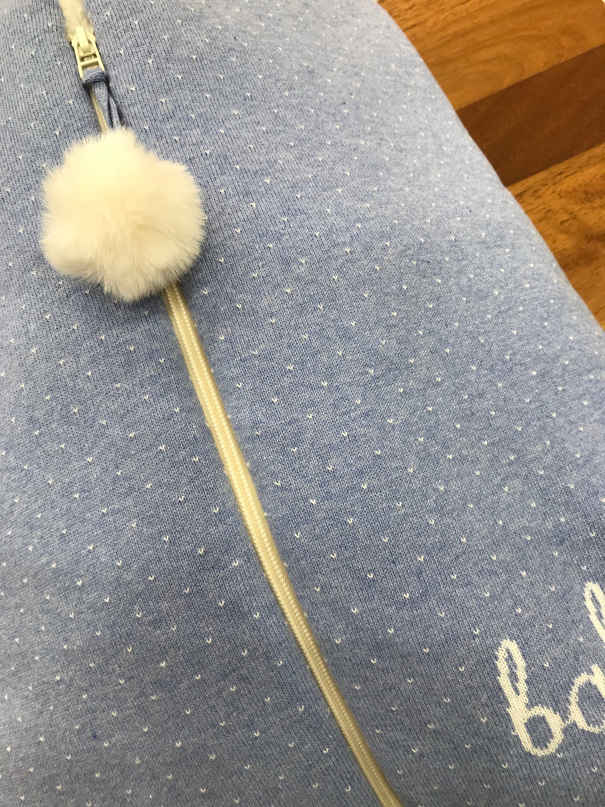 Sacco nanna celeste decorato con pois bianchi, dotato di chiusura a zip con dettaglio a pallina e foderato internamente in pelliccia.