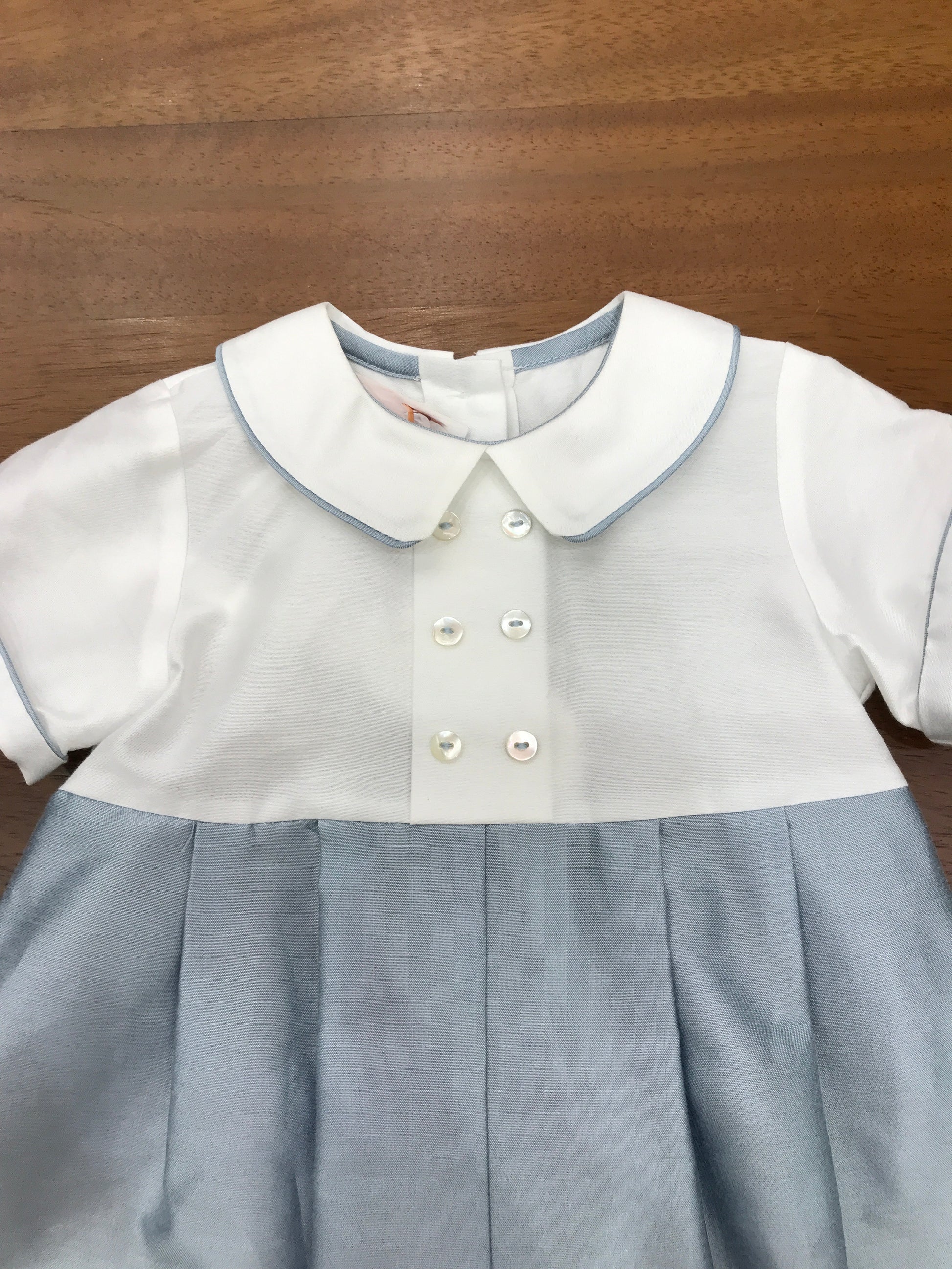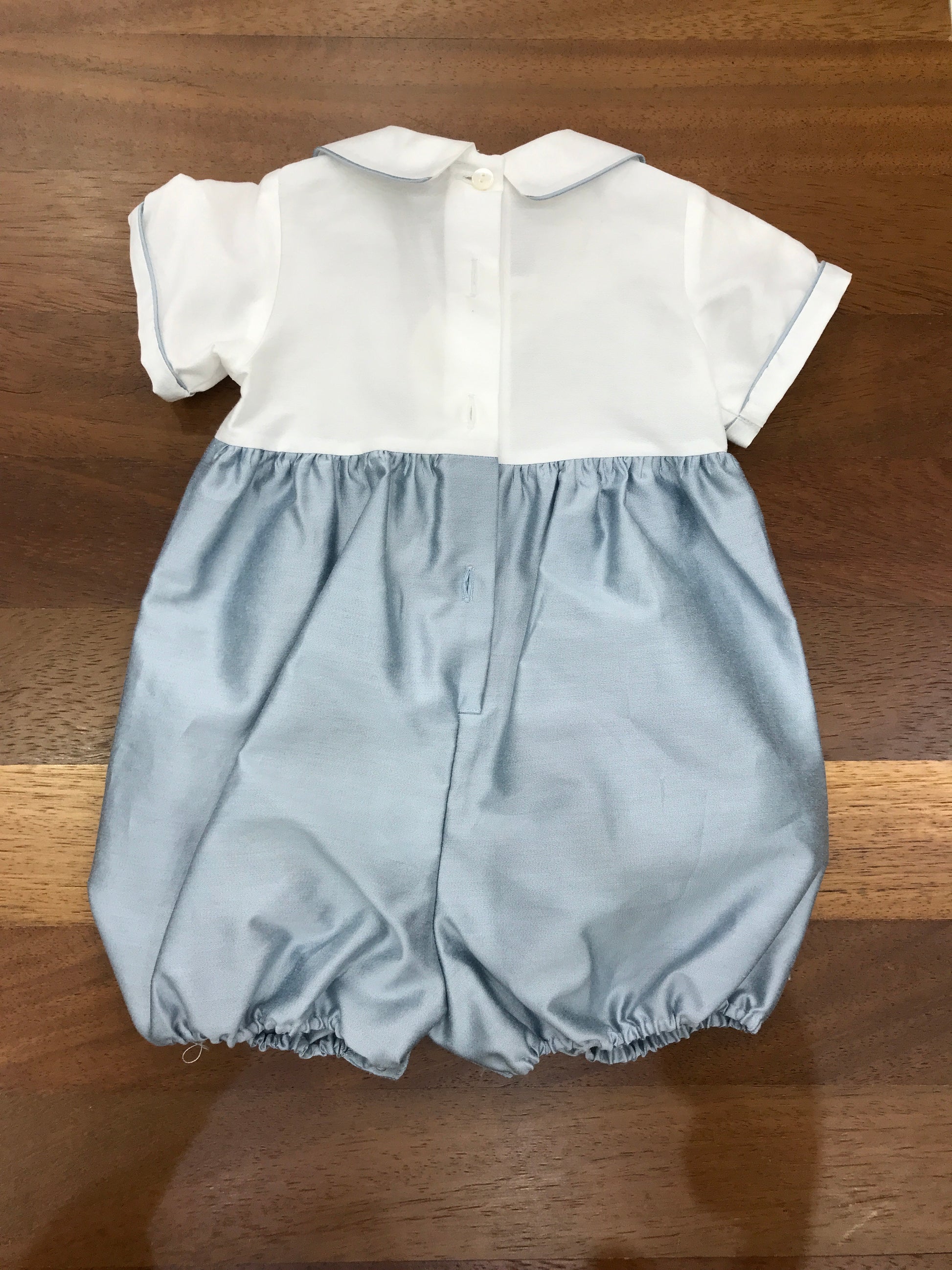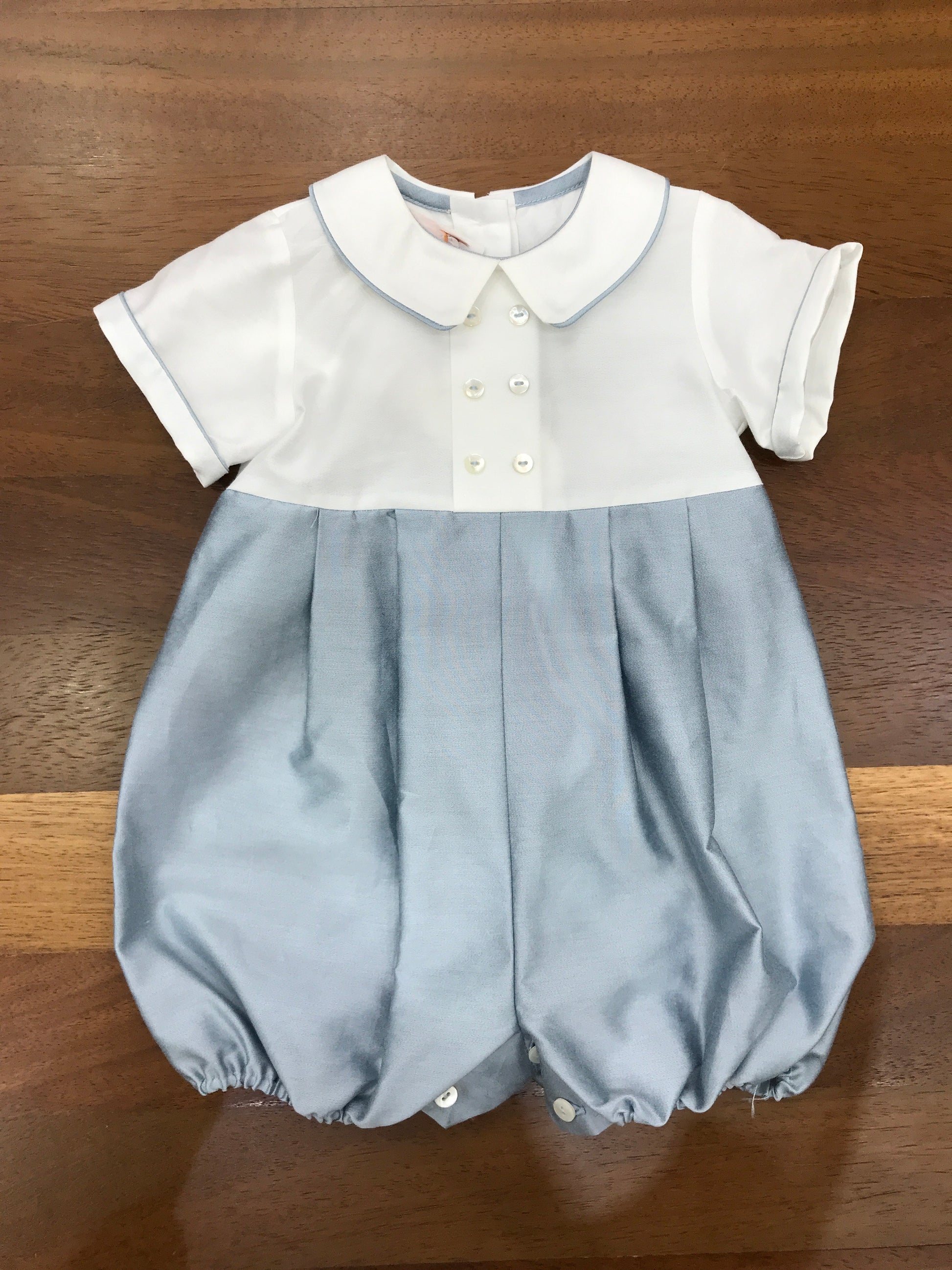 Elegante pagliaccetto in satin che combina praticità e raffinatezza. La parte inferiore presenta un comodo taglio a sbuffo in celeste, mentre la parte superiore in bianco con maniche a mezza lunghezza offre versatilità. Dettagli ricercati includono il colletto a punta e delicati bottoncini applicati sul davanti, conferendo al capo un'estetica sofisticata e curata nei particolari.