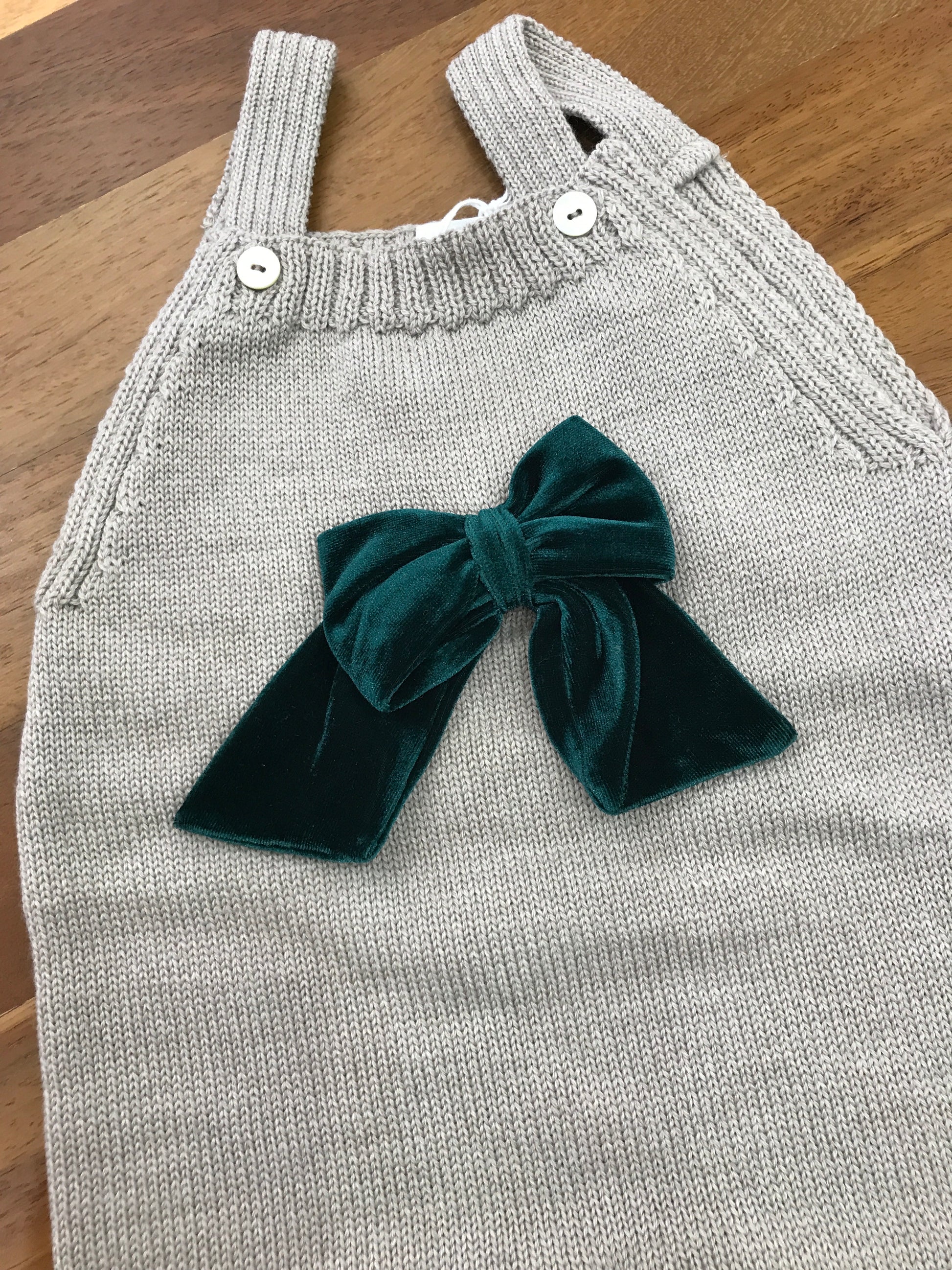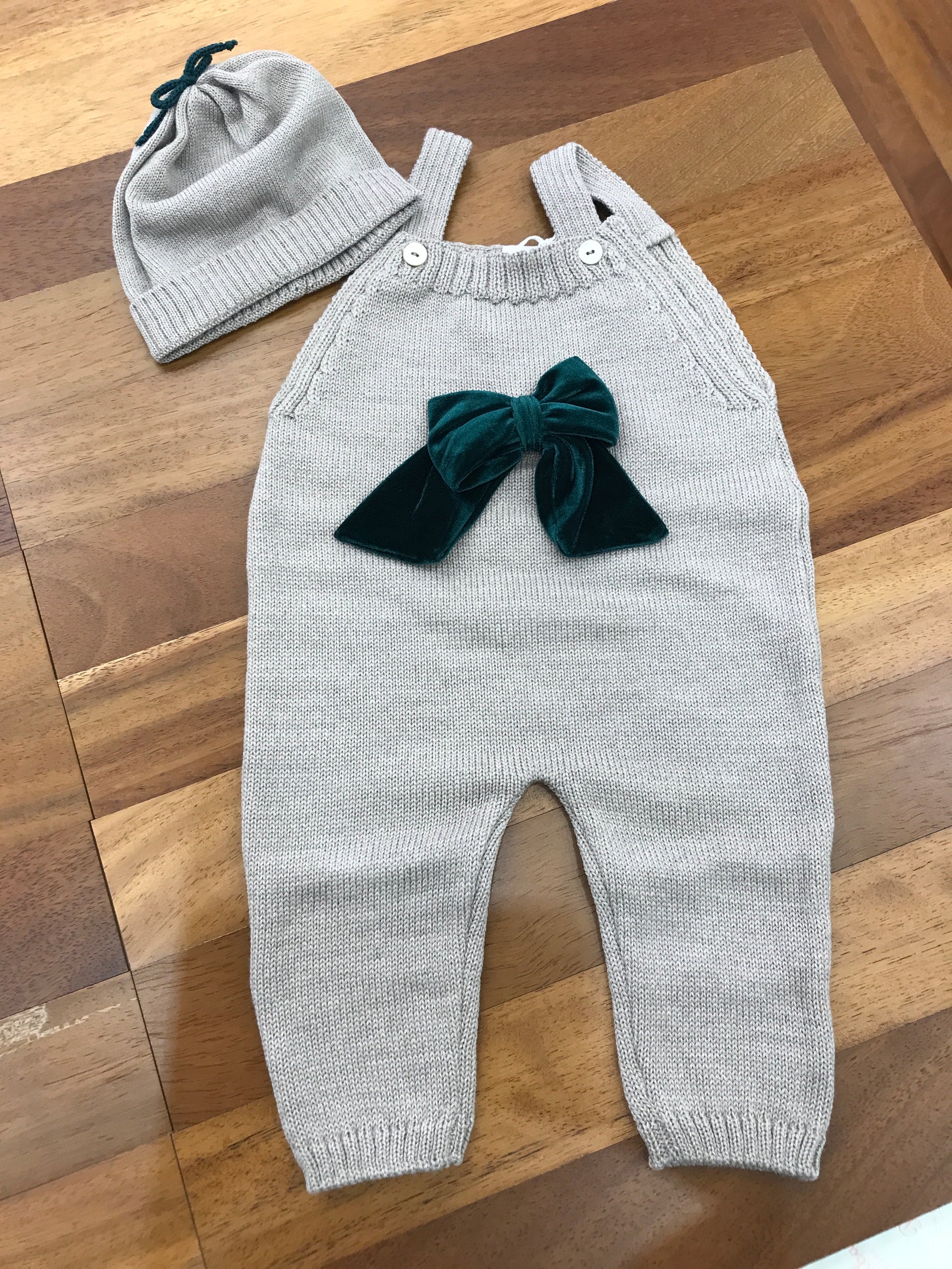 Questa salopette color tortora è impreziosita da un elegante fiocco in velluto verde posizionato al centro sul davanti, conferendo un tocco di raffinatezza e stile al capo. Realizzata con materiali di alta qualità, è ideale per garantire comfort e un look sofisticato ai più piccoli.