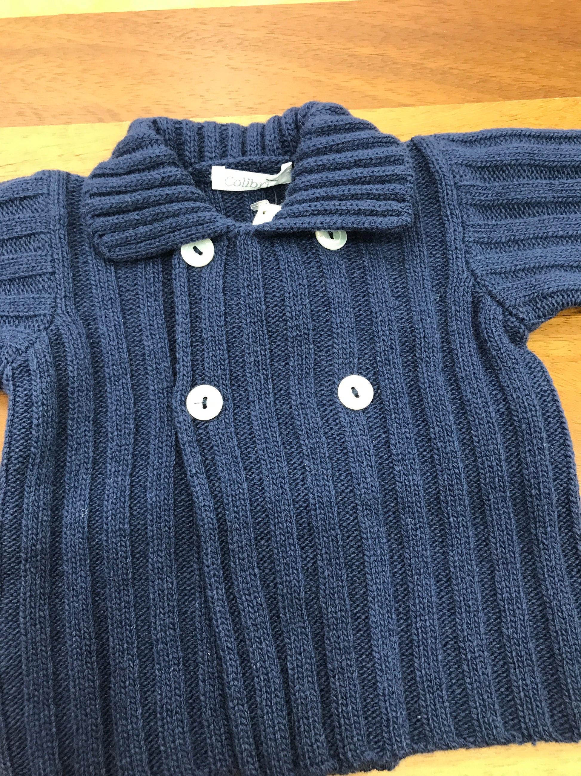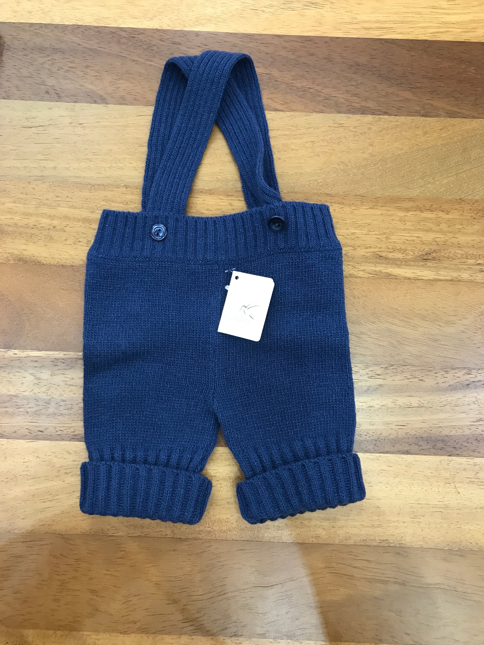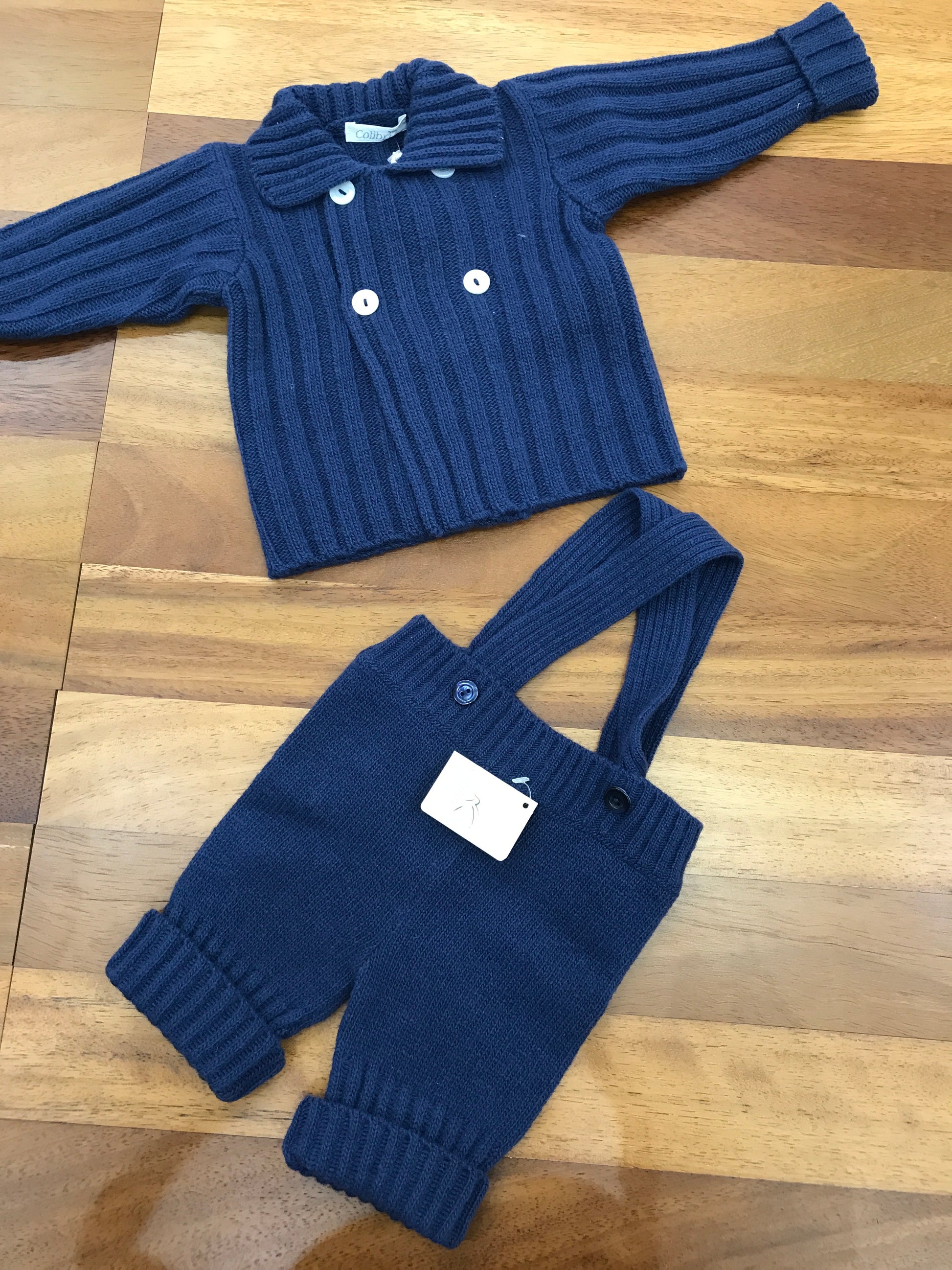 Cardigan con bottoncini frontali e collo definito, accompagnato da una salopette con bottoncini anteriori e risvolto, priva di piedini.