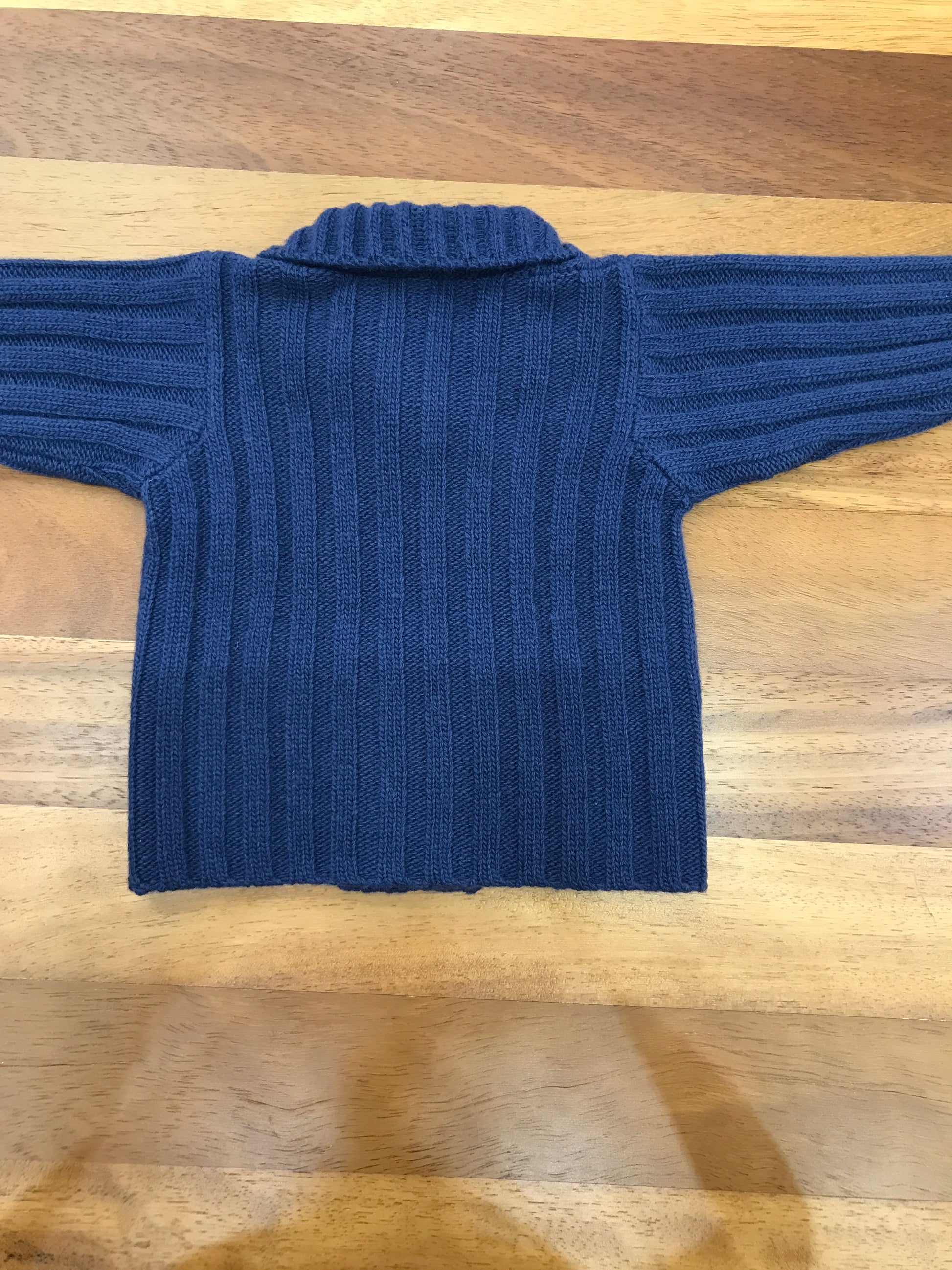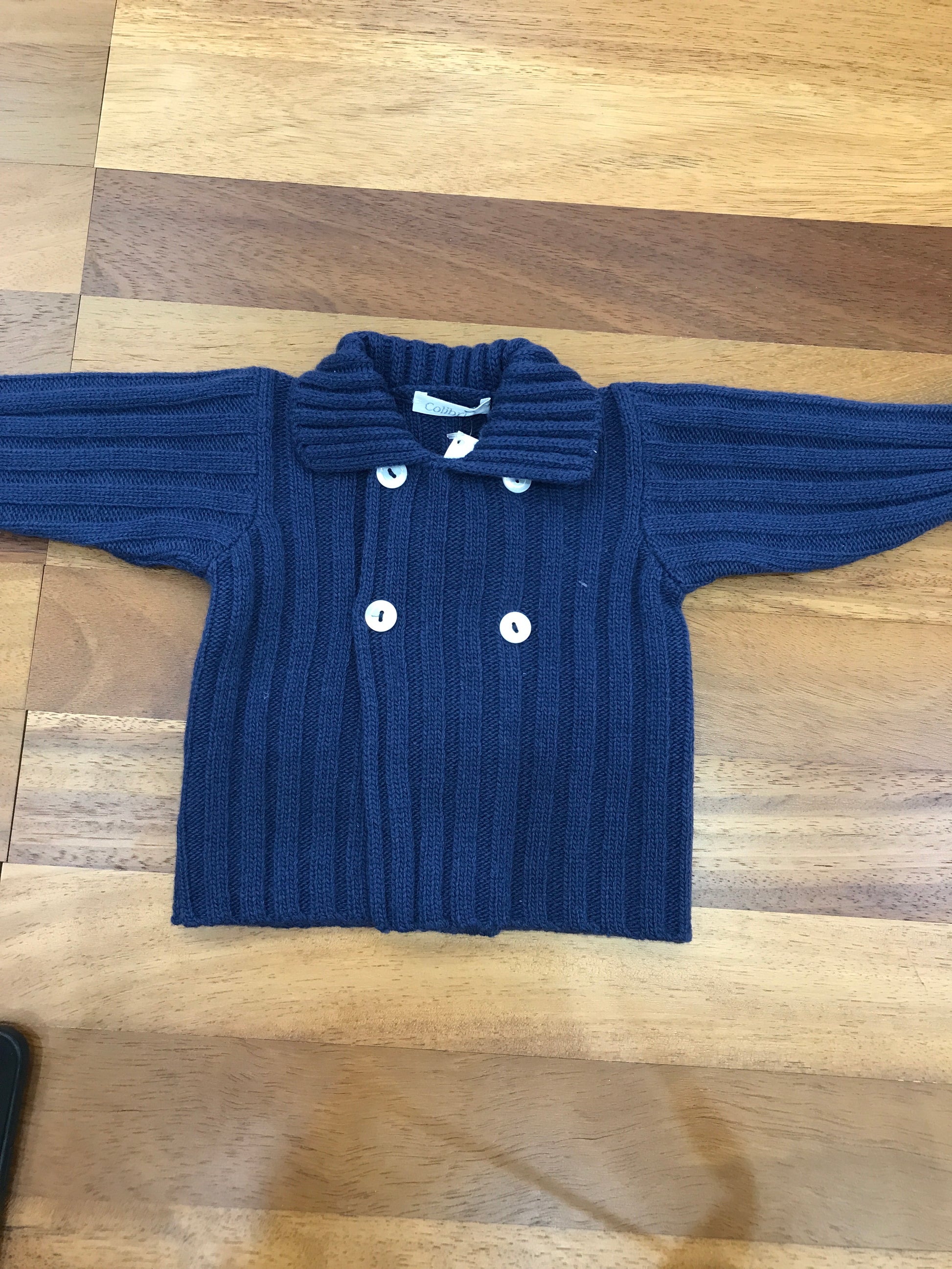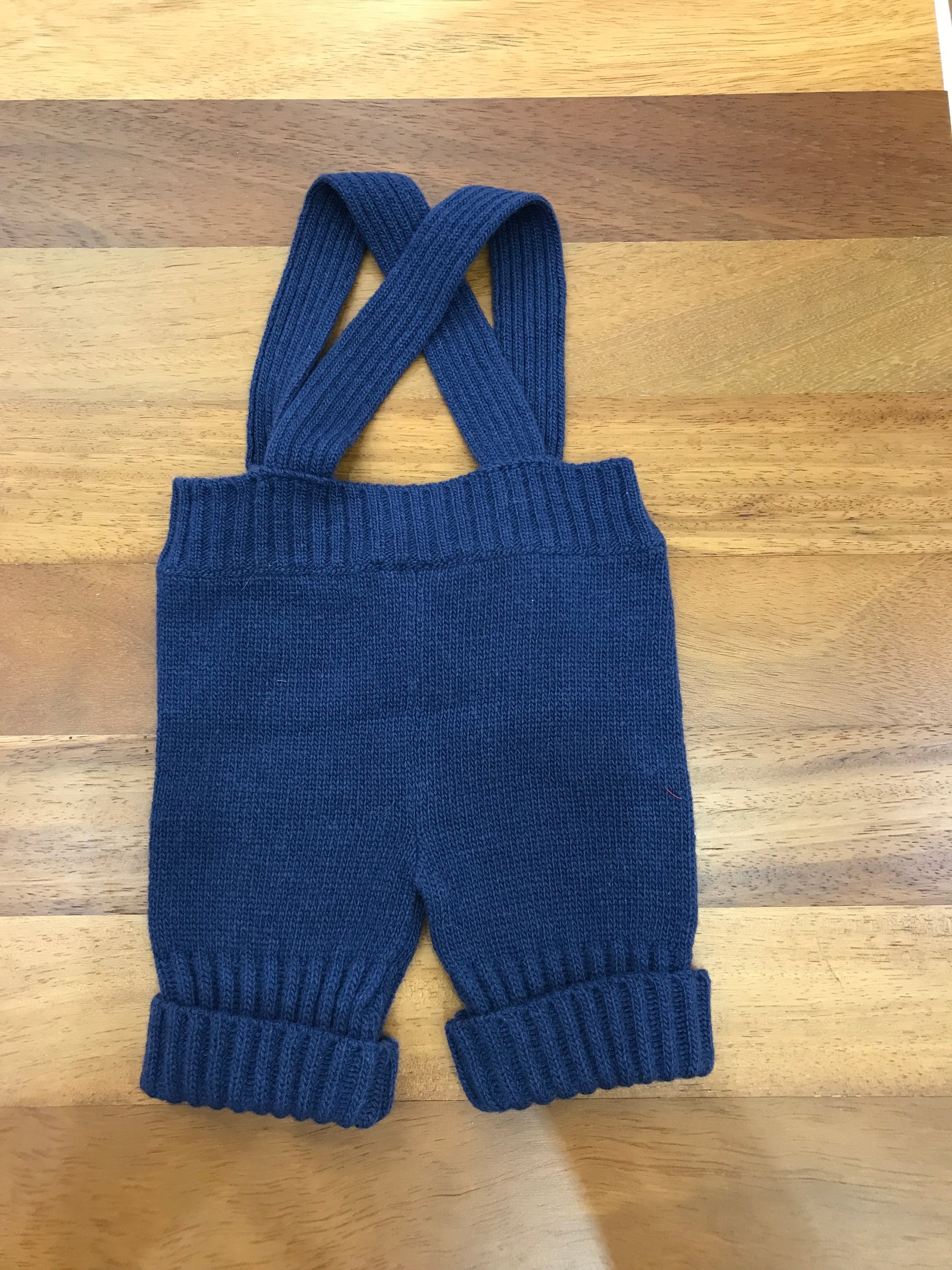 Cardigan con bottoncini frontali e collo definito, accompagnato da una salopette con bottoncini anteriori e risvolto, priva di piedini.