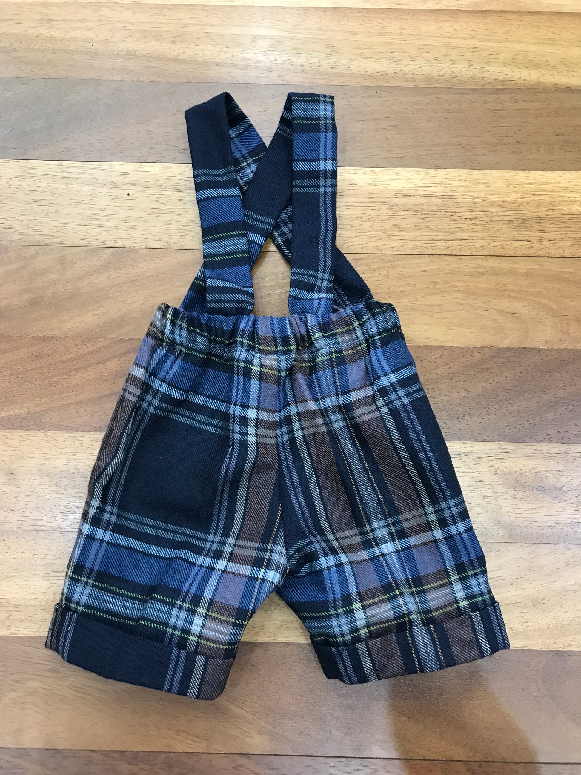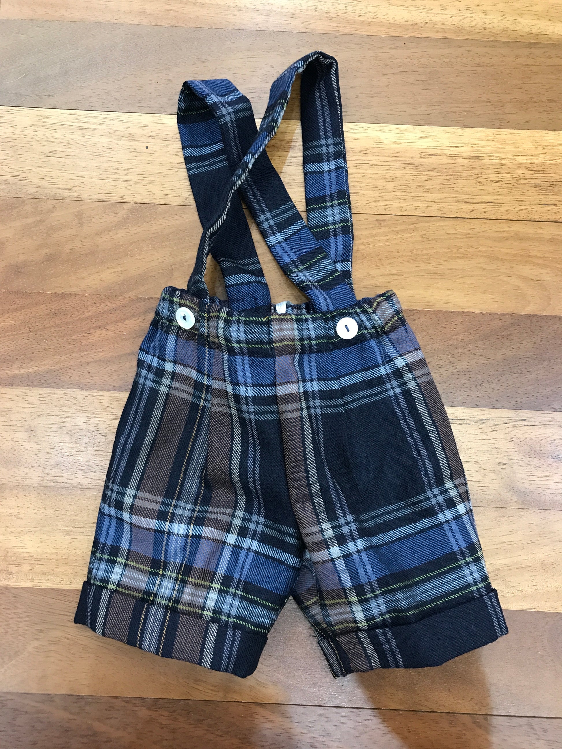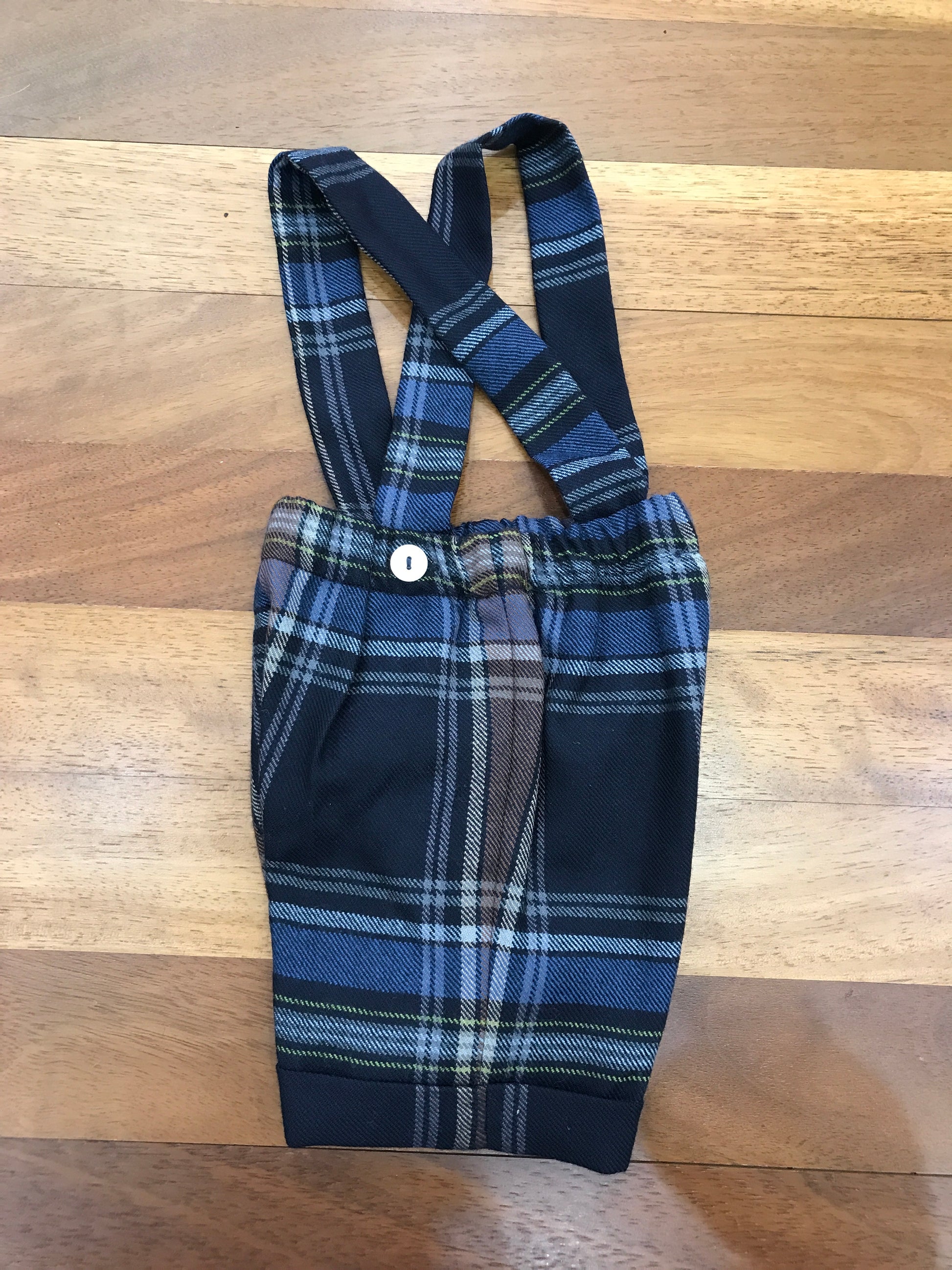Salopette in tessuto panno con motivo scozzese nei toni del blu, dotata di polsini alle caviglie, vita elastica e bretelle regolabili per una vestibilità personalizzata.