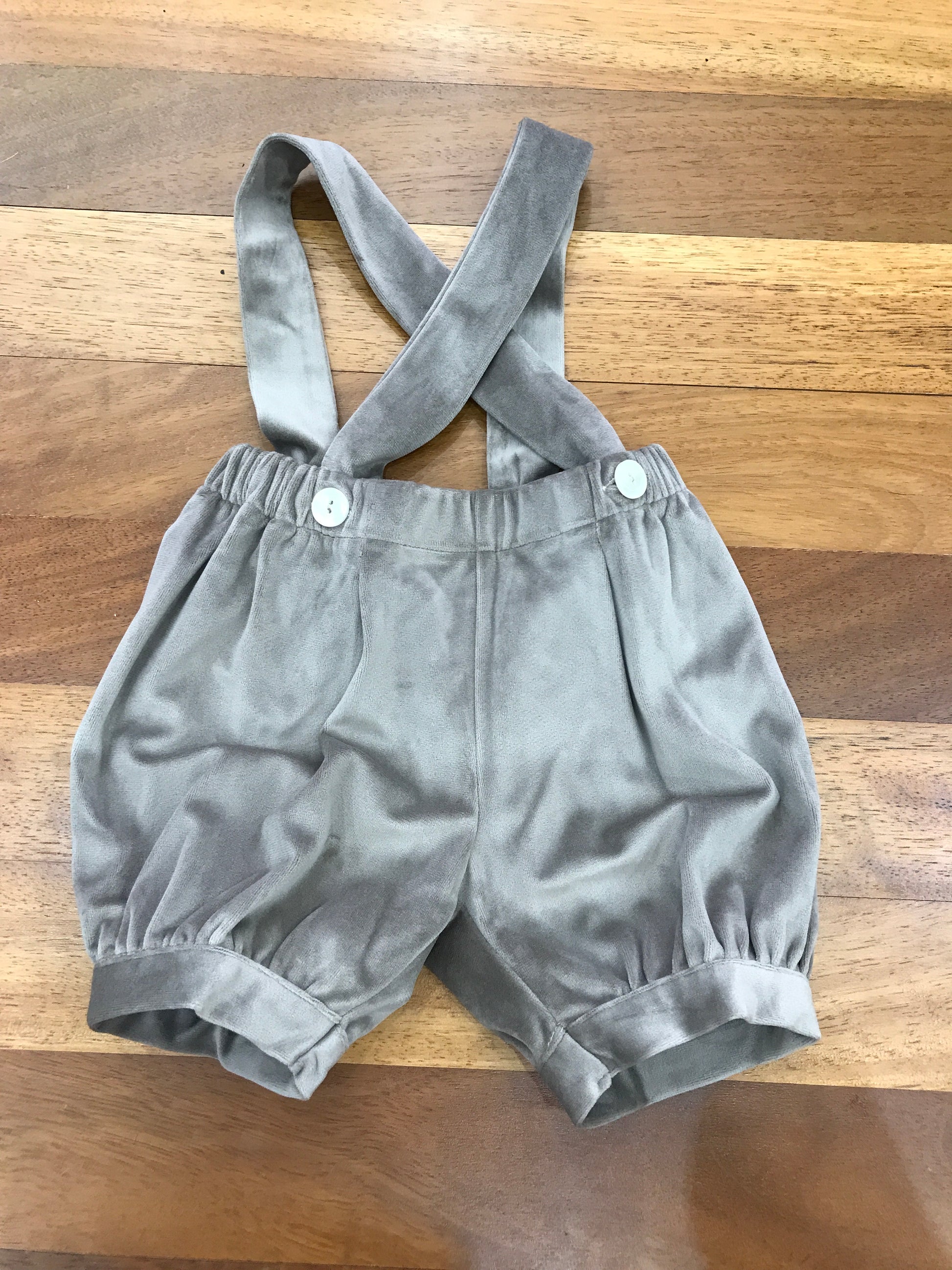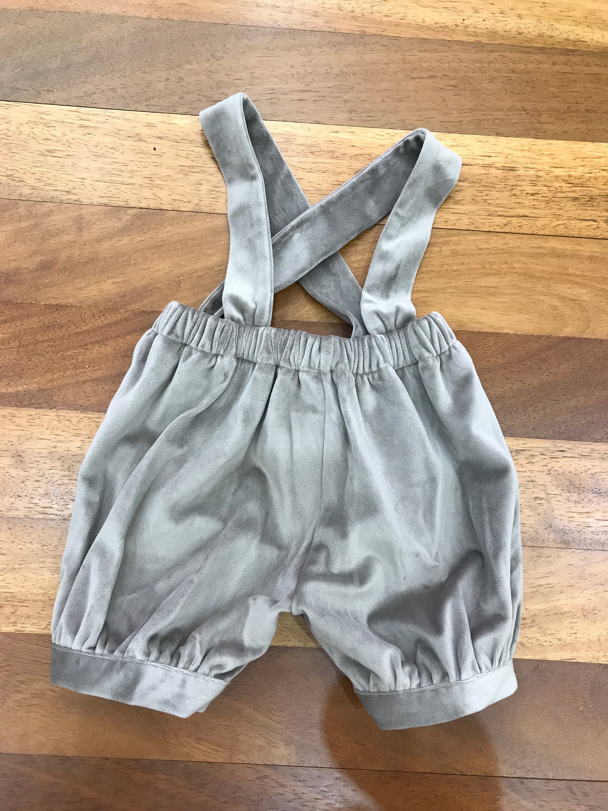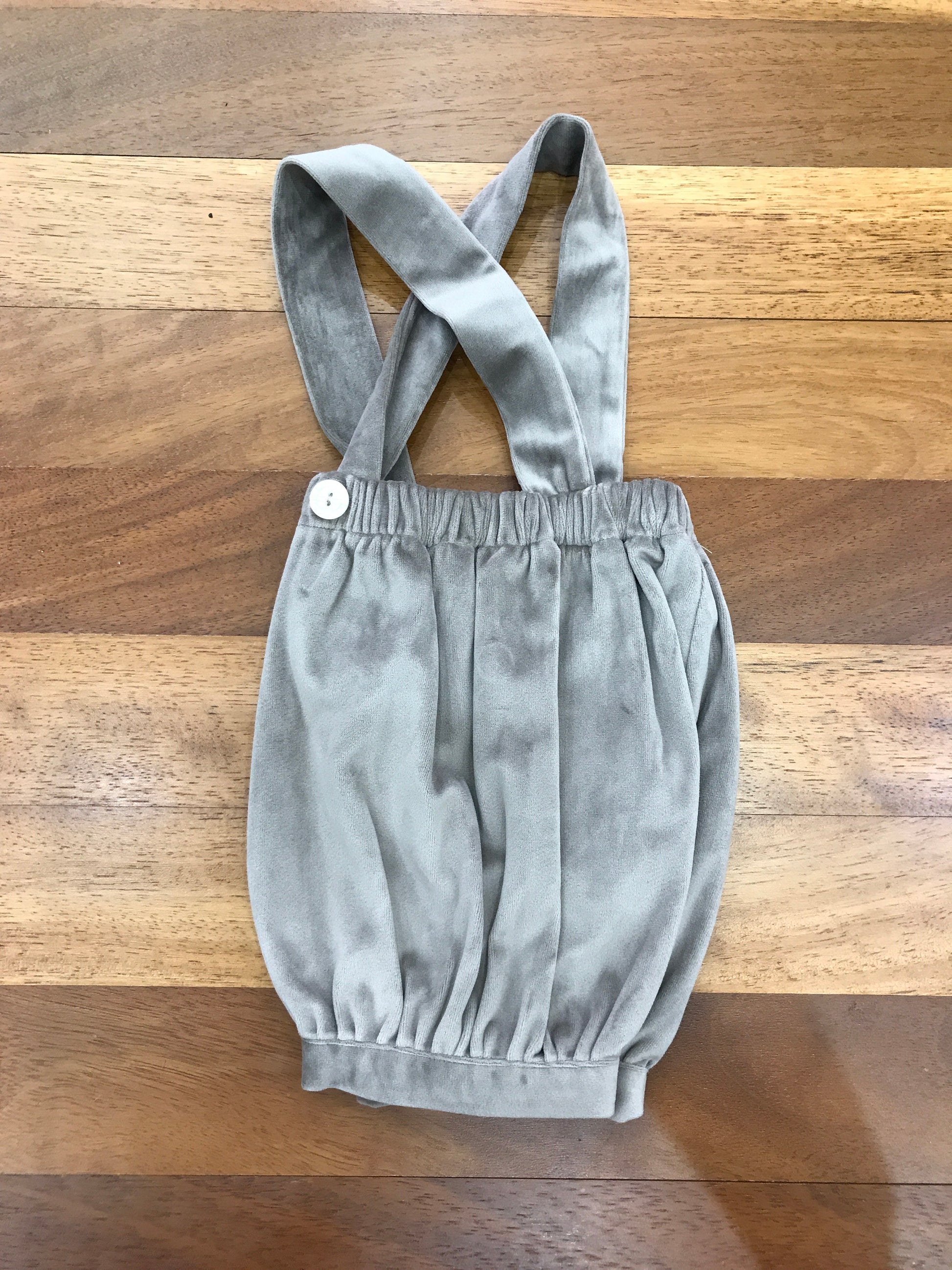 Salopette in velluto di colore tortora, dotata di polsini alle caviglie, elastico in vita e bretelle regolabili per una vestibilità personalizzata.