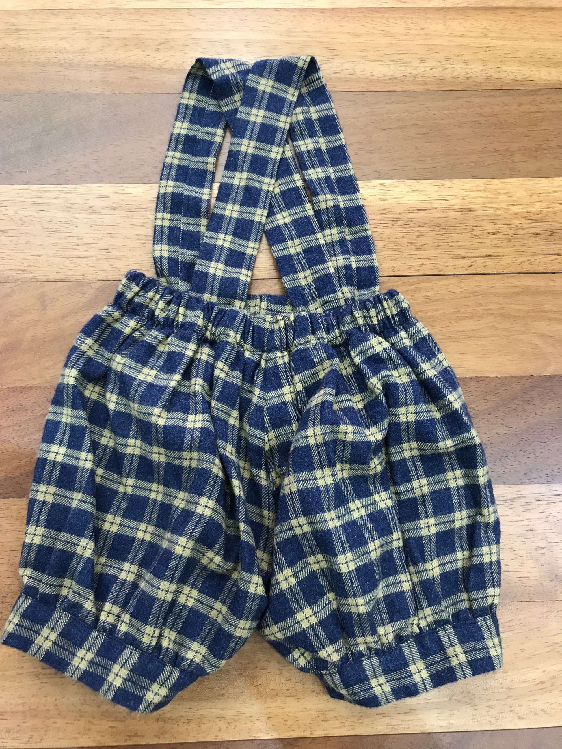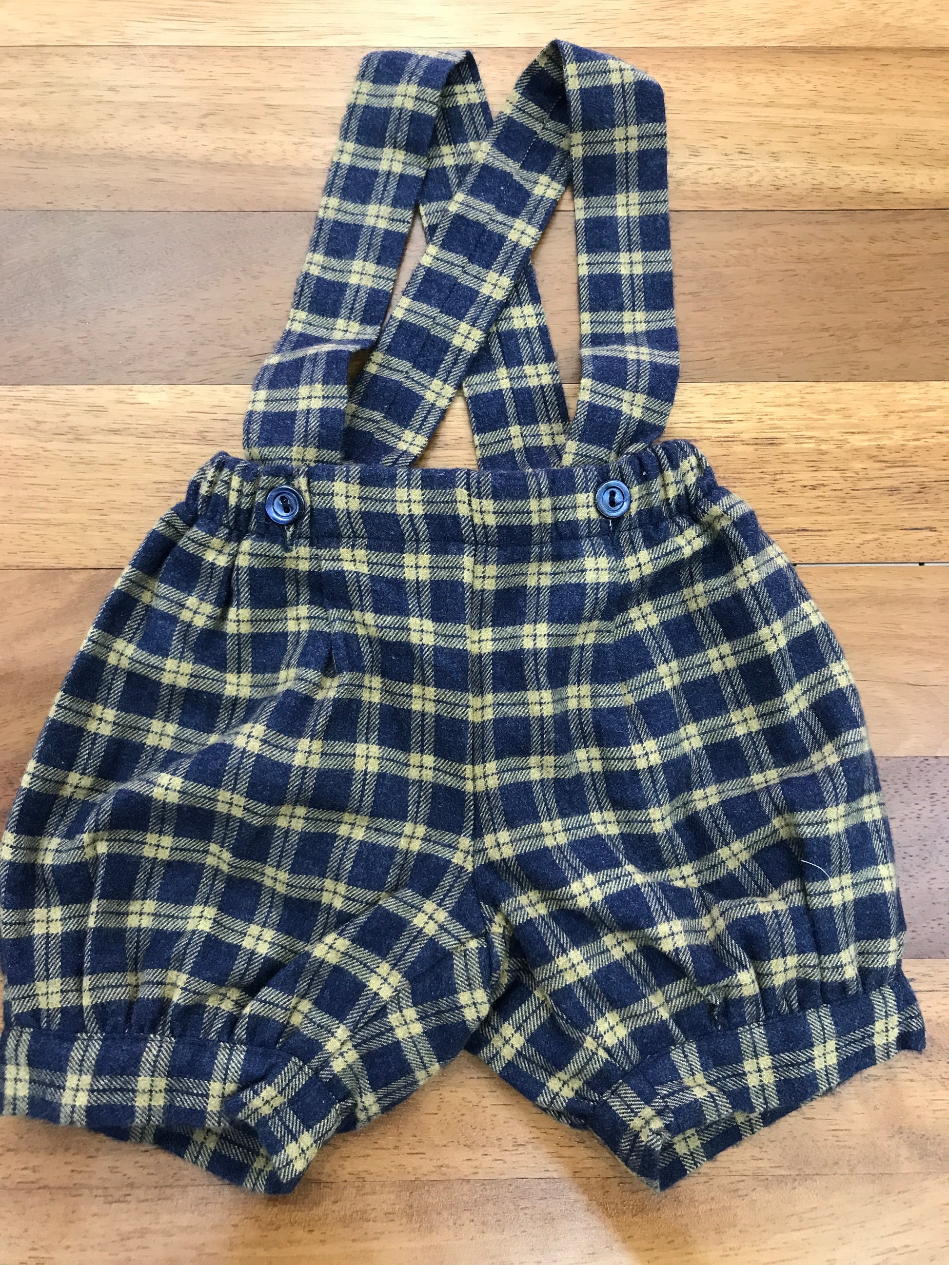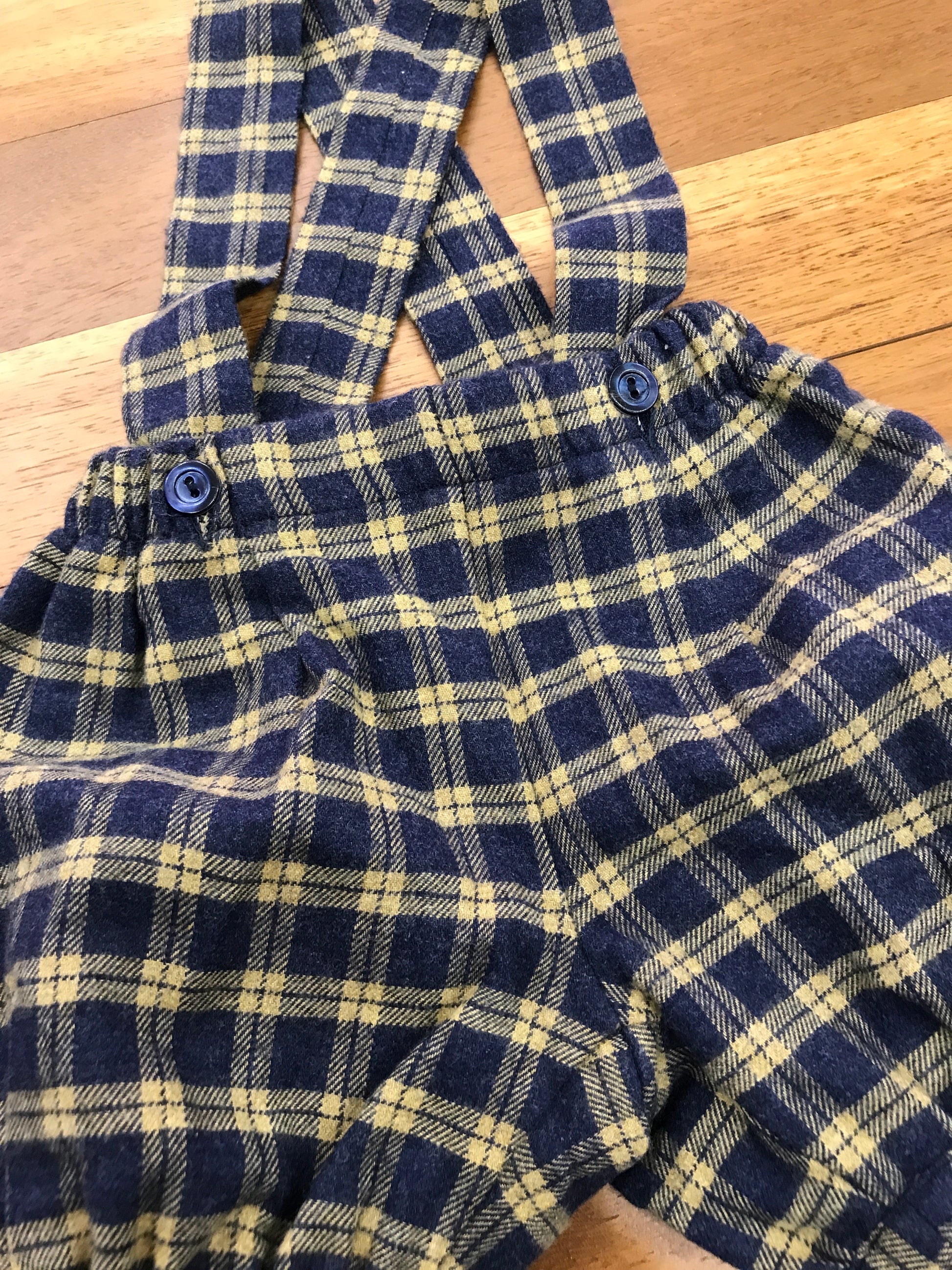 Questa salopette presenta un colore blu scuro arricchito da motivi scozzesi gialli. È dotata di porta molla posizionato alla fine della gambina e di spalline regolabili tramite due piccoli bottoncini per una vestibilità precisa.