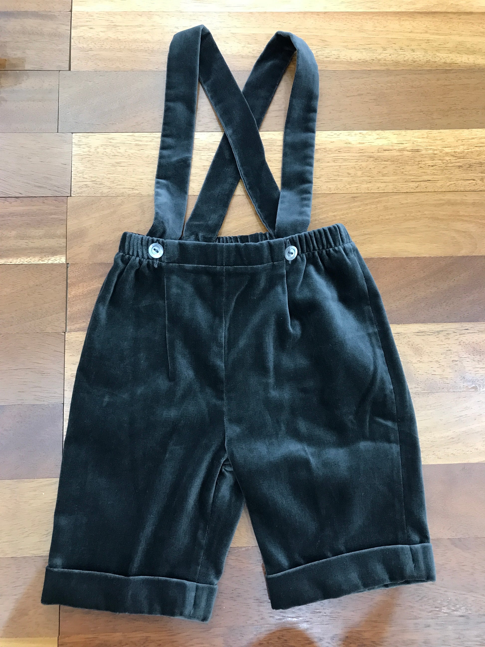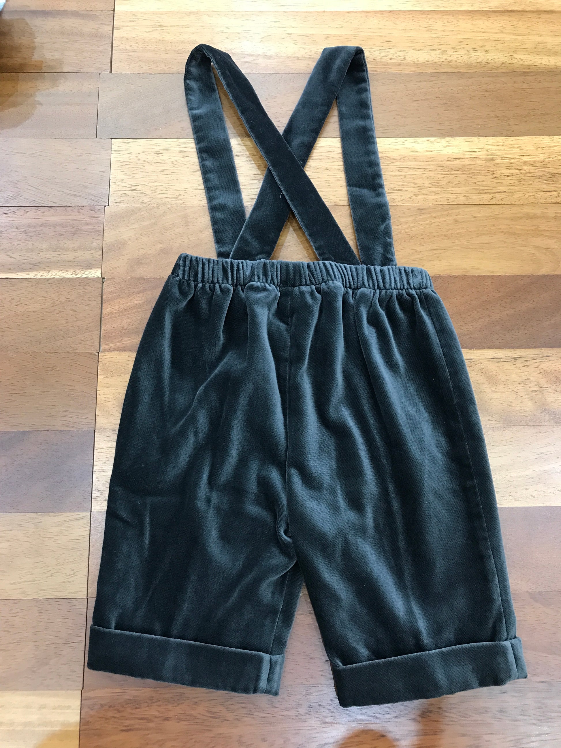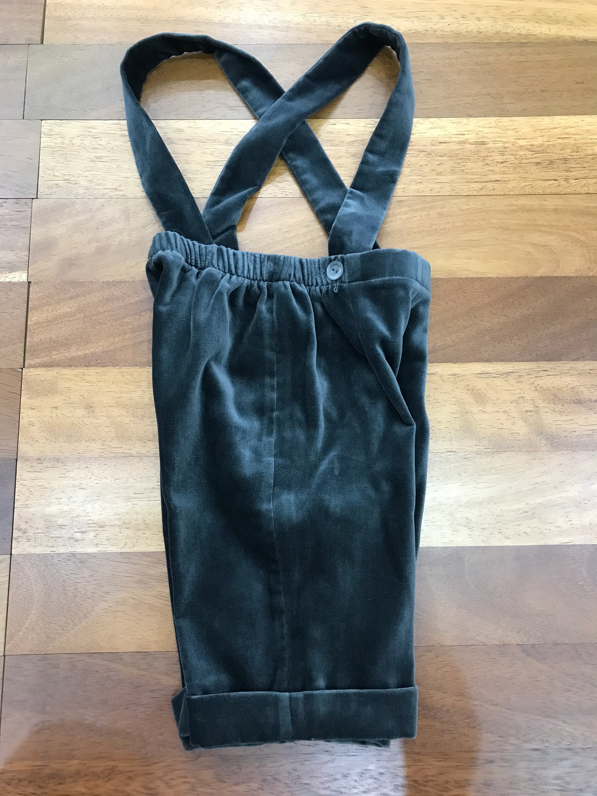 Salopette in velluto di un raffinato grigio scuro, dotata di polsini alle caviglie, vita elasticizzata per una vestibilità confortevole e bretelle regolabili per adattarsi perfettamente.