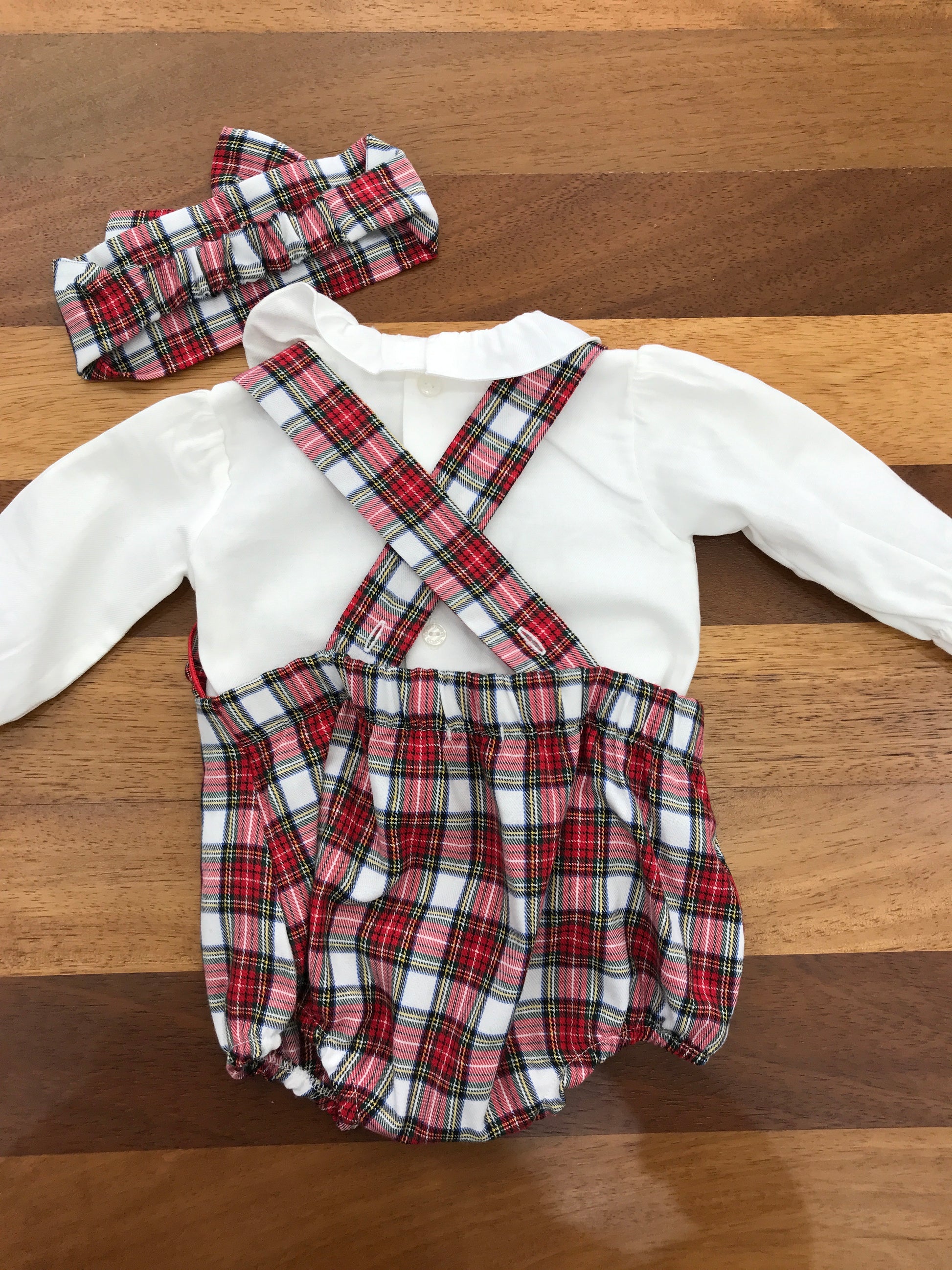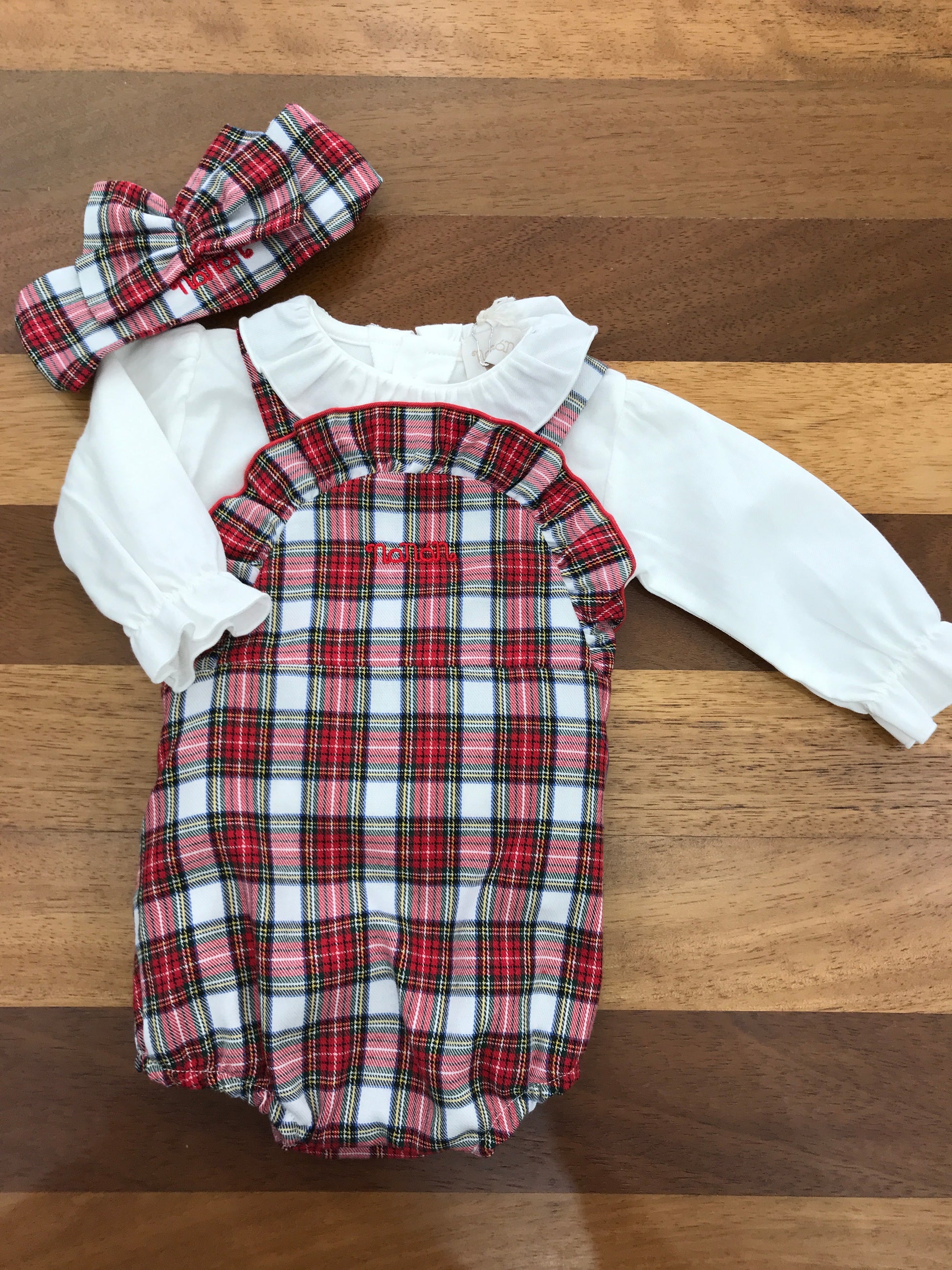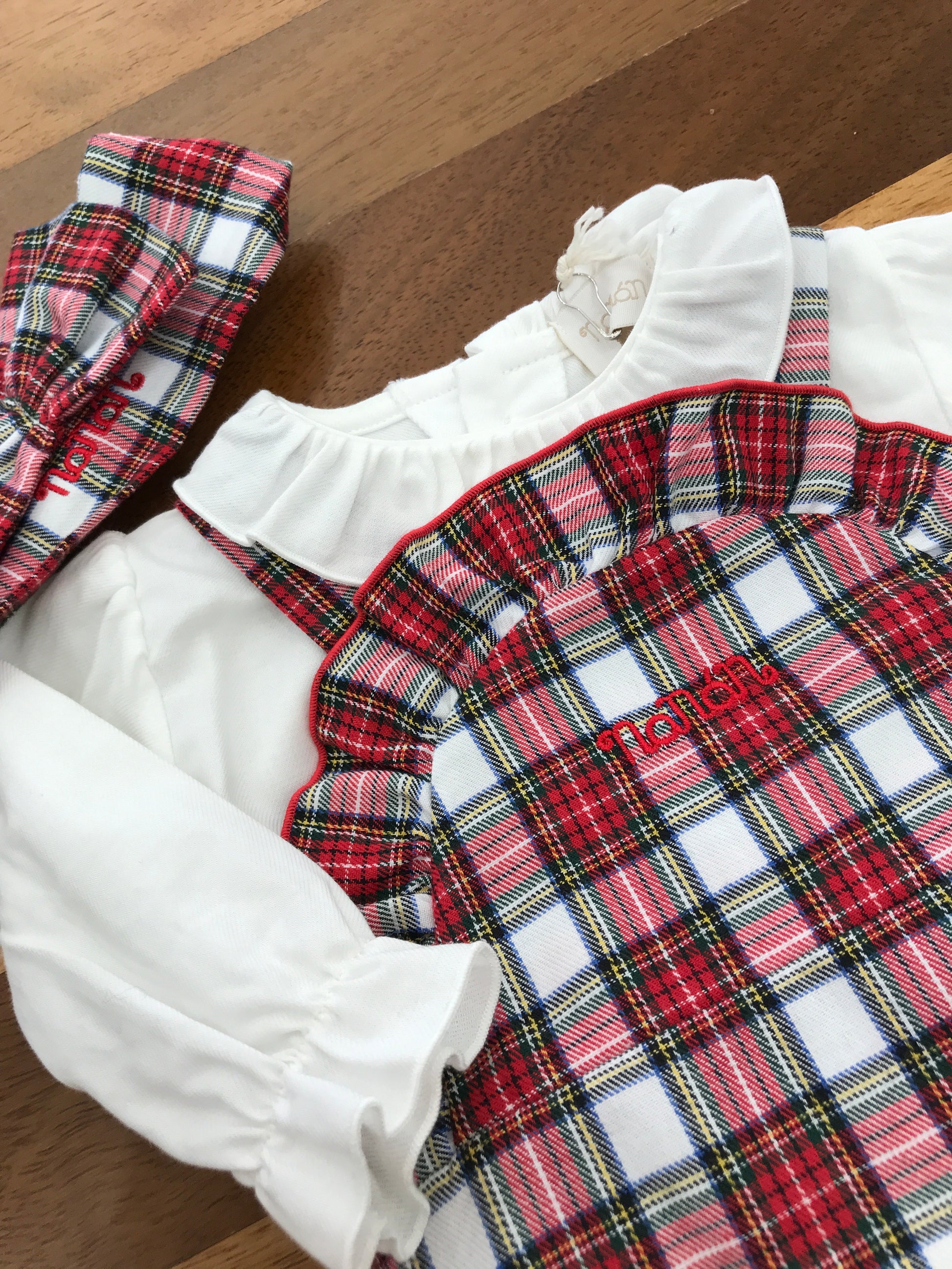 Questo delizioso set bipartito combina una camicetta bianca con colletto a smerlatura e maniche arriciate con una salopette in tessuto a quadri scozzese. Un abbinamento sofisticato che unisce dettagli raffinati e un design classico, perfetto per creare look versatili e coordinati con facilità.