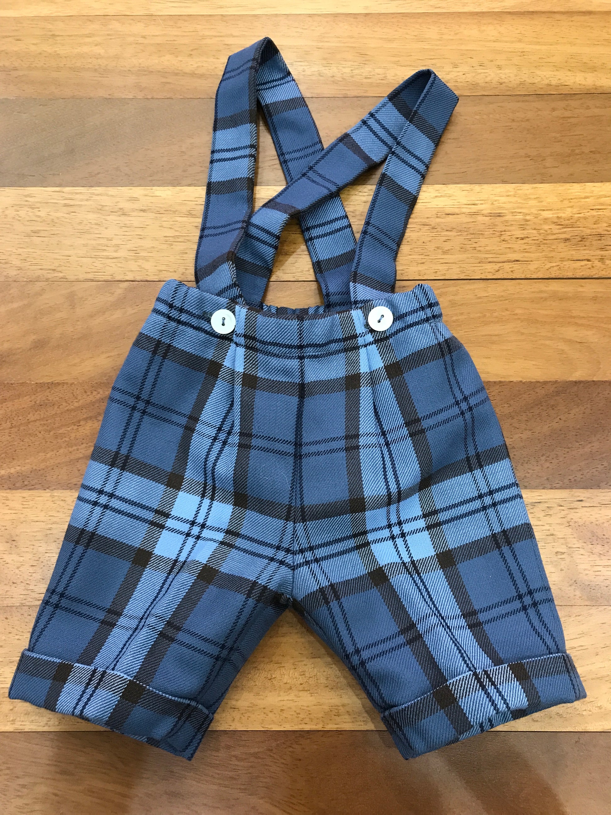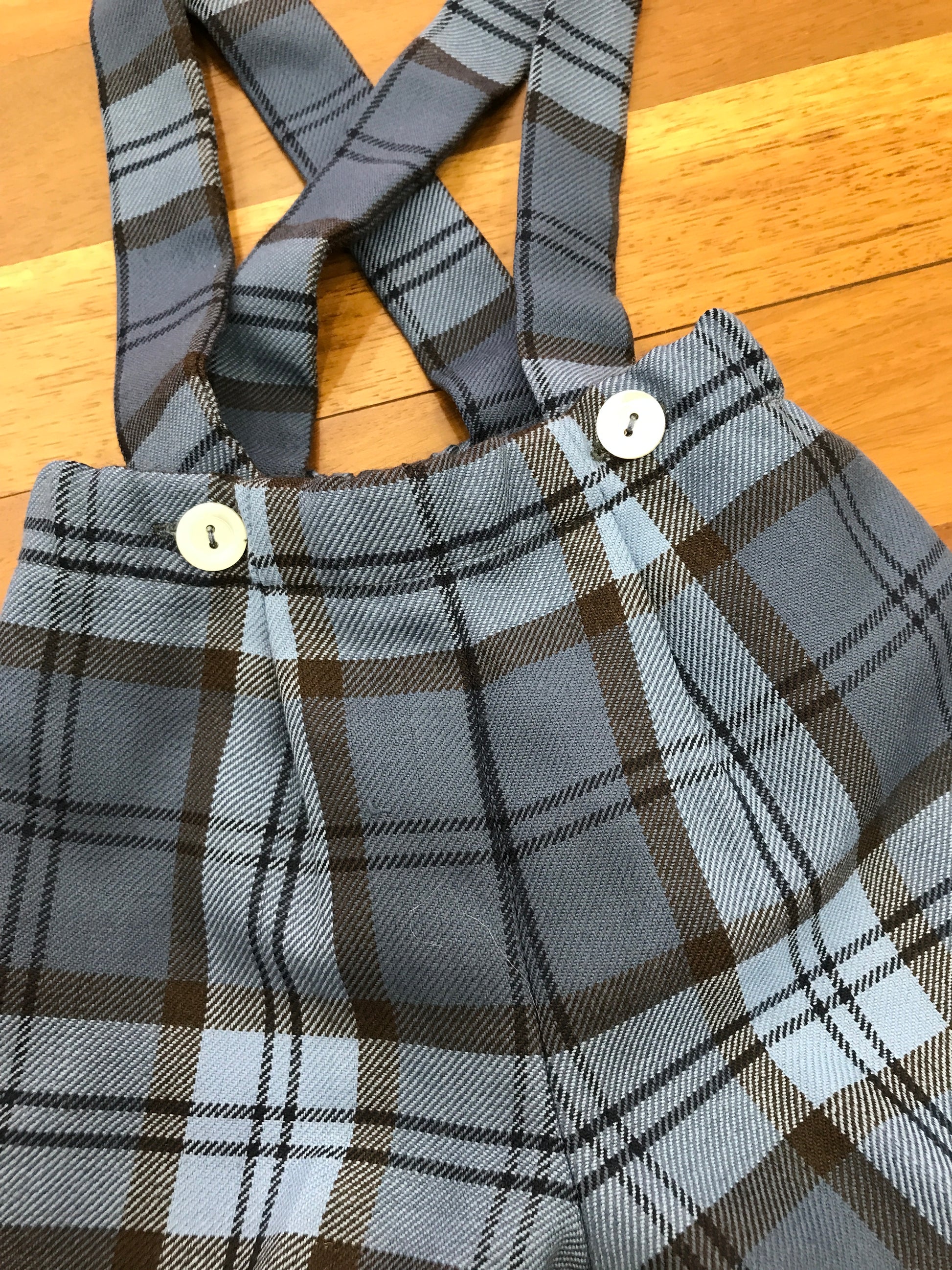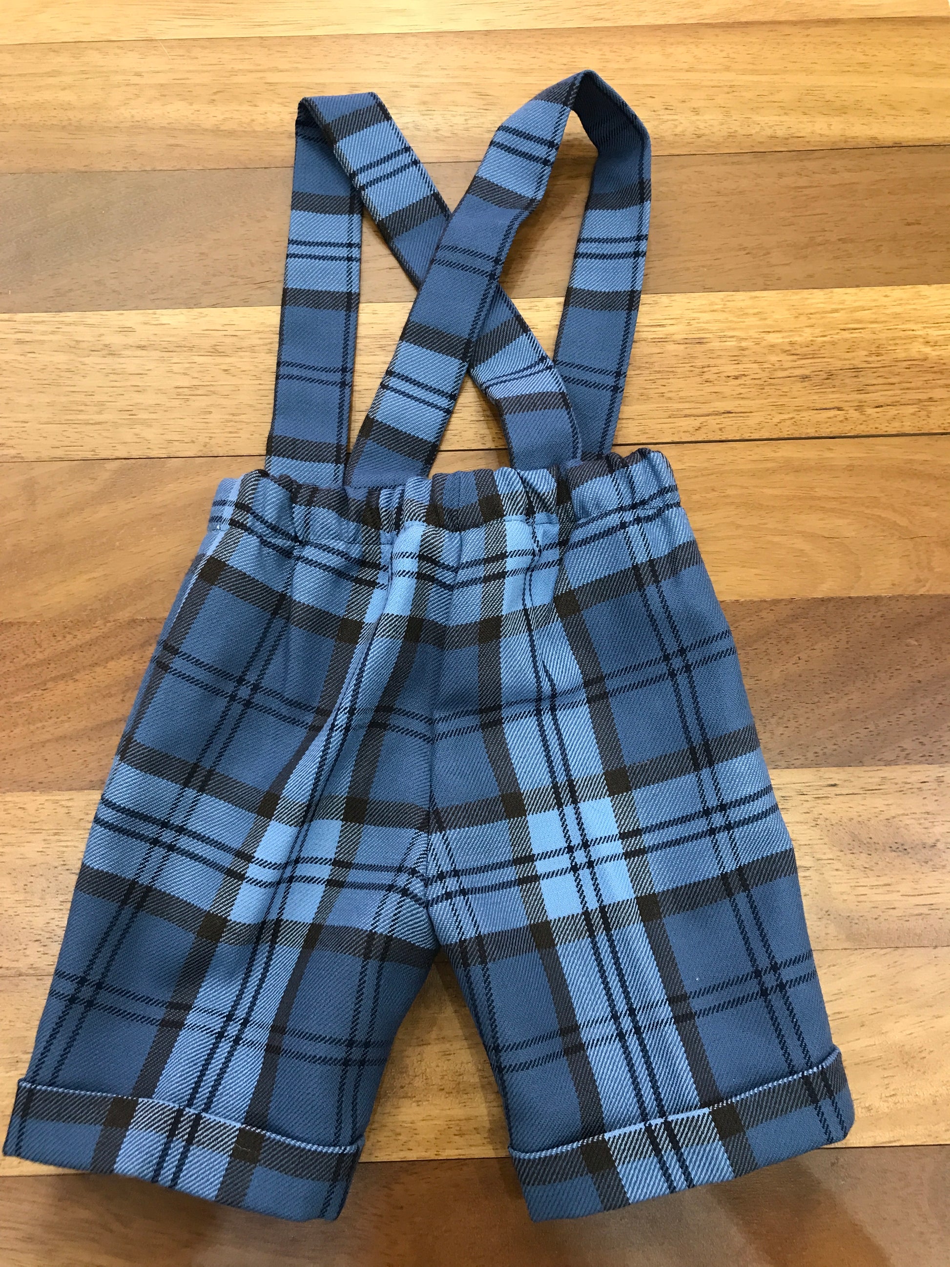Salopette realizzata in panno di colore bluette tenue, arricchita da dettagli scozzesi. Presenta bretelle regolabili con bottoncini e un elastico in vita per una vestibilità comoda e personalizzata.